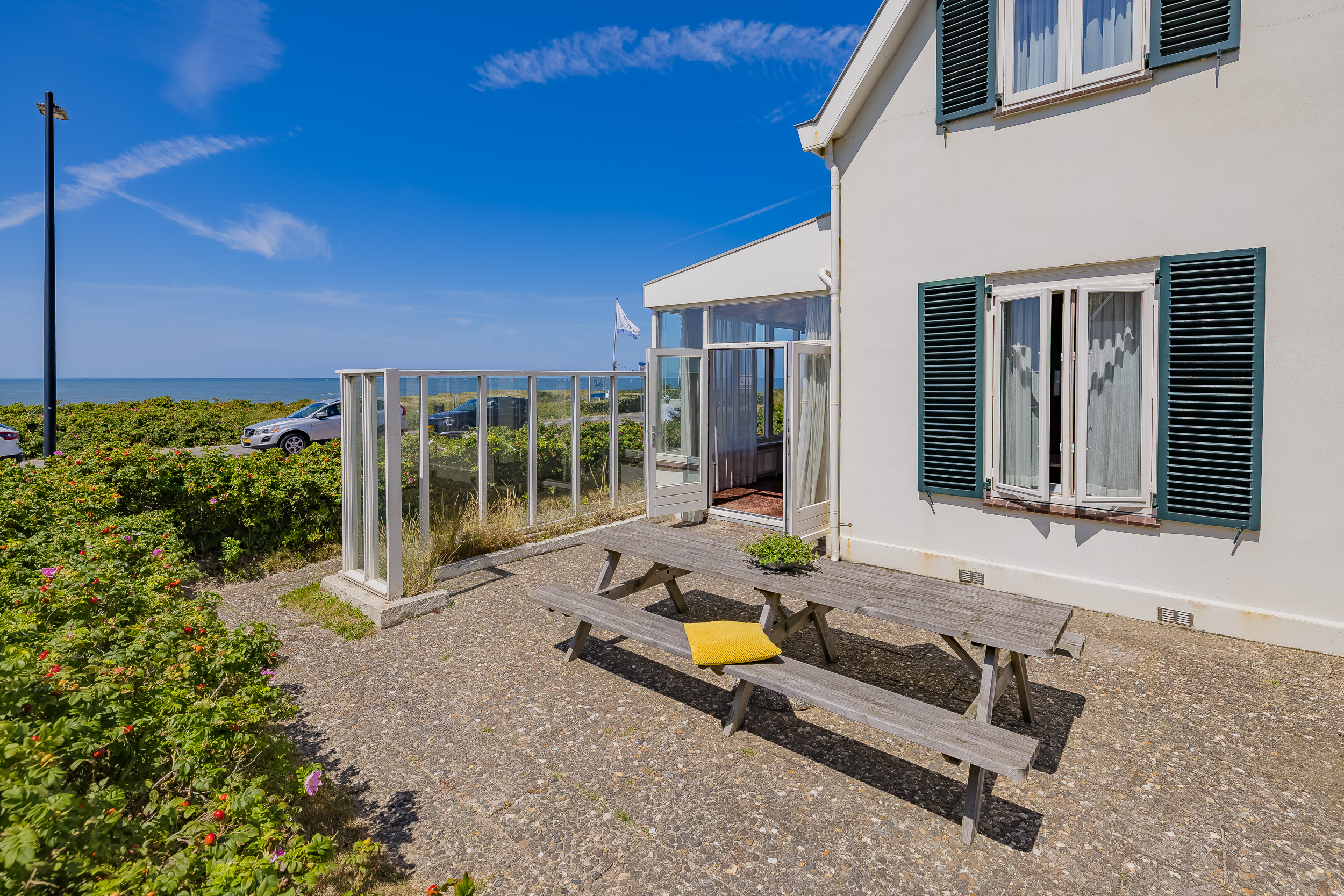 The kitchen, equipped with built-in appliances, is practically furnished with plenty of cupboard space. Furthermore, on the ground floor, you will find a bright second living room with a gas fireplace, ideal for relaxation or as a spacious study. In addition, the ground floor has a comfortable bedroom with a built-in wardrobe. The spacious, sunny south-facing terrace is accessible from both living rooms. The bathroom in the hall is ideal for rinsing off the sand after a day at the beach.