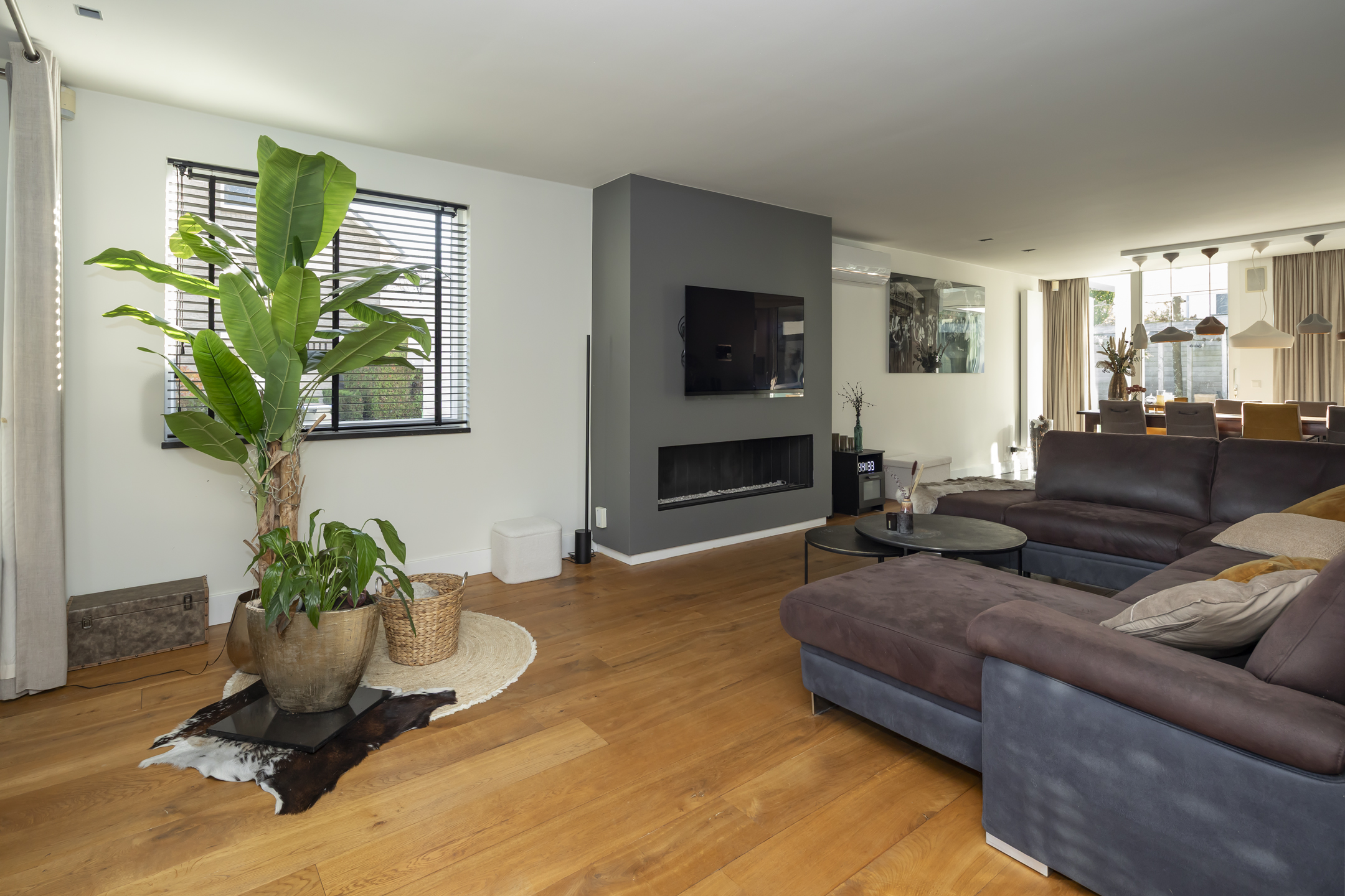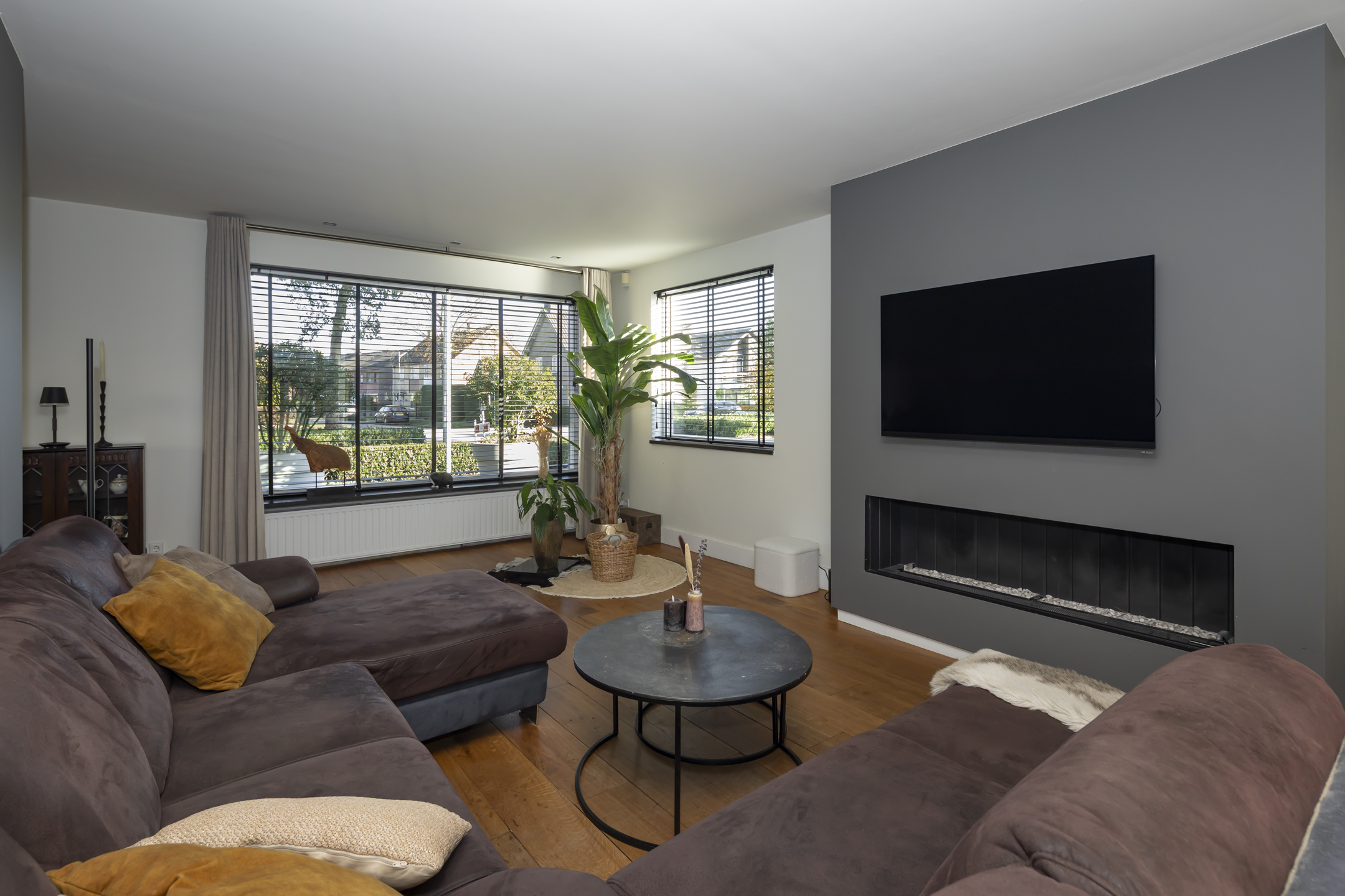 The inviting, wide gas fireplace takes center stage in the living room. The living room has beautiful wooden flooring, and like all the other rooms, it's neatly plastered.