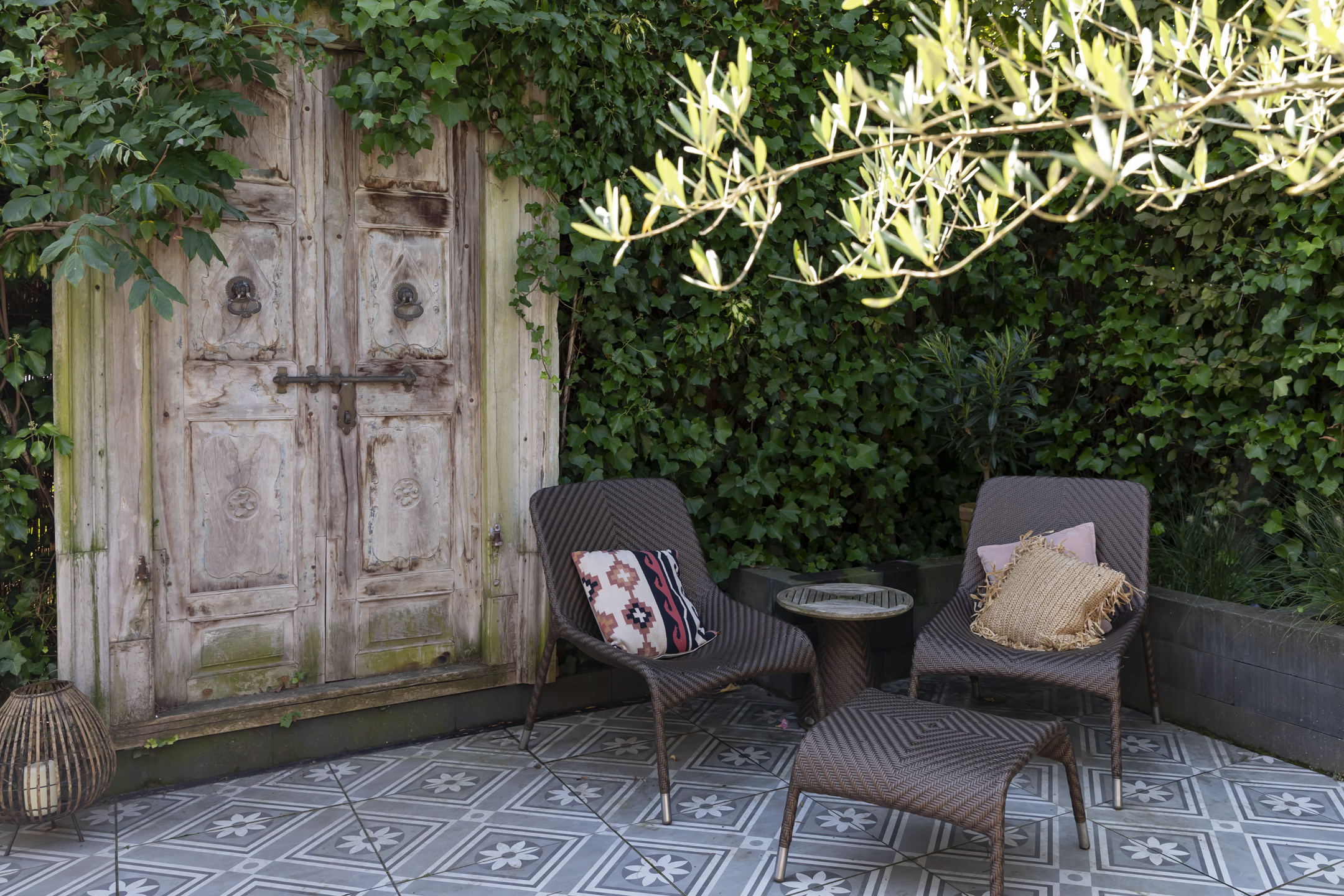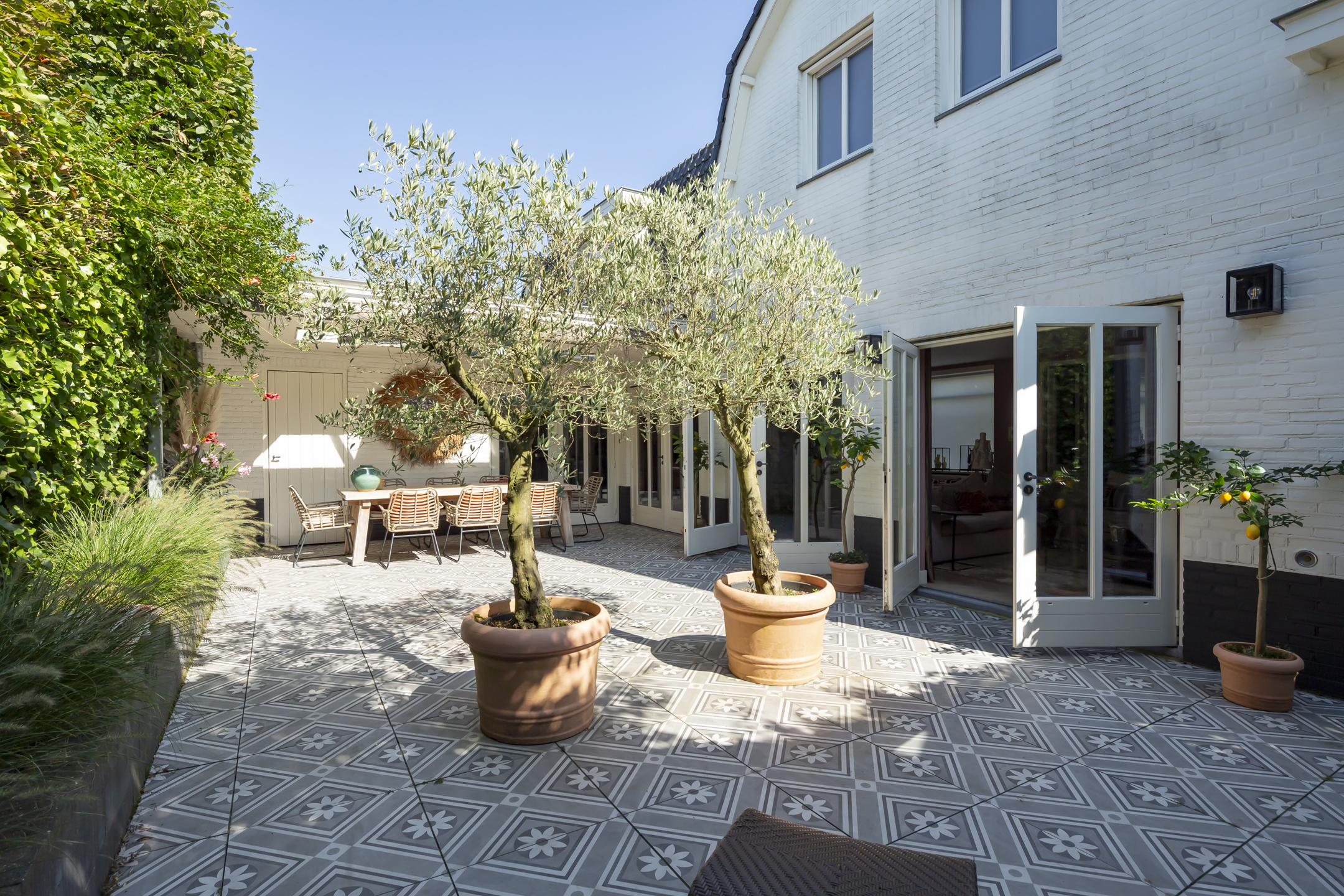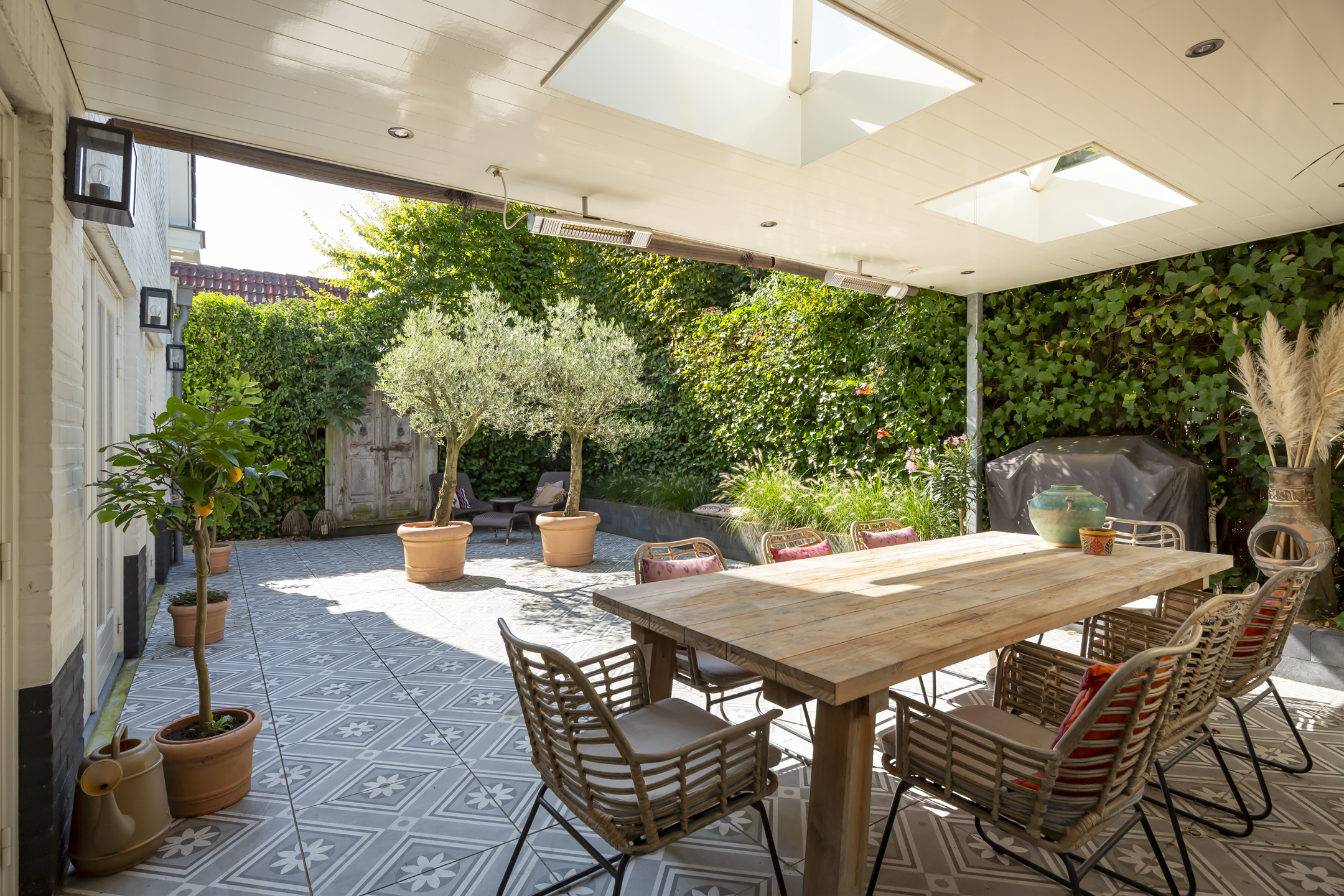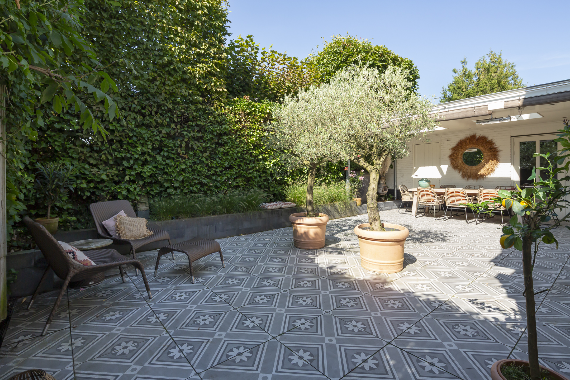 Deze unieke woning heeft niet één maar twee tuinen. De patio/stadstuin heeft een ruim overdekt terras en is voorzien van 2 grote lichtkoepels. Het hele jaar door is het hier goed vertoeven. Er ligt een mooie bestrating in, en met de aankleding van fraaie potten geeft het deze beschutte tuin een mediterraan sfeertje.