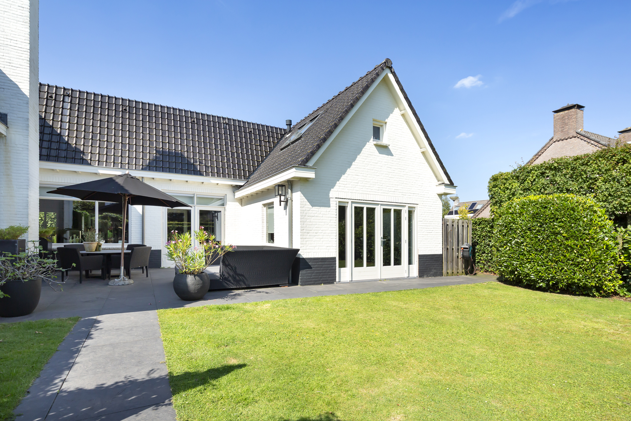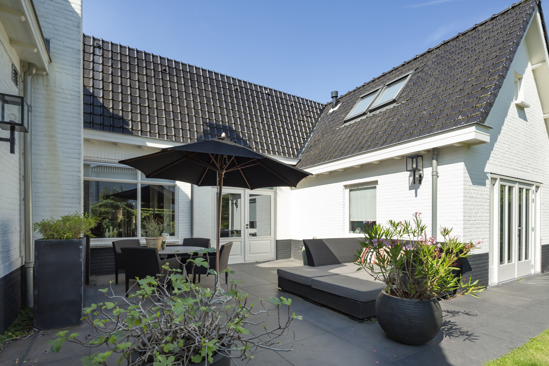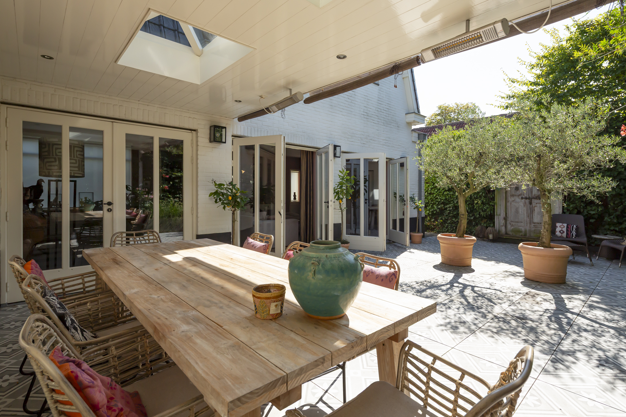 Met de openslaande deuren in de woonkamer naar de patiotuin is er een fijne verbinding met buiten.