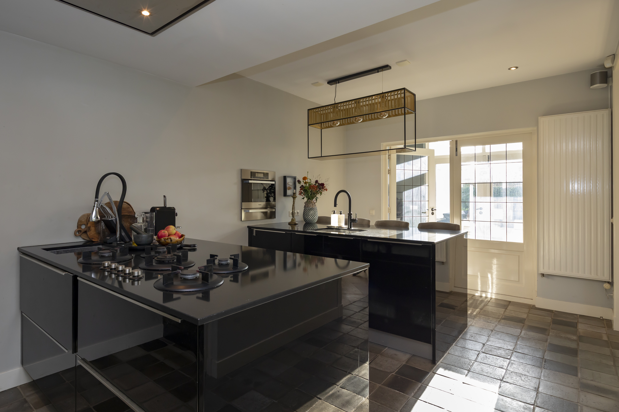 Houd je van koken én van gezelligheid? Dan past deze keuken perfect bij jou. Terwijl je namelijk aan het koken bent, kun je ondertussen ook gezellig borrelen met je vrienden die bij je in de keuken aanschuiven. Je zult zien, bij feestjes is het hier altijd ’n geliefde plek. De luxueuze keuken is voorzien van diverse inbouwapparatuur van Miele waaronder een stoomoven, een oven, een vaatwasser, een koelkast met ice crusher, een vriezer, een 5-pits gaskookplaat en een Quooker.