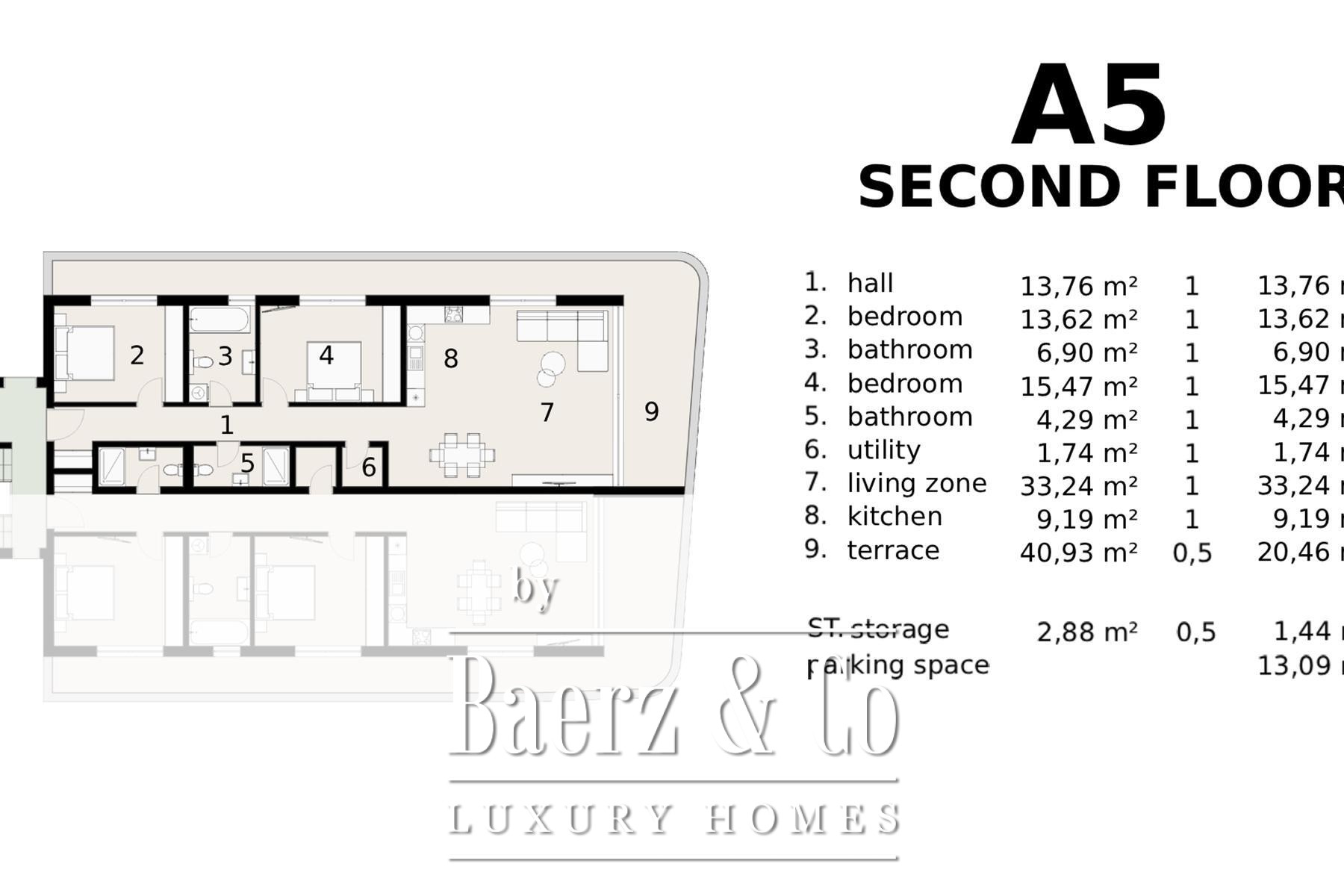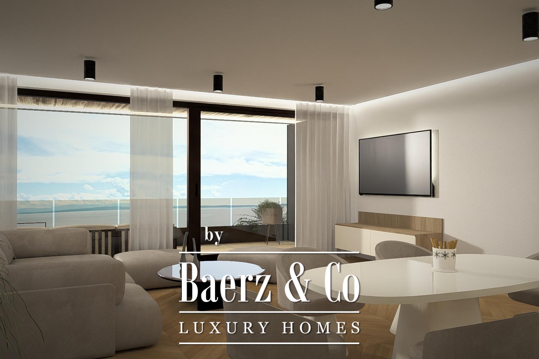 The open-plan living room seamlessly connects with the kitchen and dining area, unfolding onto a large 40,93 m² terrace that frames remarkable views of the sea. Two spacious bedrooms and two modern bathrooms are complemented by practical features including an entrance hall, storage room, and two garage parking spaces in the underground garage.