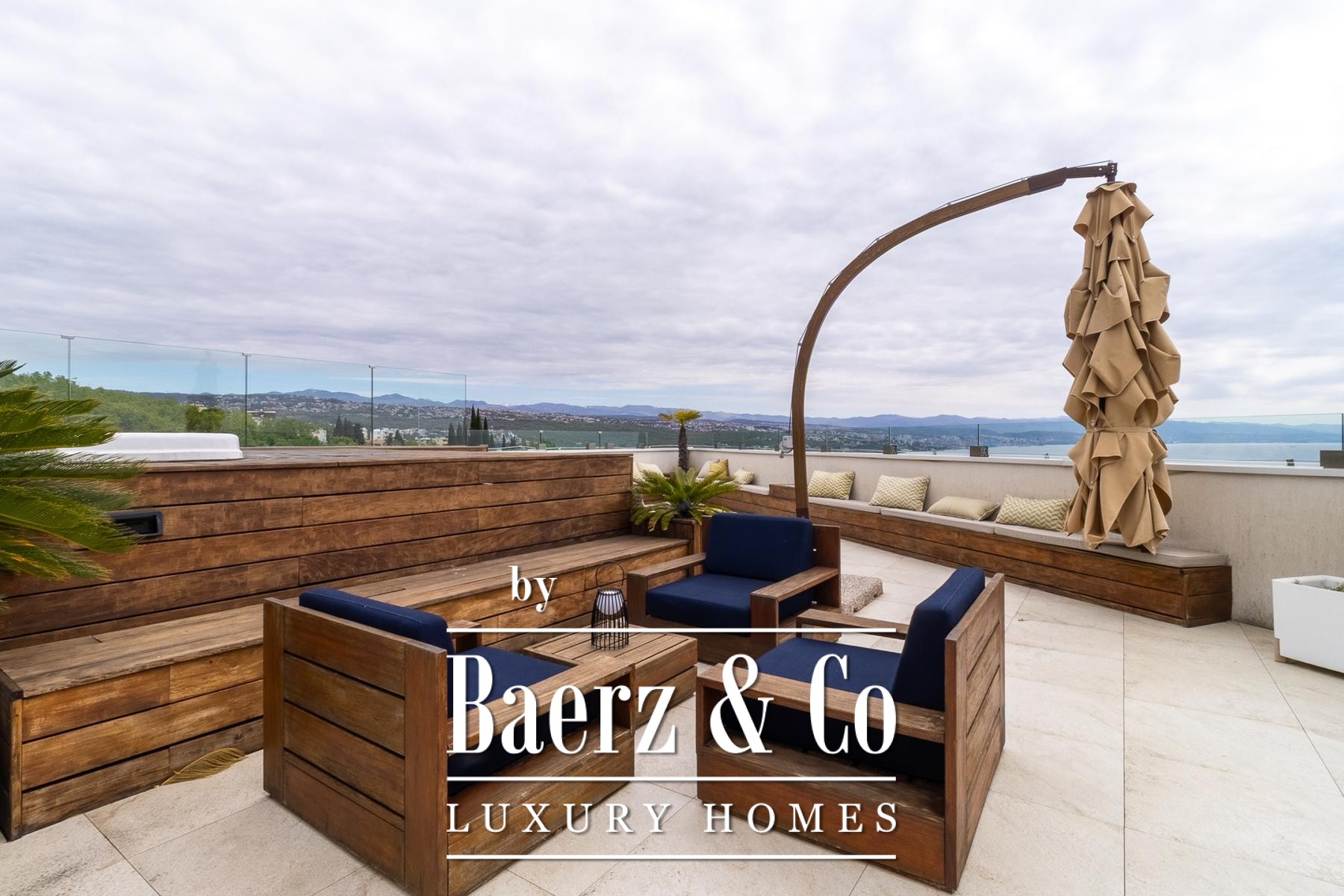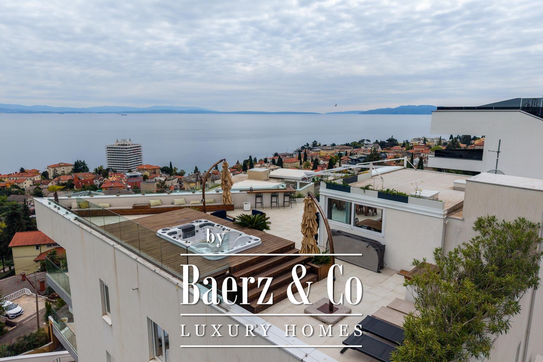 Luxury penthouse Opatija is set just 490 meters from the sea, encompassing an impressive 267 m² of refined living space in a modern building. The property offers four bedrooms and four bathrooms, each thoughtfully designed to embody understated luxury and contemporary comfort. An expansive open-plan living room, kitchen, and dining area anchor the interior, accompanied by a study, two walk-in wardrobes, utility space, and additional circulation zones for seamless everyday living.