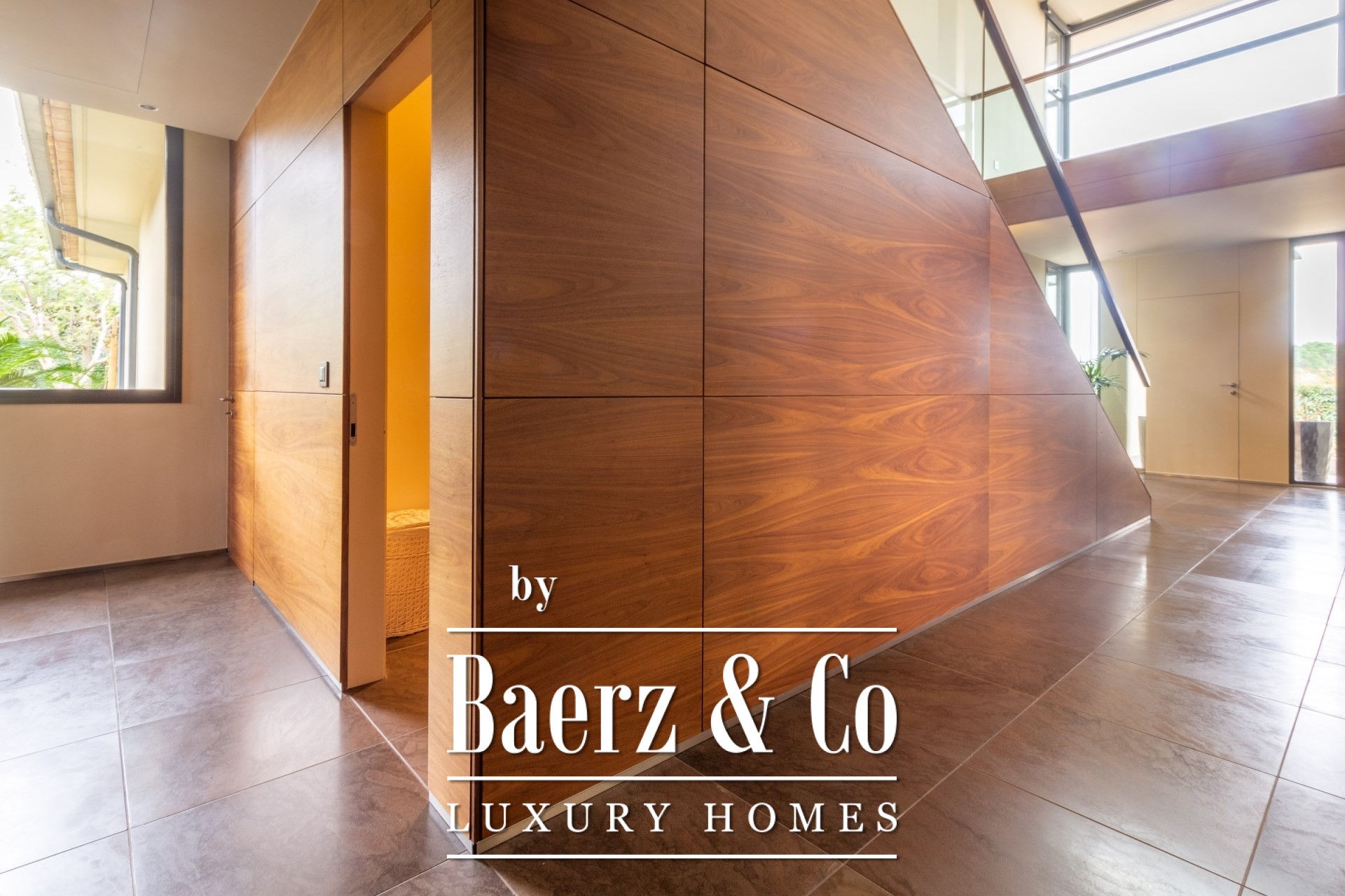 Entering through the spacious hall, the main level opens seamlessly to a vast living and dining room, suffused with natural light and framed by open garden and pool vistas. A reading alcove with fireplace invites quiet reflection. The kitchen is distinct for its high-end appliances and pristine finishes, designed for culinary precision. Two en-suite bedrooms on the ground level offer both privacy and ease, complemented by a guest bathroom and a dedicated office.