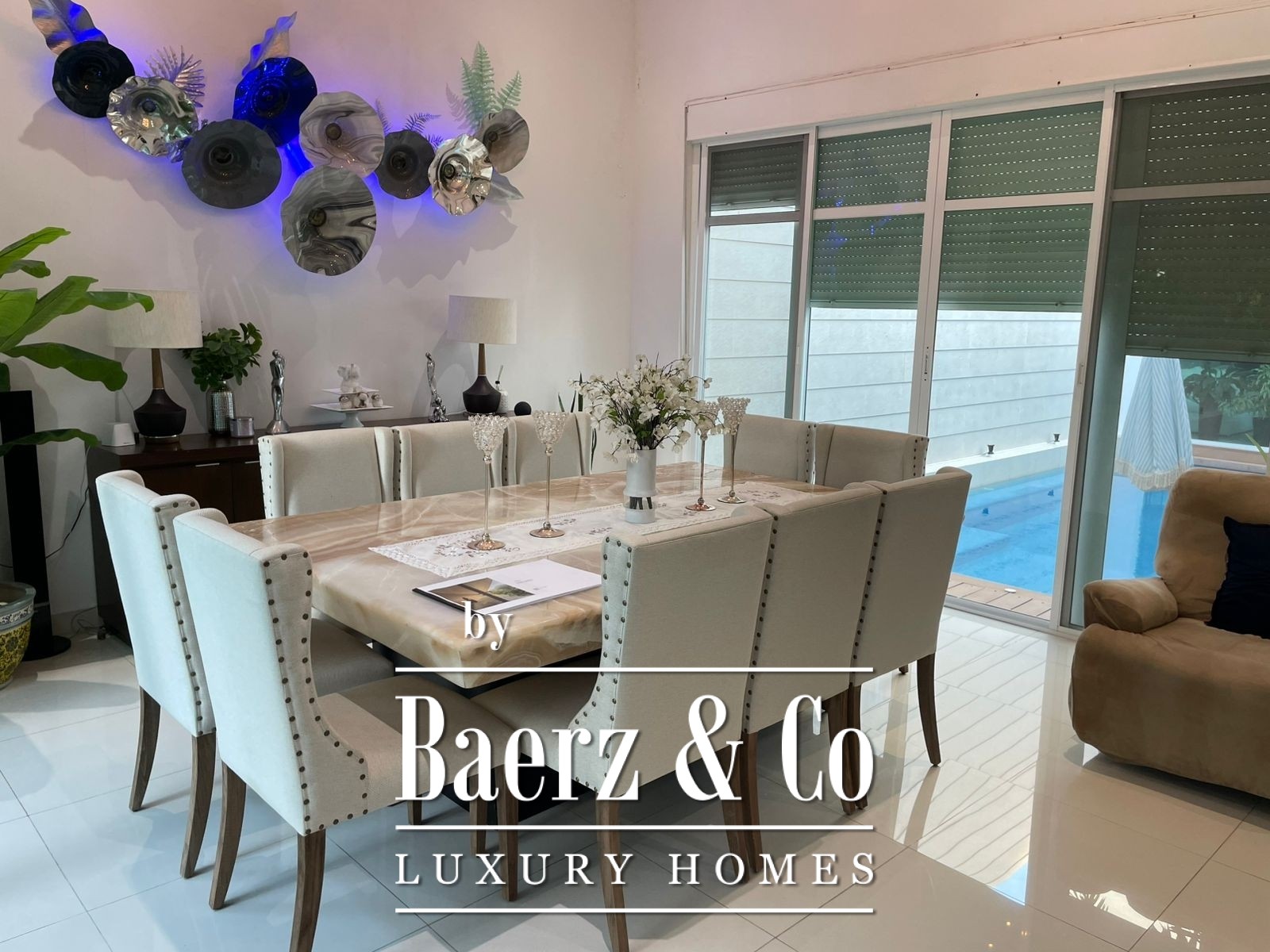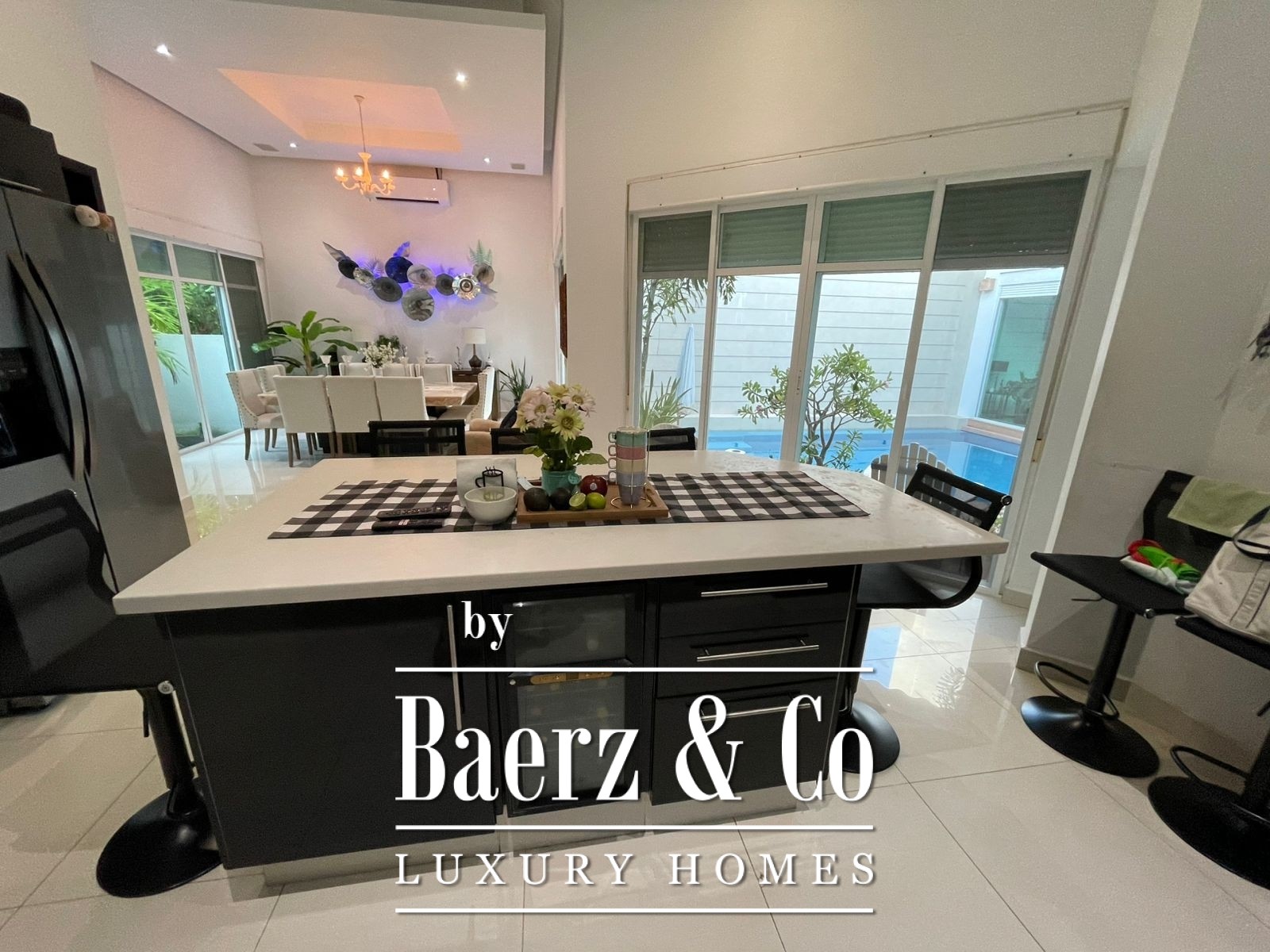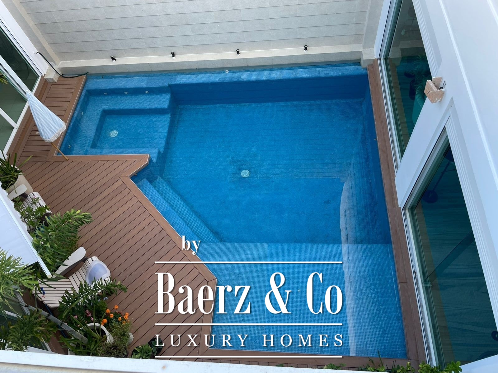The four-bedroom villa offers five bathrooms, each marked by discreet premium finishes. Light plays across a private swimming pool, terrace, and waterfall feature, while a rooftop retreat invites moments of quiet or convivial gathering. The dedicated art room and service quarters foster seamless living, complemented by ample parking and a laundry room.