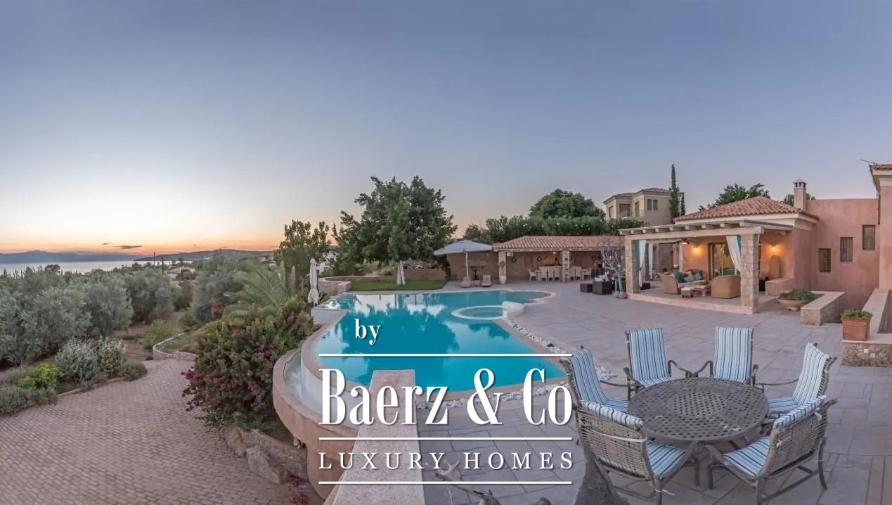 Outdoors, a large swimming pool, dining and sitting zones, BBQ area, and manicured gardens create a private Mediterranean sanctuary. Parking for four vehicles and mature landscaping further heighten the sense of calm and seclusion. This luxury villa for sale in Porto Heli stands as a rare expression of exclusivity and timeless design in one of Europe’s most treasured coastal settings.