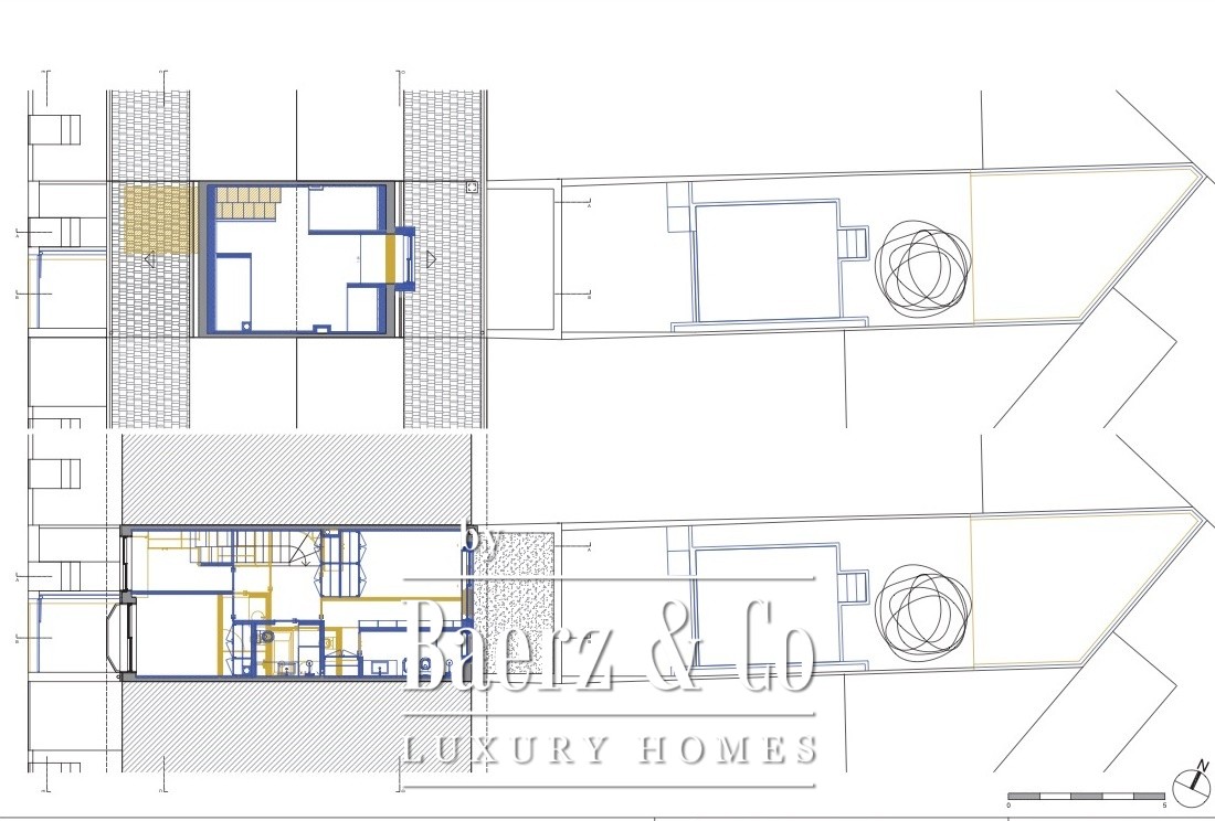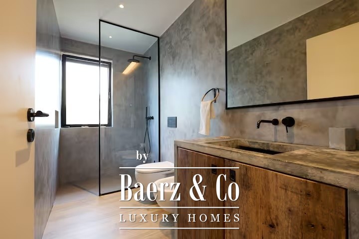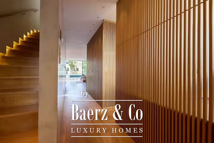 Upstairs, two bedrooms each feature private balconies and integrated storage. The master suite incorporates an en-suite bathroom, while the second bedroom enjoys a dedicated bathroom nearby. The top floor provides a tranquil third bedroom and bathroom, suitable as a guest suite, office, or personal retreat. Each level ensures privacy and natural flow while retaining a quiet sense of distinction.