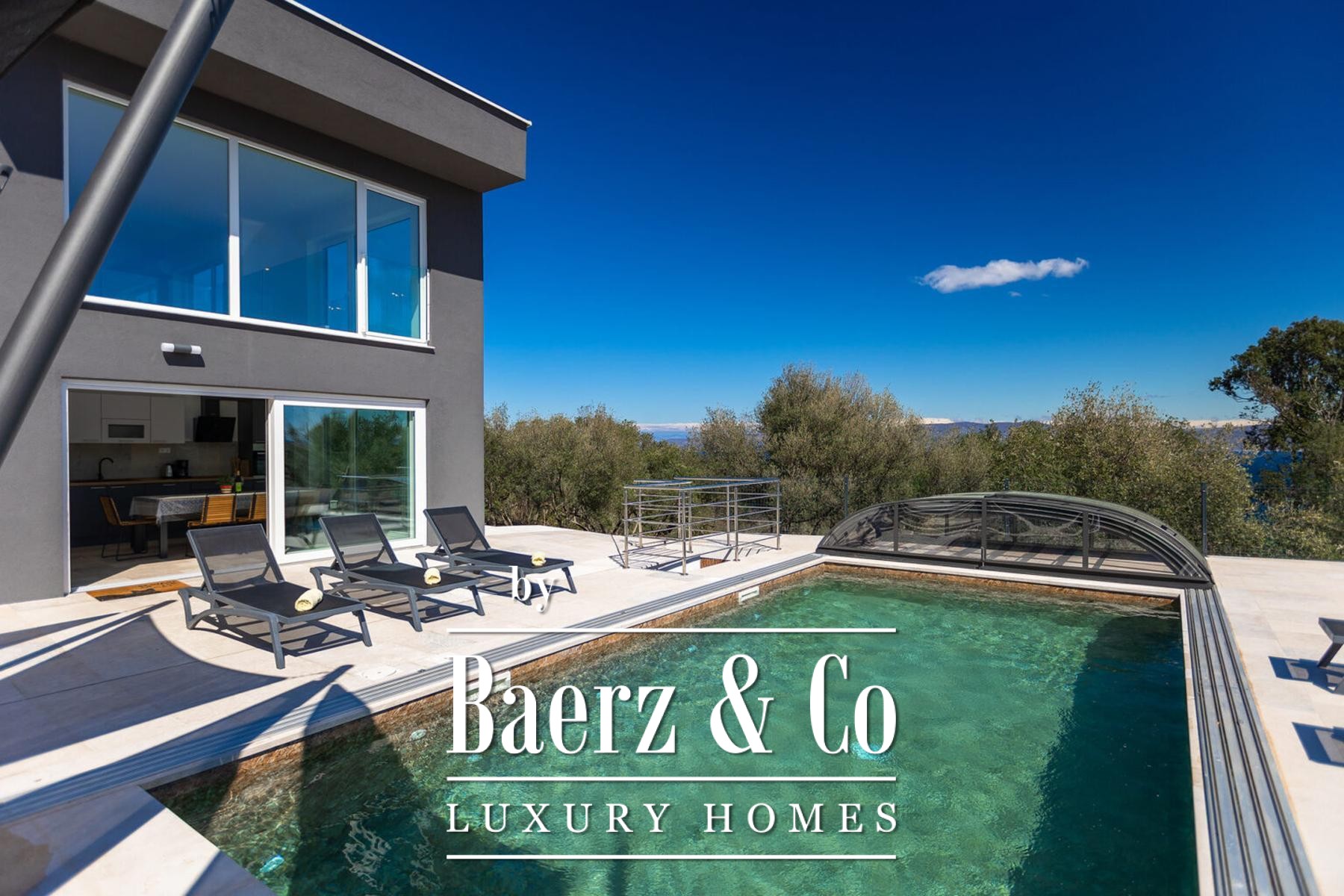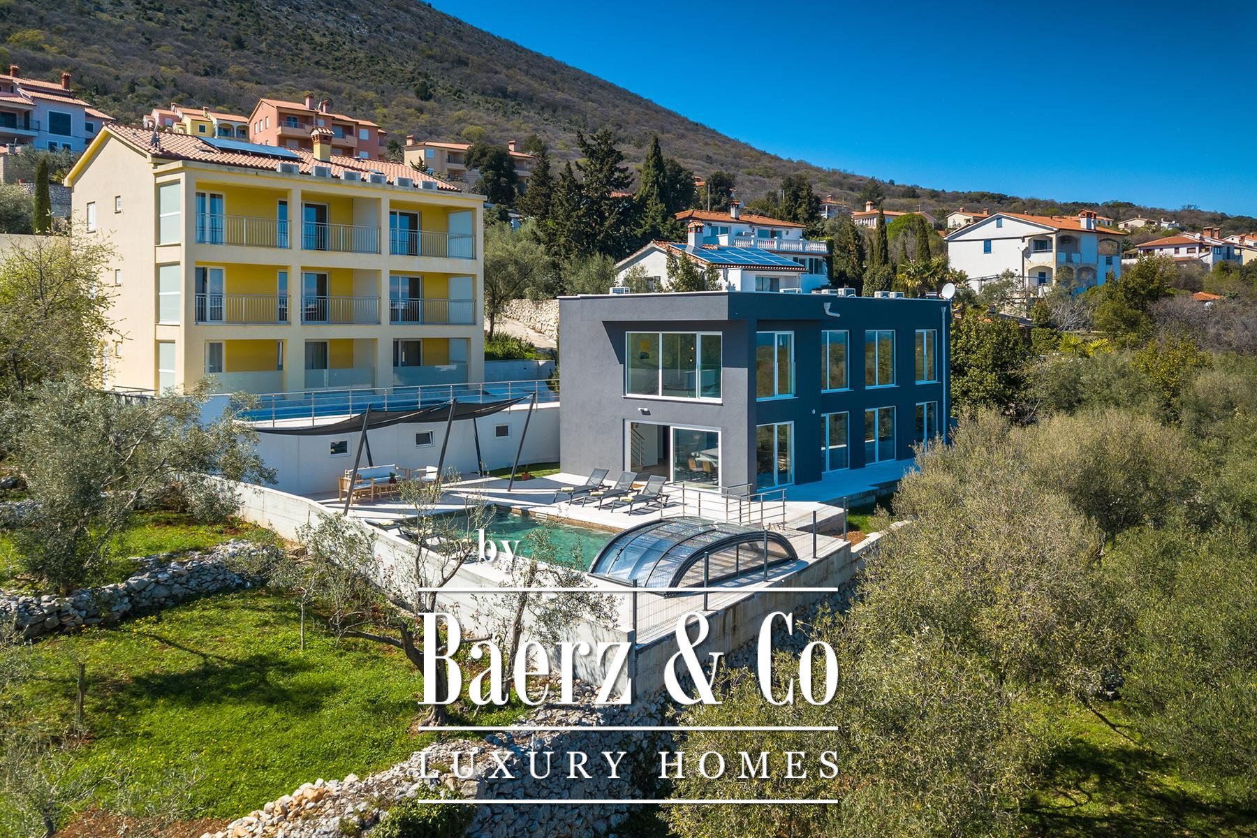 In the charming village of Ravni, which is only a few kilometers from the town of Labin, is located this impressive villa with a total living area of 200 m2 on a plot of 496 m2.The property is characterized by a modern design, and top quality materials were used in the construction, the interior itself highlights an open space with glass walls that provide constant natural light and a beautiful view of the sea from your future living room.The villa extends over two floors, ground floor and first