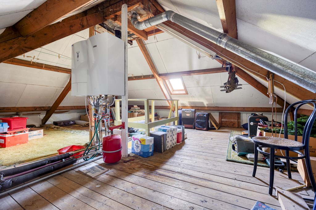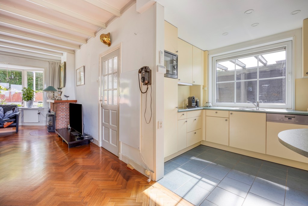 The house, built in 1932, spans 128 m² across three levels. Light fills the living room through wide windows, interacting with timber beams and a cozy fireplace, while sliding doors open directly to the southwest garden. The open-plan kitchen anchors family life with a spacious layout, L-shaped worktop, and essential appliances. A practical utility room and a flexible ground floor suite—with bedroom, bathroom, study, and direct garden access—invite single-level living or private retreat.