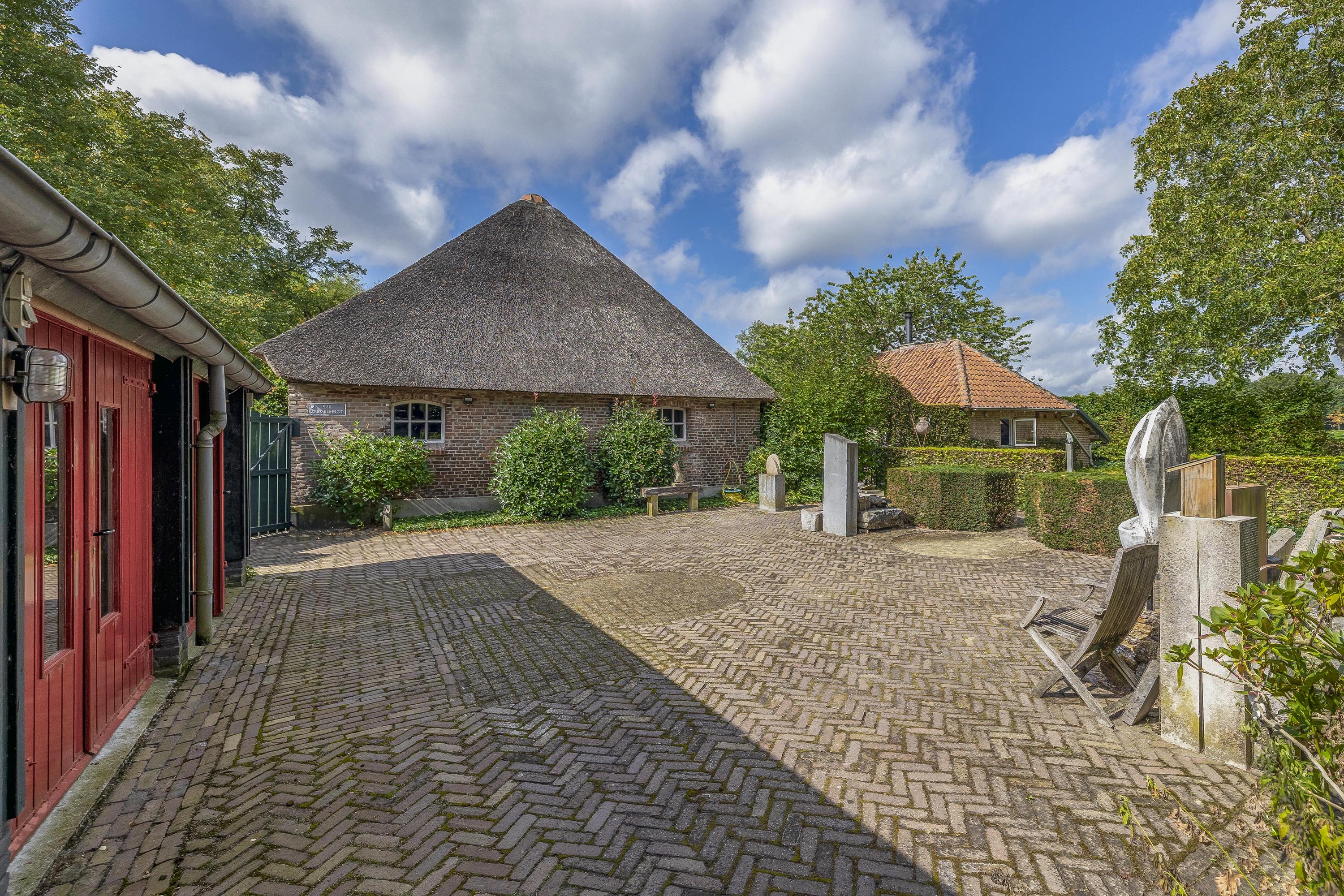 To the right of the farmhouse, you will find a second, large outbuilding in different segments: a detached double garage with storage room. This is accessible via a double gate from the driveway at the front and offers parking space for two cars. The outbuilding consists of two garage sections, equipped with two double doors, two large skylights, a concrete floor, and electrical facilities. It is a beautiful wooden barn with old wooden trusses, equipped with roof, cavity, and floor insulation and a wood-burning stove. The rightmost part of this outbuilding is another storage room. This storage area is also accessible via double doors at the front and also has a concrete floor and electricity. To the right of the barn, there is another wood storage area.