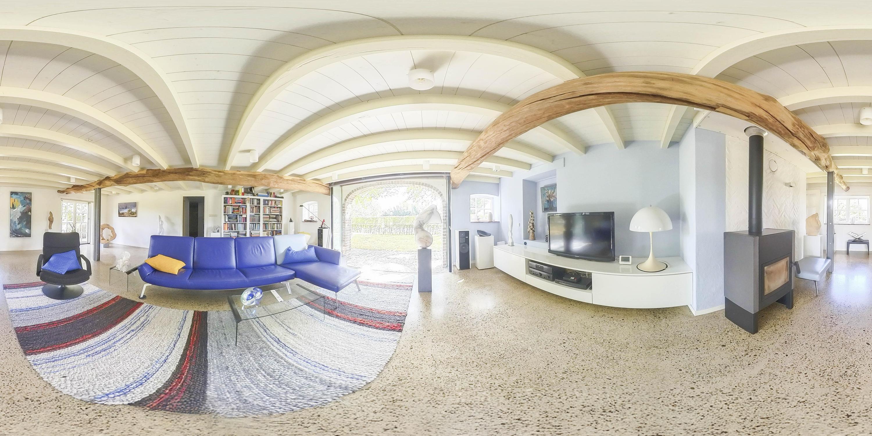 Double doors from the kitchen lead to the living room, which has a smooth, polished concrete floor with underfloor heating. The living room has stucco walls and a beautiful wooden beamed ceiling with attractive old oak beams. A large window at the front and double French doors at the rear offer a beautiful view of the garden. Here too, a wood-burning stove has been installed for extra warmth and cosiness.