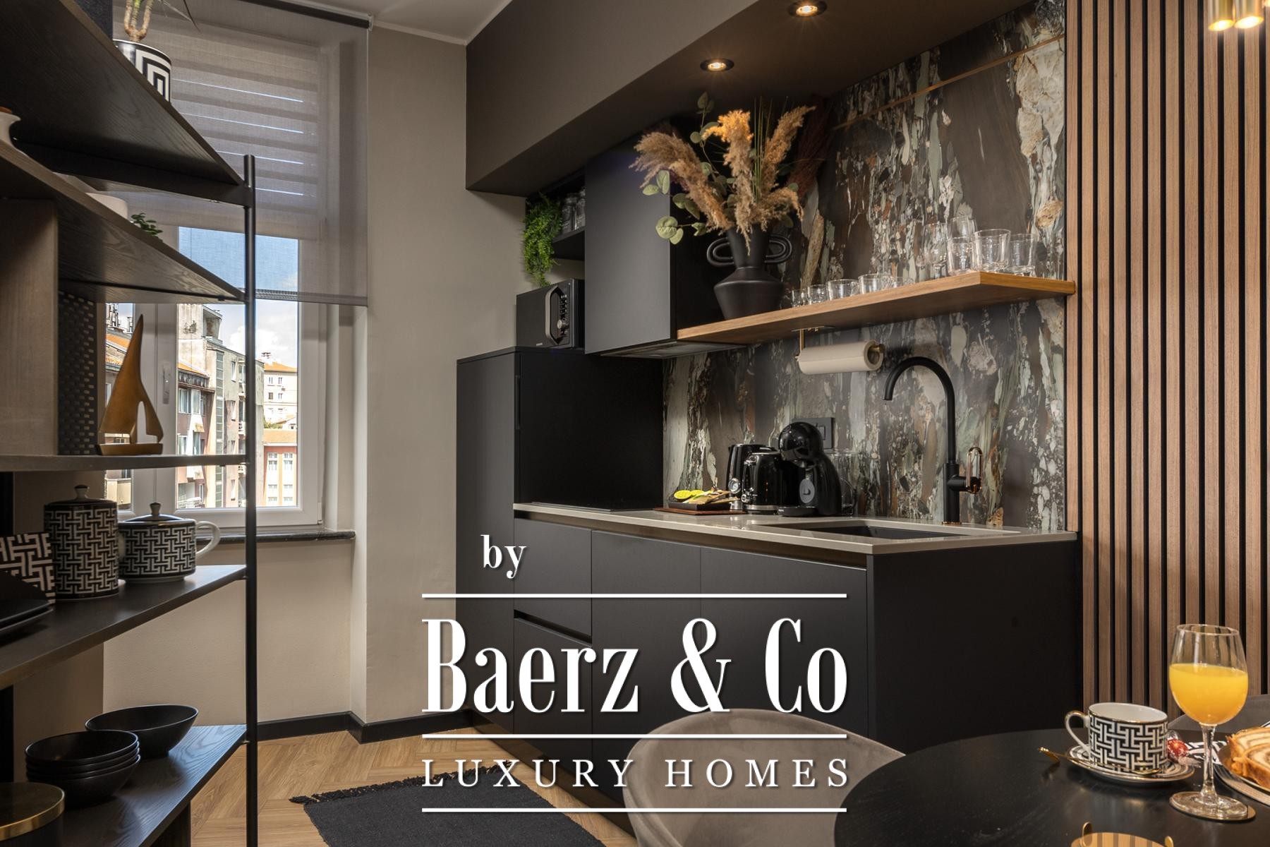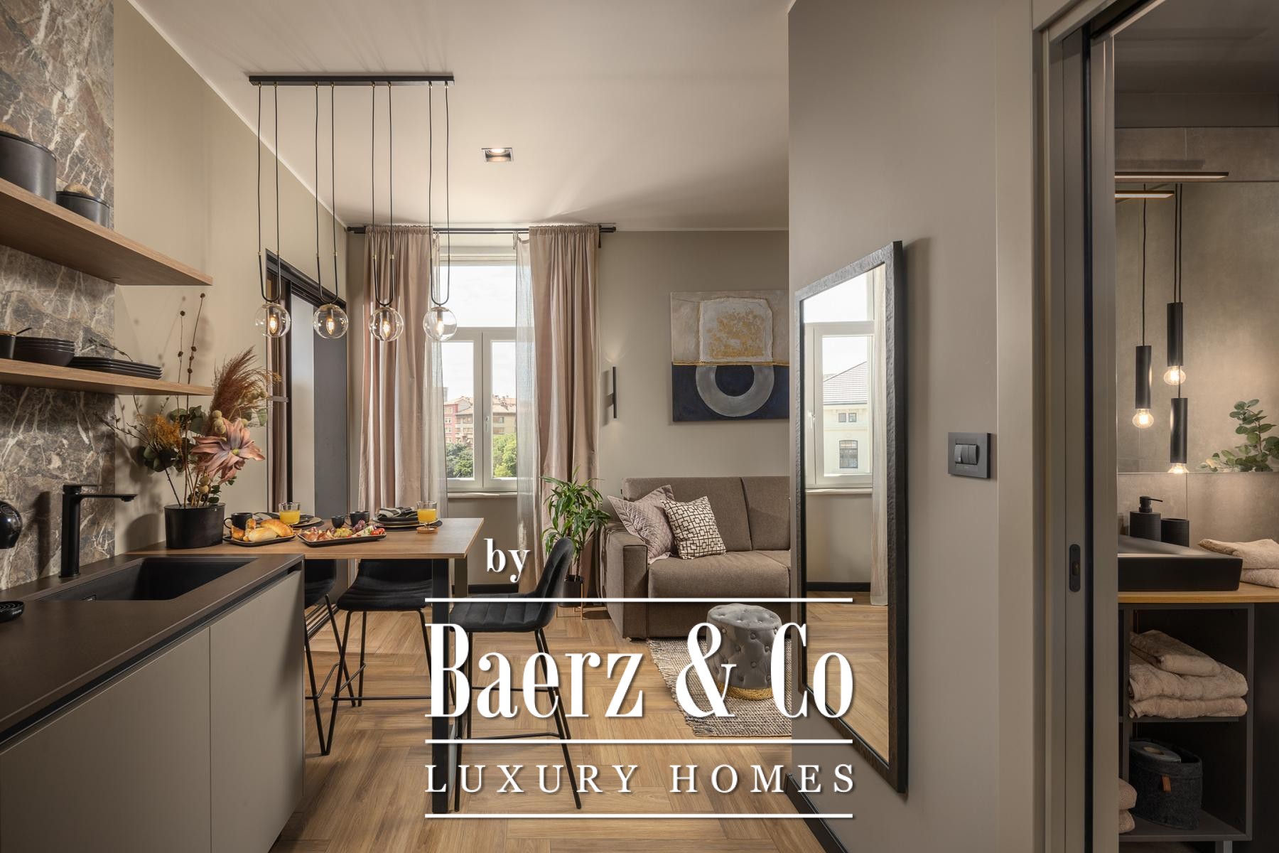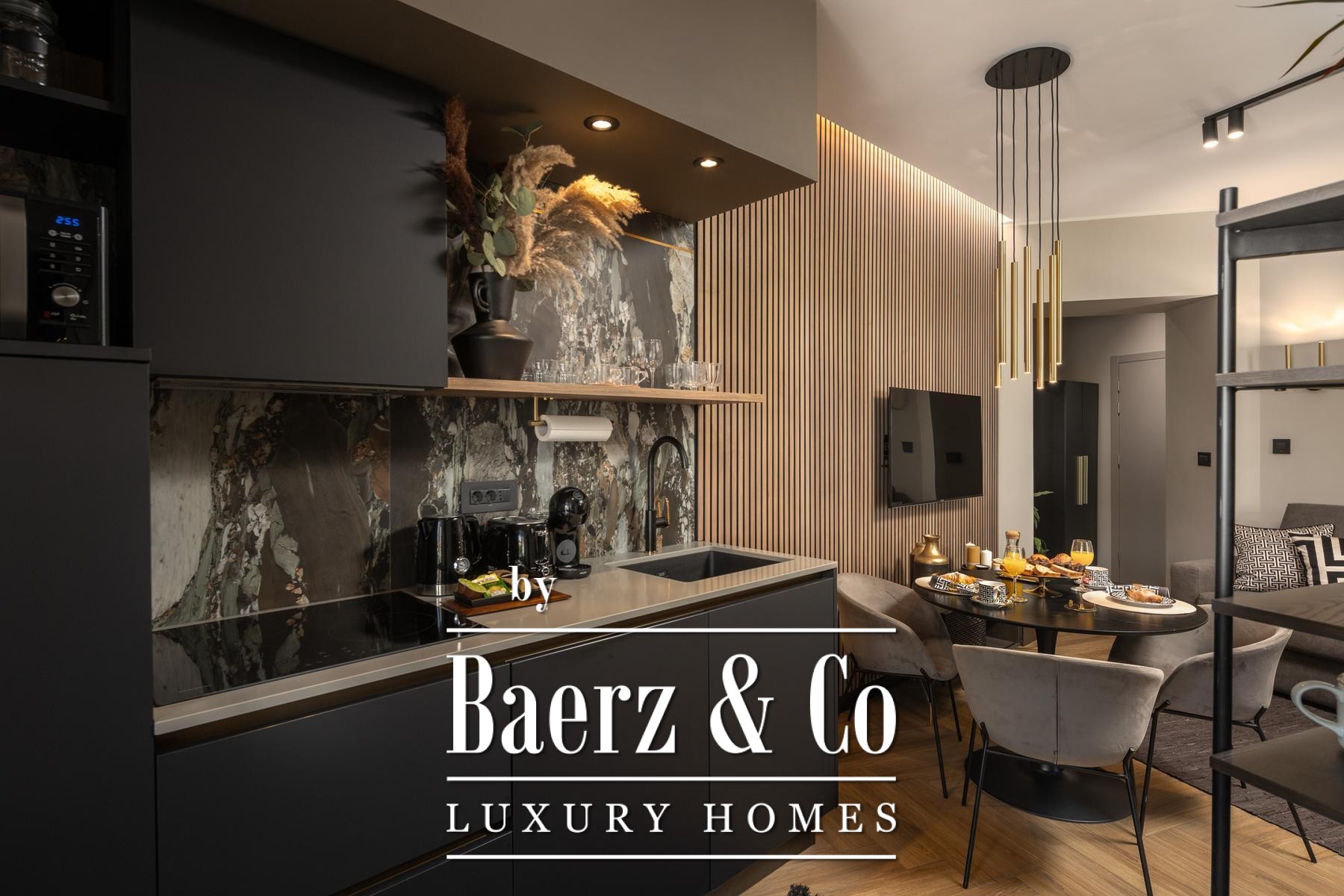 The interiors are shaped by a refined use of warm beige and anthracite, highlighted by gold details and custom lighting. Italian furnishings, large-format porcelain tiles, and matte black Veneta Cucine kitchens with sophisticated stone-marble backsplashes set an elevated tone. Frosted glass partitions, wooden wall slats with LED accents, and designer brass lighting complete the ambience.