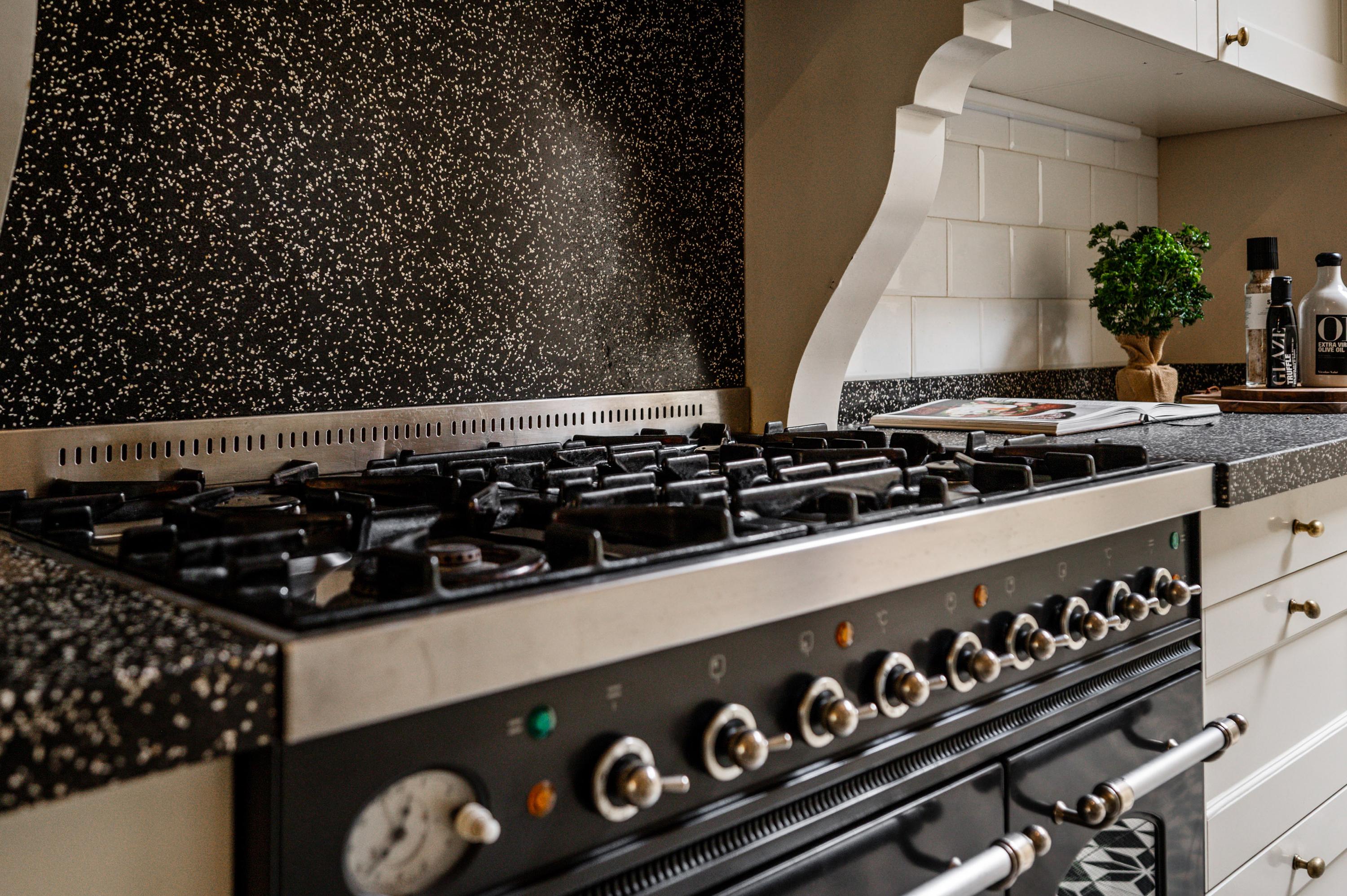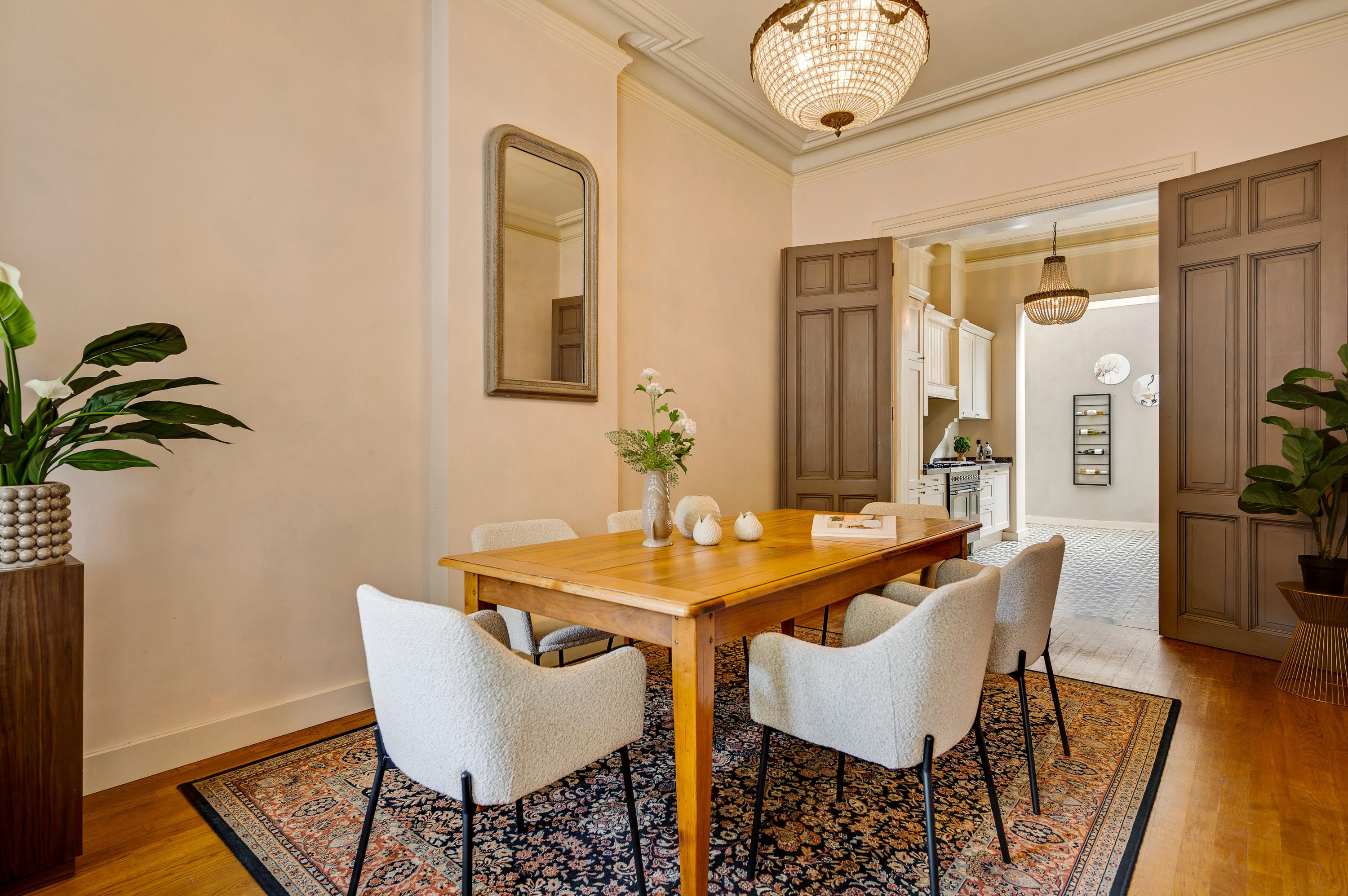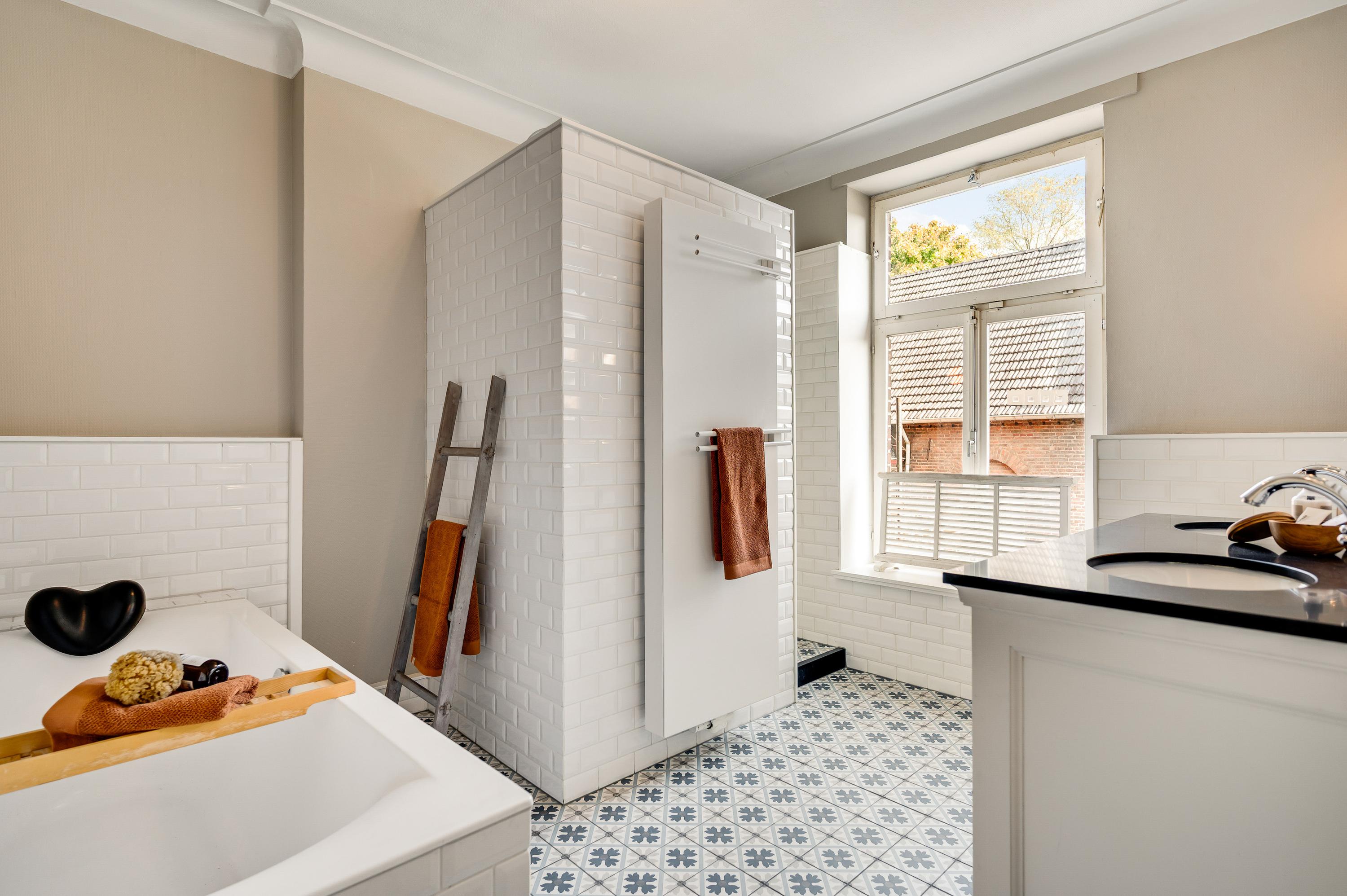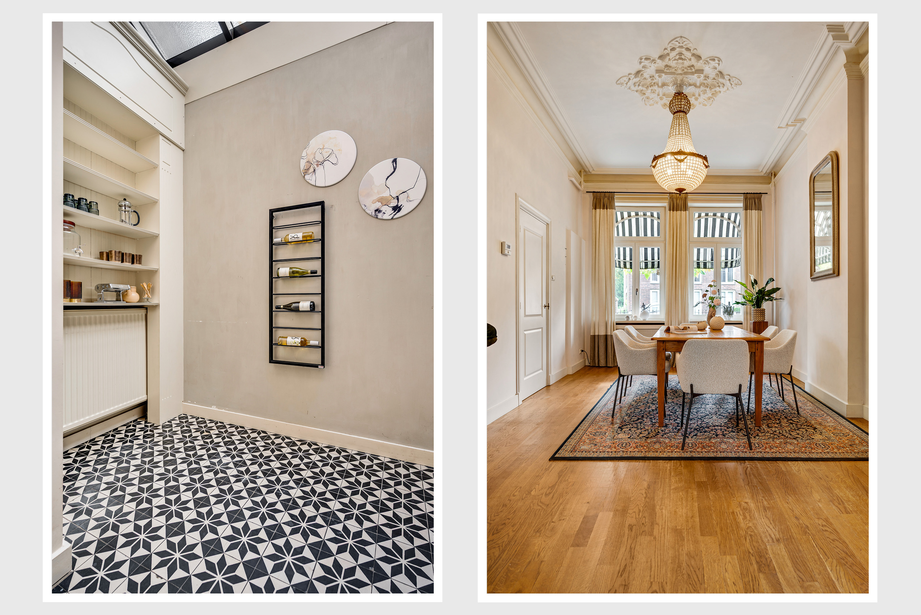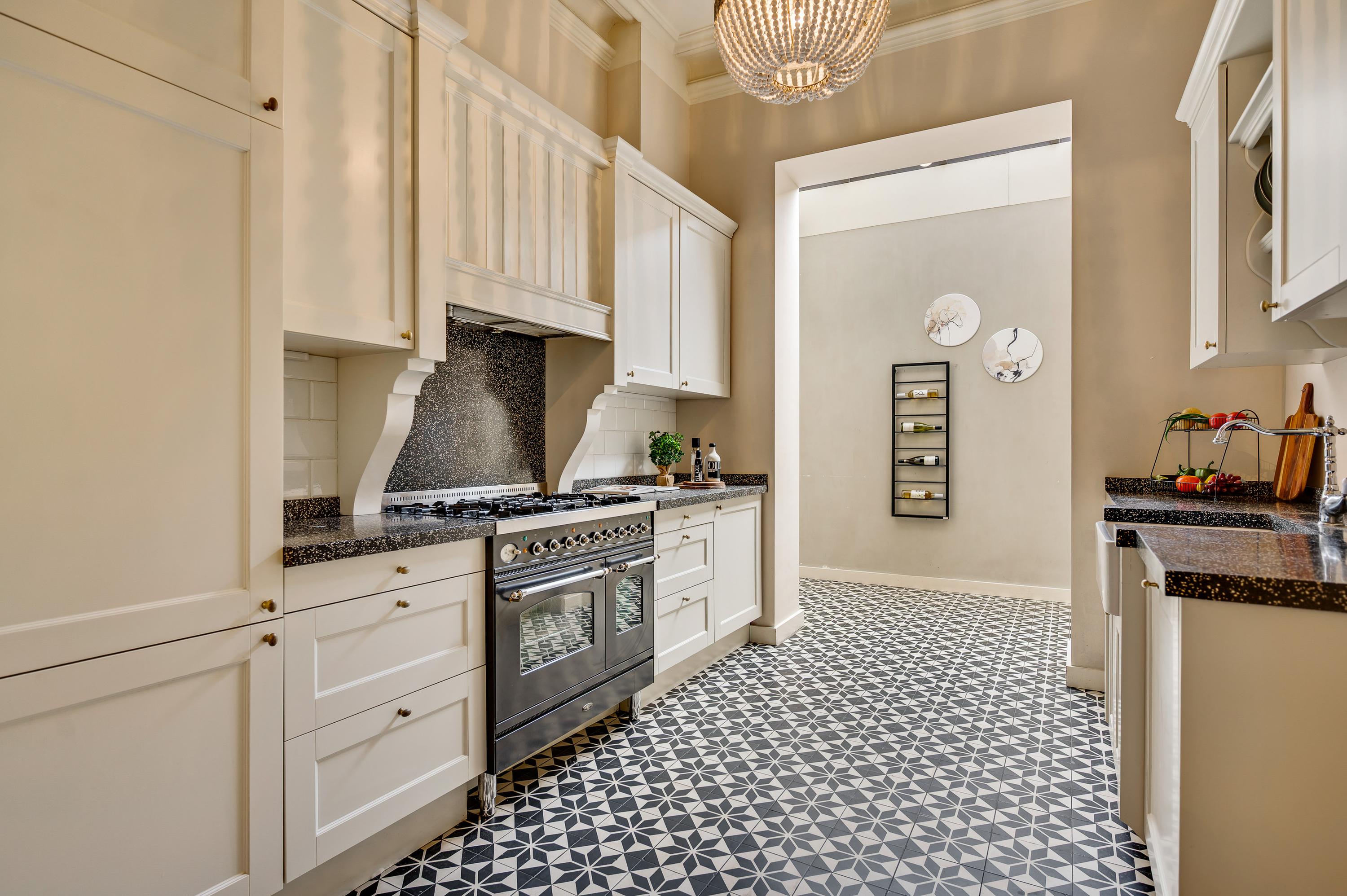 From the stately hall, you enter the impressive kitchen-diner of approximately 25 m². It is equipped with a luxurious kitchen layout that combines classic craftsmanship with modern convenience. The terrazzo countertop, the 6-burner Boretti gas stove with double oven, and the high-quality built-in appliances make this kitchen the beating culinary heart of the home. The classic tiled floor and the high panel doors that separate the kitchen from the dining room emphasize the refined character of the home.