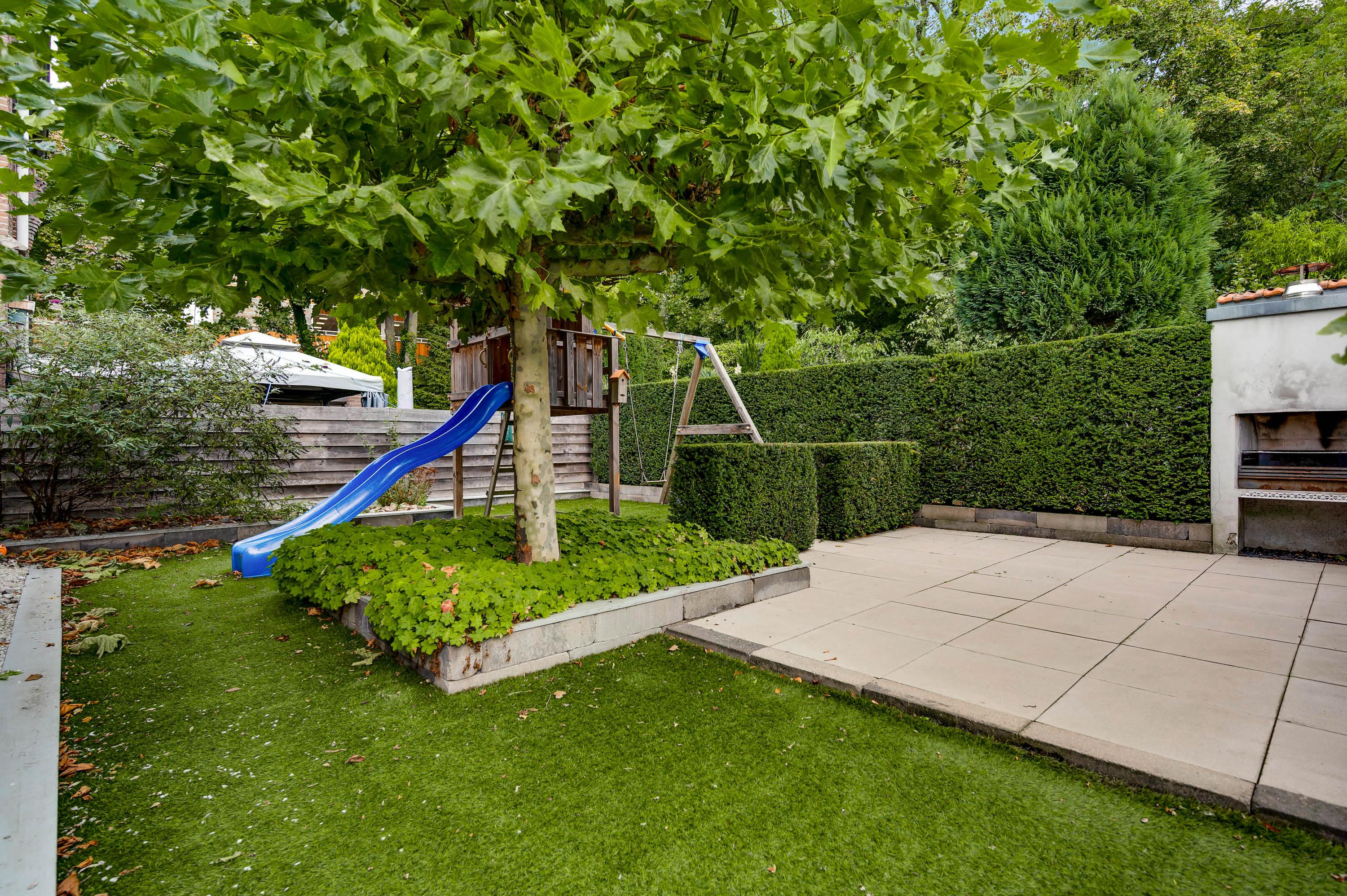 At the side of the house, you enter the backyard. Here, a children's play area has been created. Green spaces have also been considered. The various areas give the garden a playful feel.