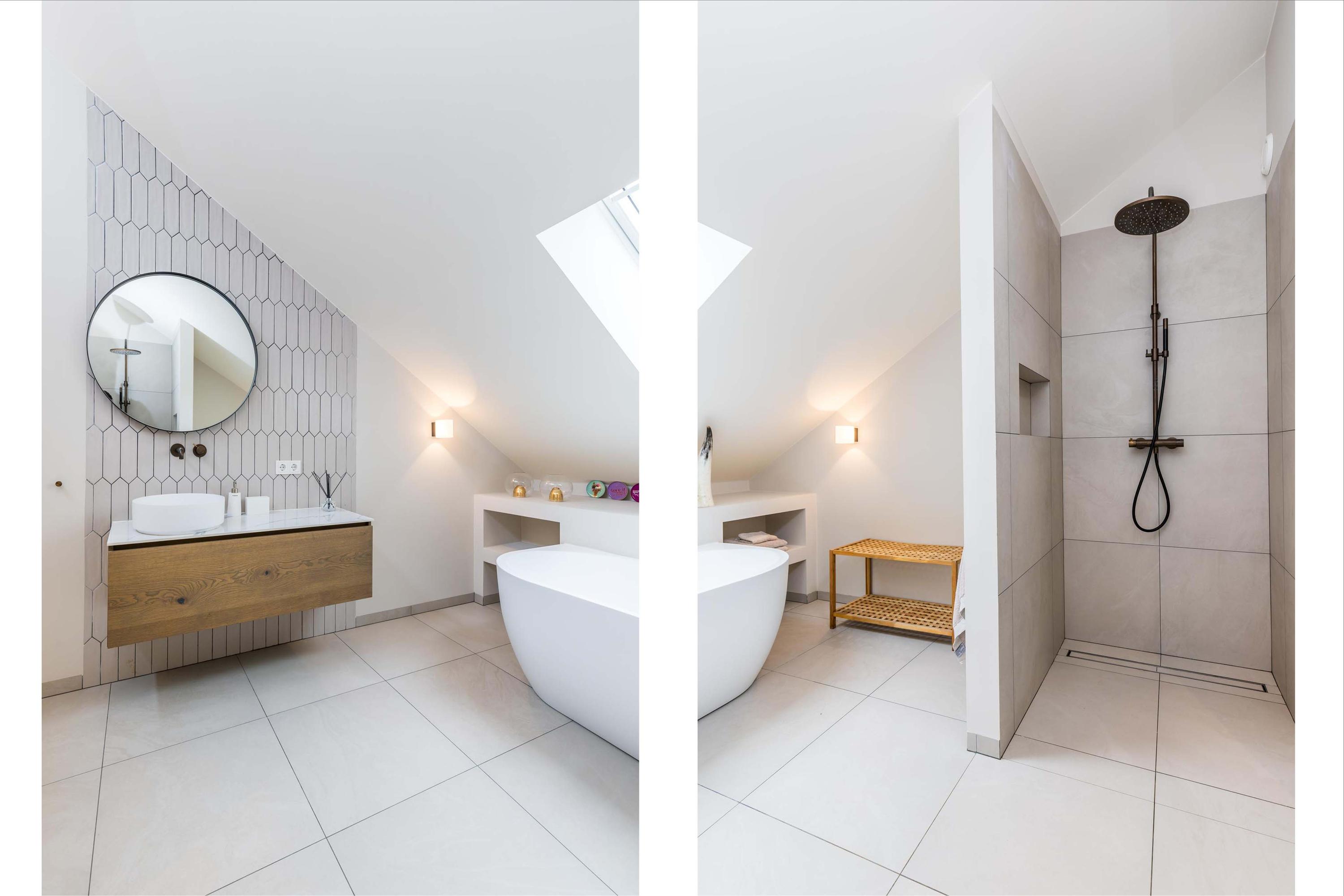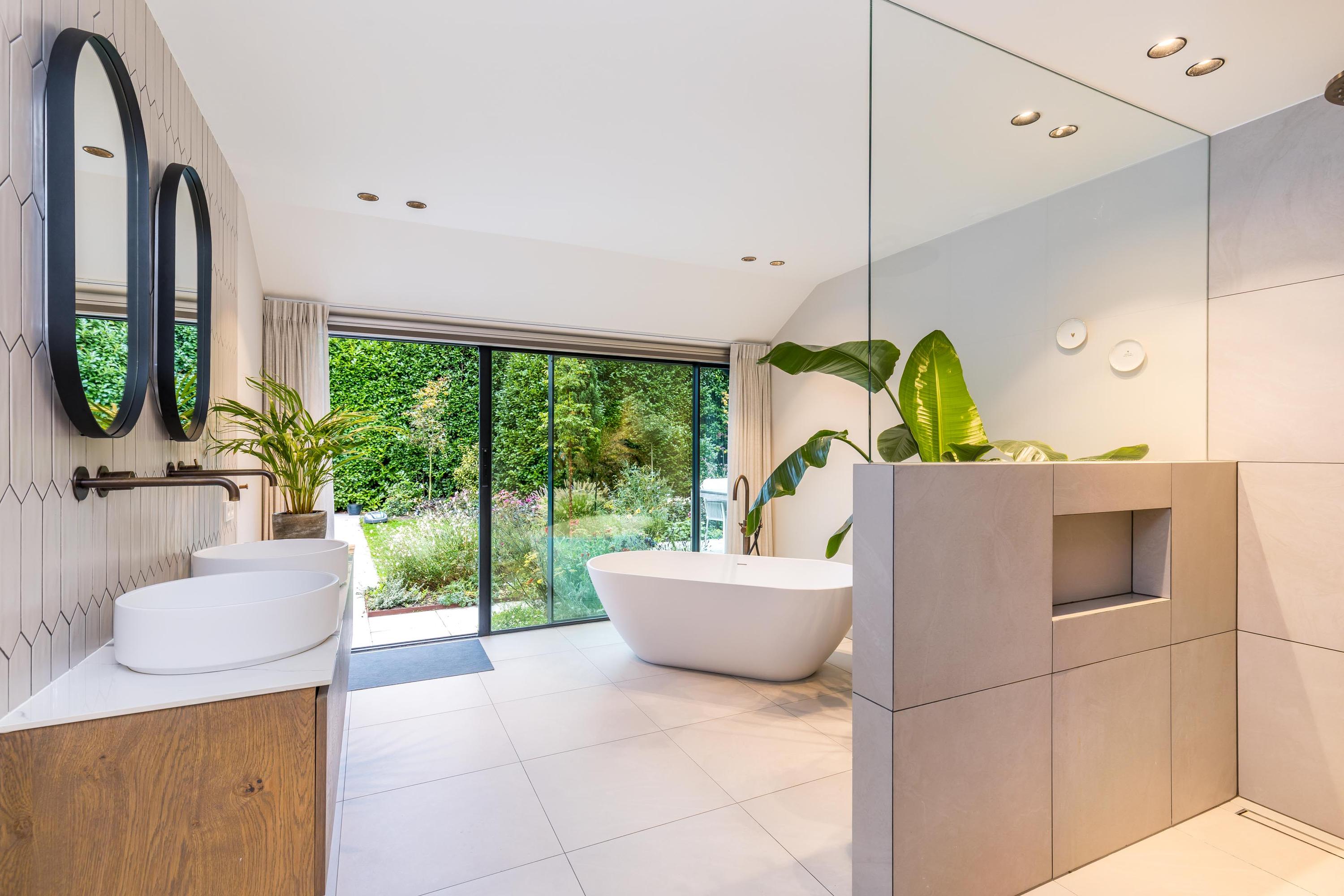 Following the entrance hall is the garden-facing kitchen/diner with a spectacular height, a beautiful, sleek kitchen with a cooking island and equipped with all desirable built-in appliances. Sliding doors provide access to the terrace and the attractive back garden. Charming garden-facing living room with a cosy fireplace and lovely views of both the front and back gardens with a stream. The kitchen/diner opens onto a spacious TV room at the front. Also from the kitchen is a separate hallway with a toilet and sink, and access to the master bedroom with a walk-in closet and ensuite luxury bathroom overlooking the garden, featuring a freestanding bathtub, walk-in shower, and vanity. There is also a spacious laundry/mud room with ample storage space that could also be used as a fitness room. The installations, including the heat pump, are neatly concealed in this space.