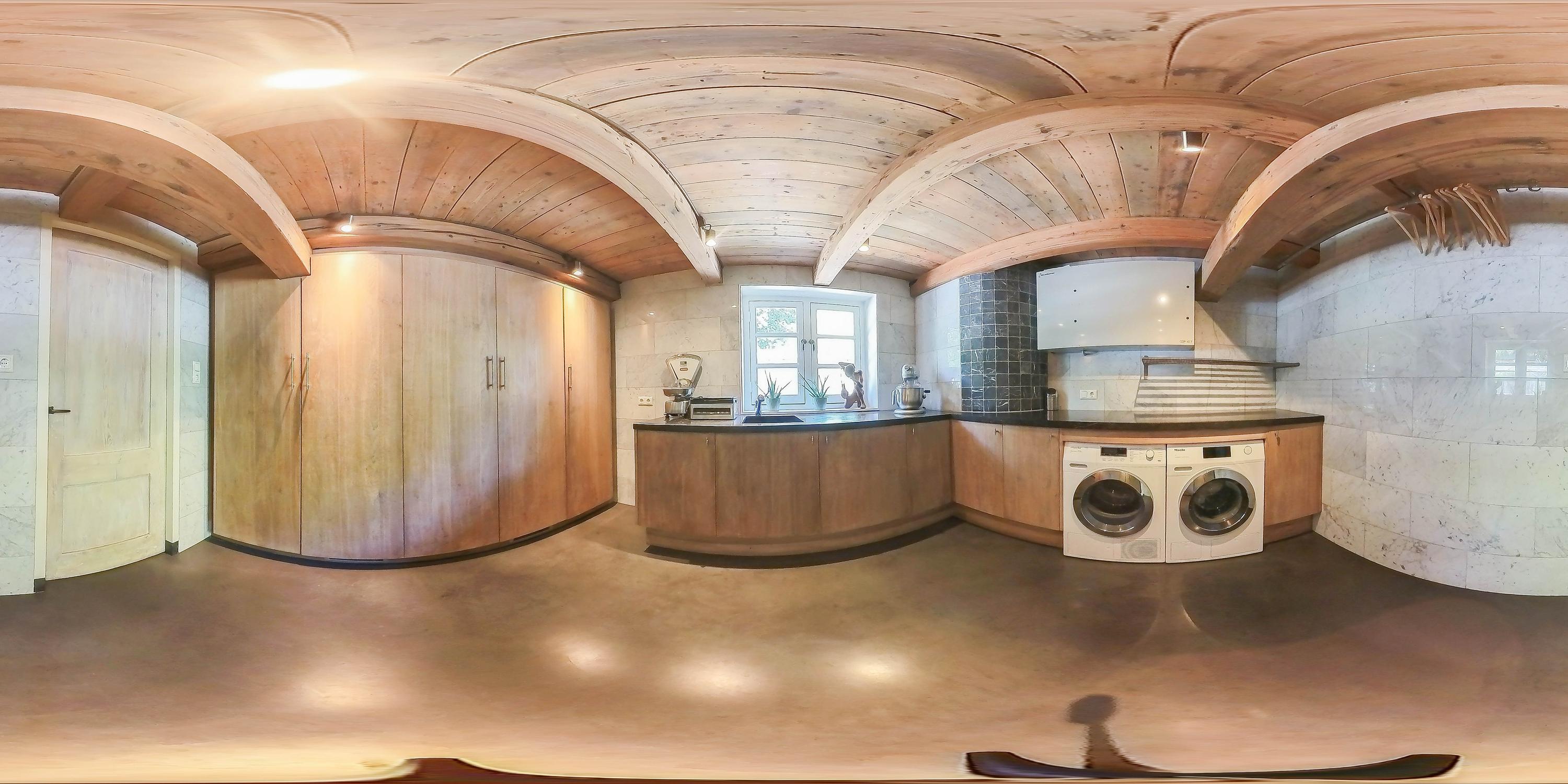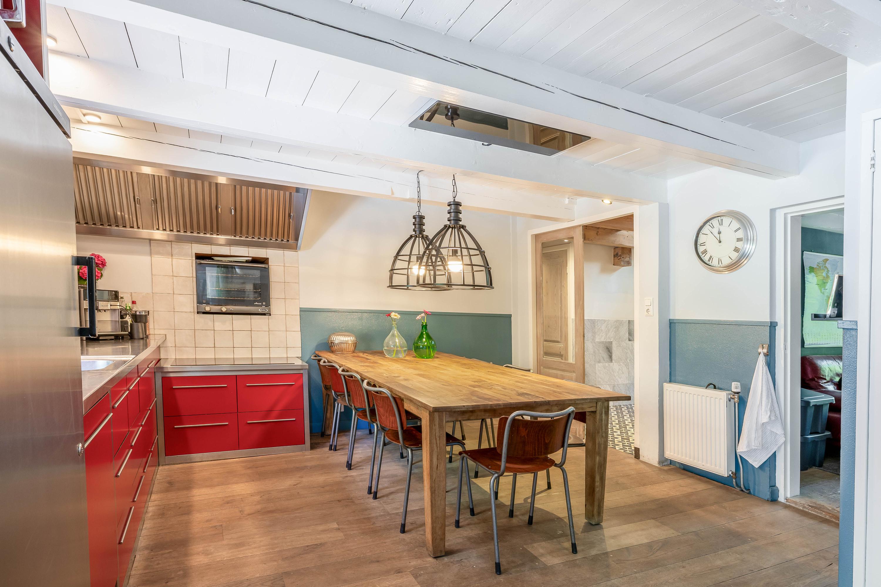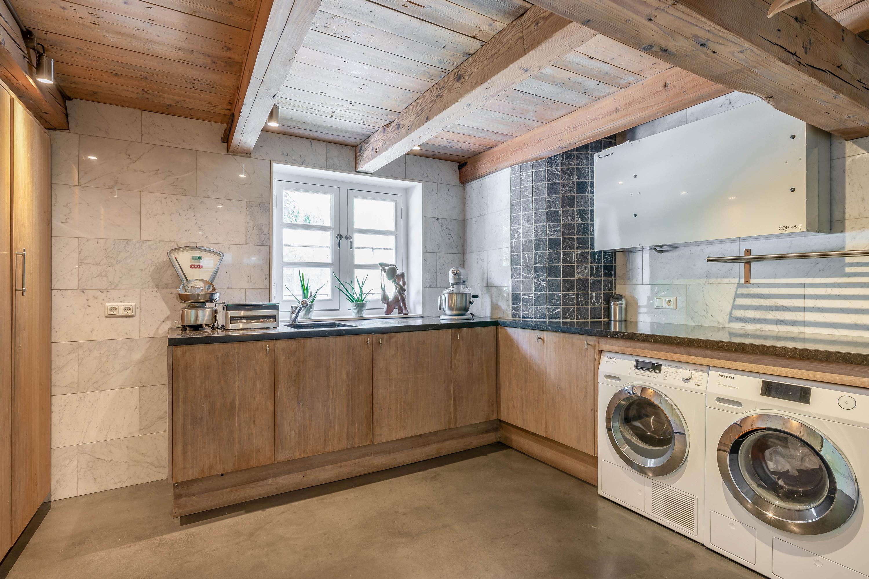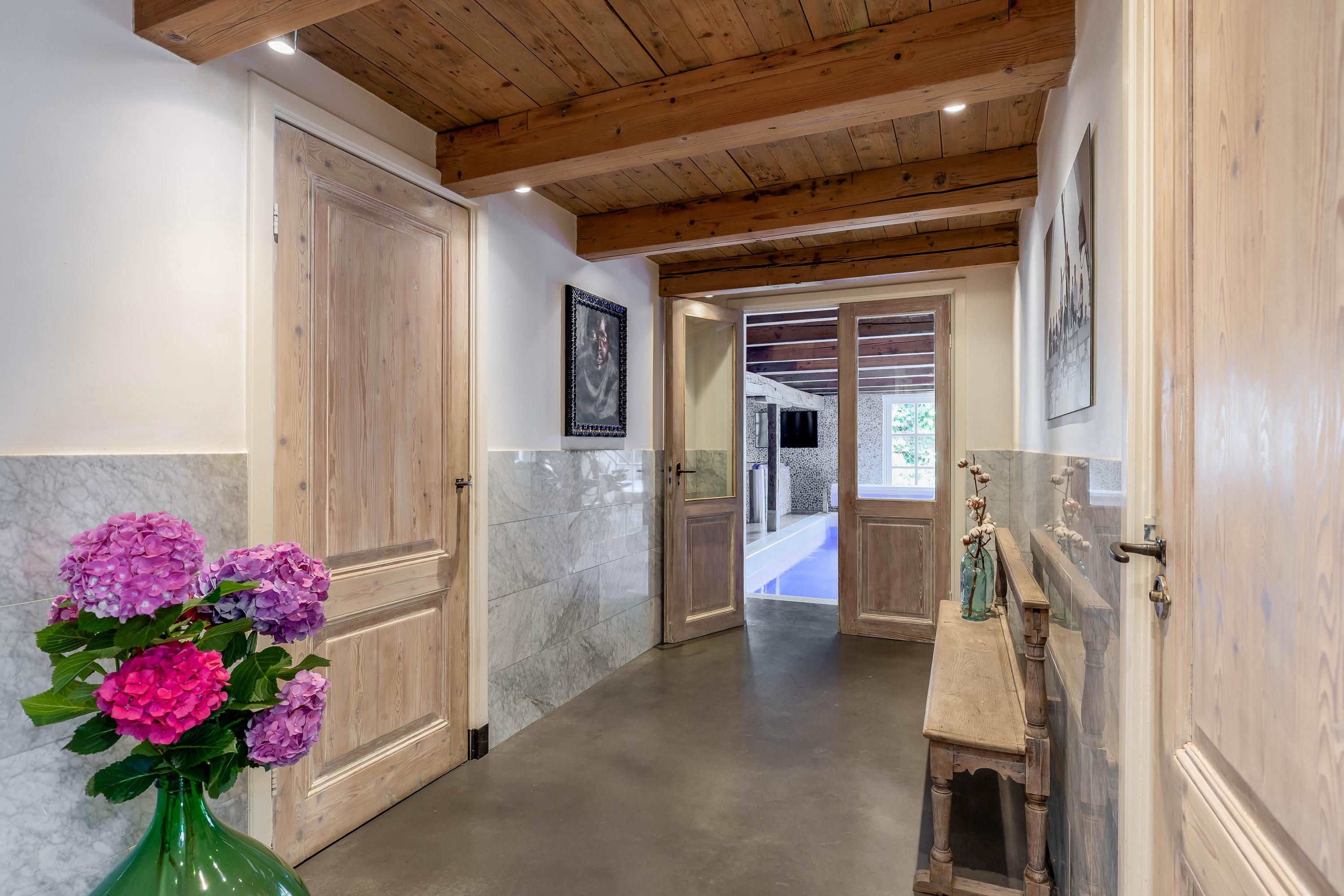 Front entrance with impressive reception area featuring antique fireplace with wood stove, Belgian natural stone floor with underfloor heating and monumental box bed wall (a separate toilet, a bathroom with shower and washbasin, and the staircase to the upper floor are hidden behind it), access to the wine cellar and the raised room above, currently used as an office, atmospheric living room with wooden floors, fireplace and wood-burning stove, passage to cosy farmhouse kitchen with professional appliances including a convection oven, induction hob, extractor fan, dishwasher, fridge and stainless steel worktop, wooden floorboards and door to the garden, bedroom with fireplace and wooden floors, side entrance with wardrobe, luxury toilet, utility room with additional kitchenette and washing machine connection, luxurious wellness area with swimming pool with automatic cover, large jacuzzi, shower and preparations for sauna.