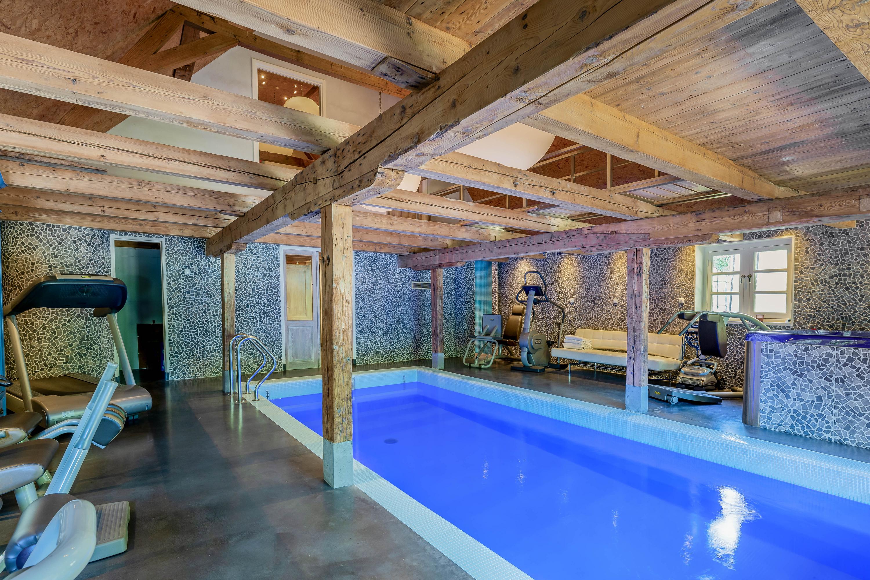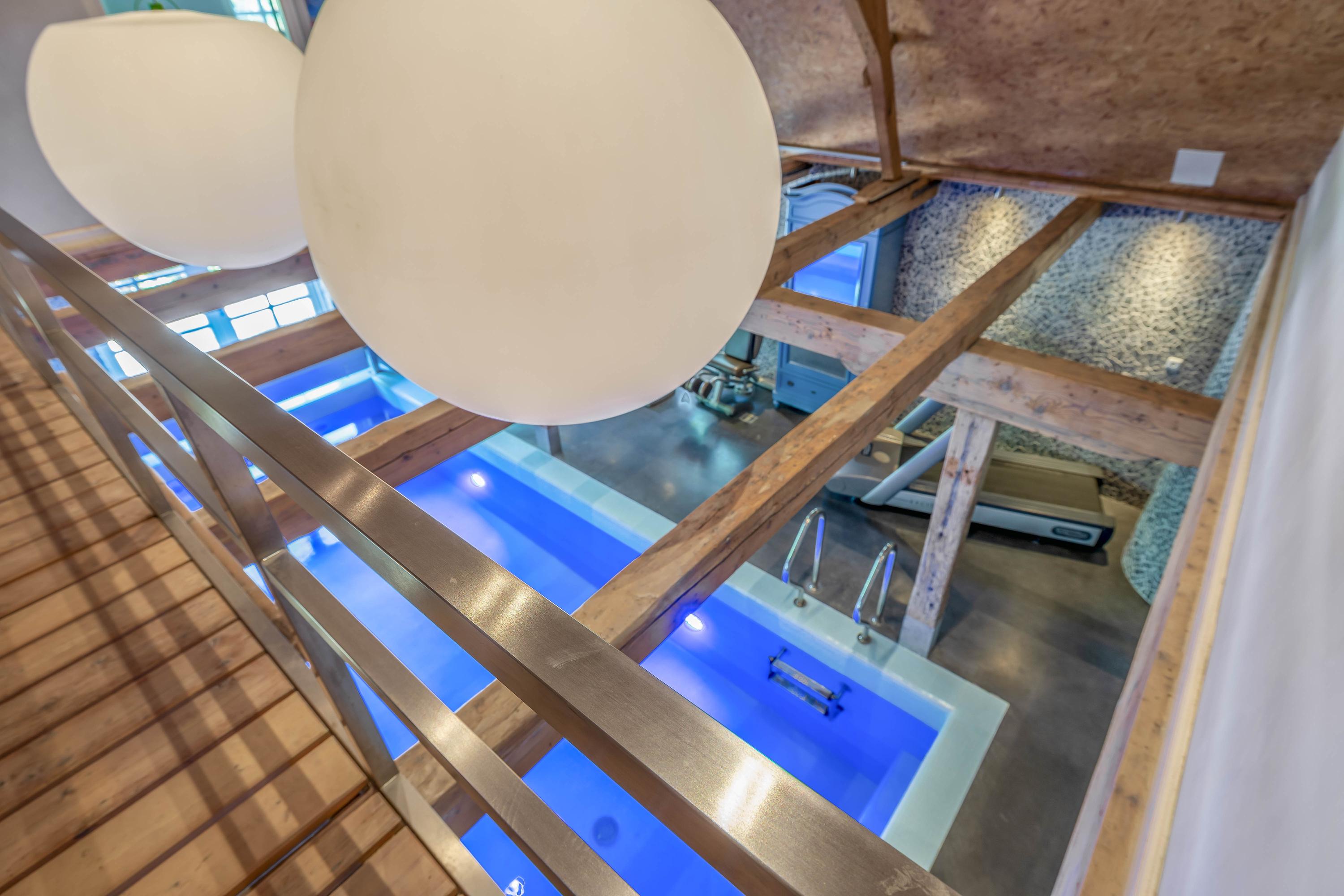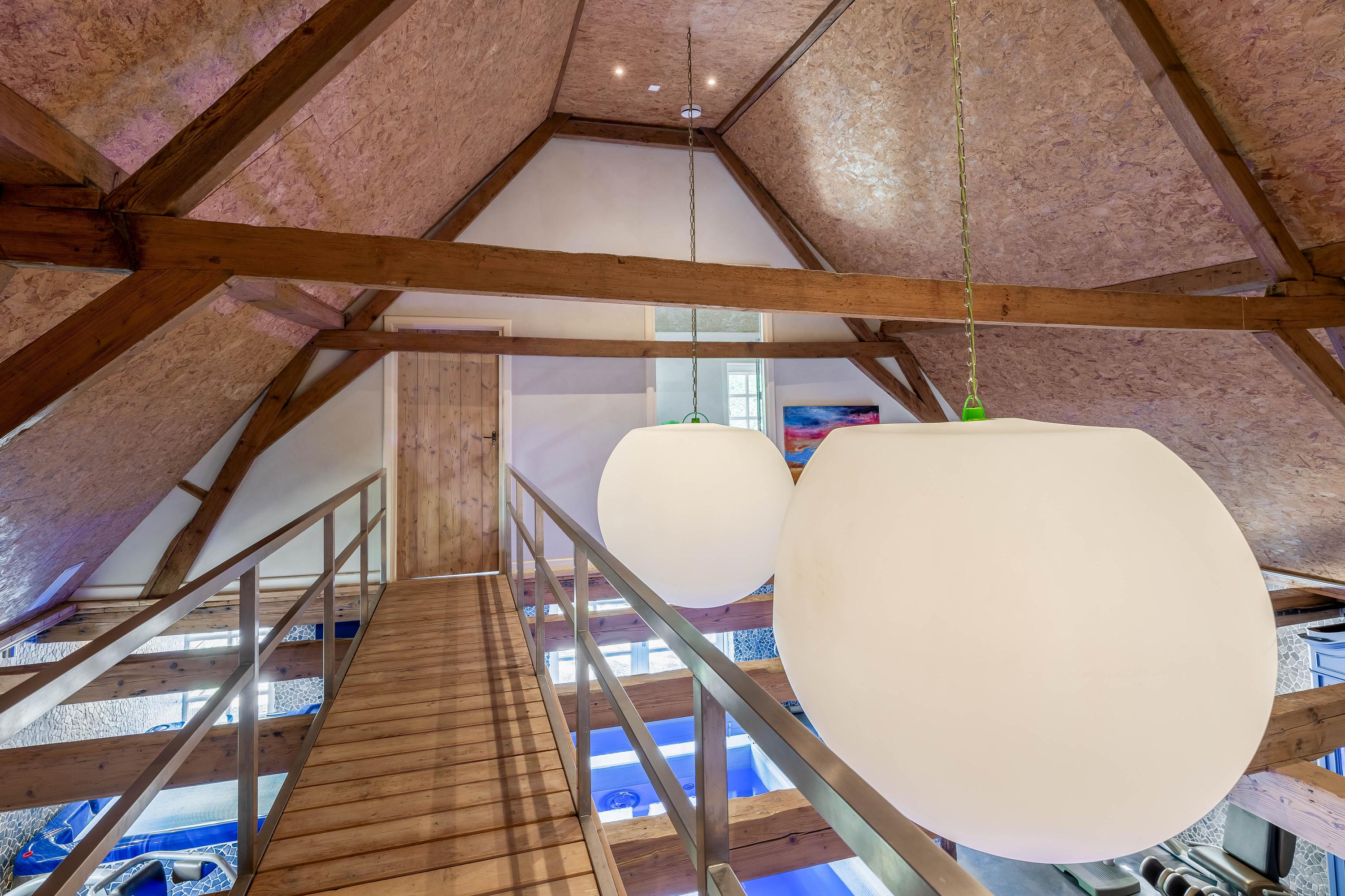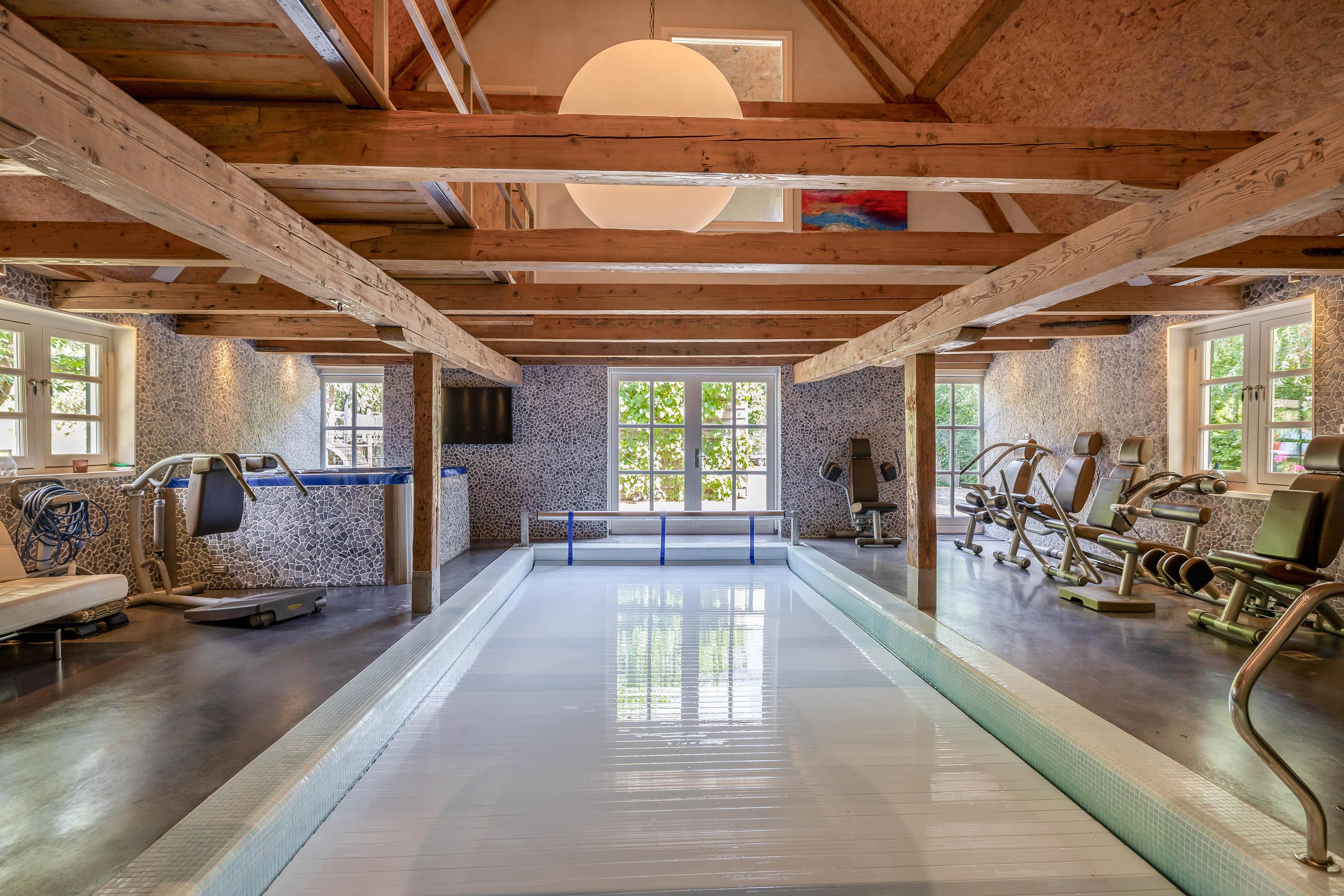 The absolute showpiece is the wellness area in the former stable. Here, a luxurious indoor pool has been installed with automatic cover, large jacuzzi, gym area, and preparations for a sauna – all surrounded by original stable windows and sturdy wooden beams.