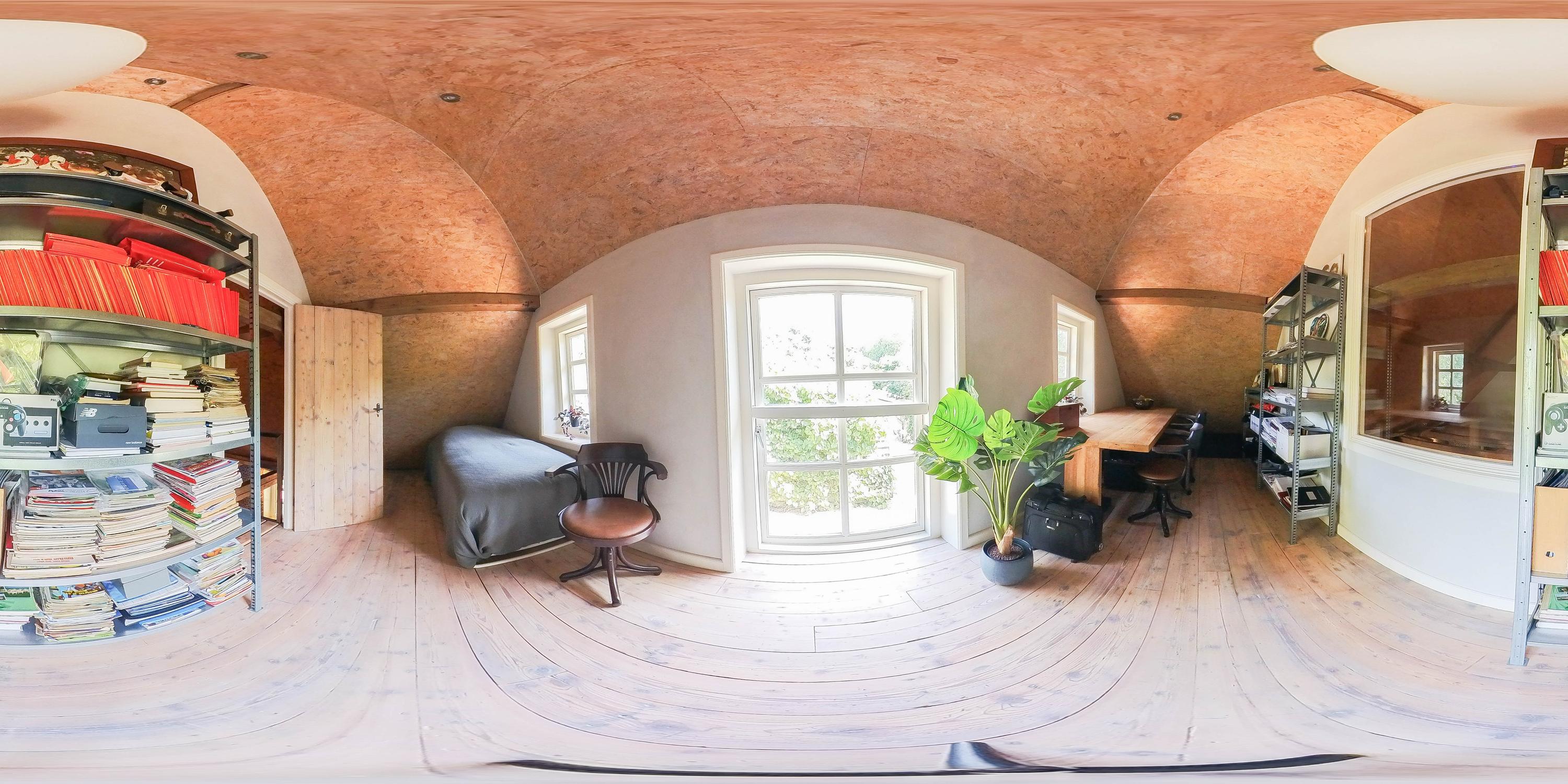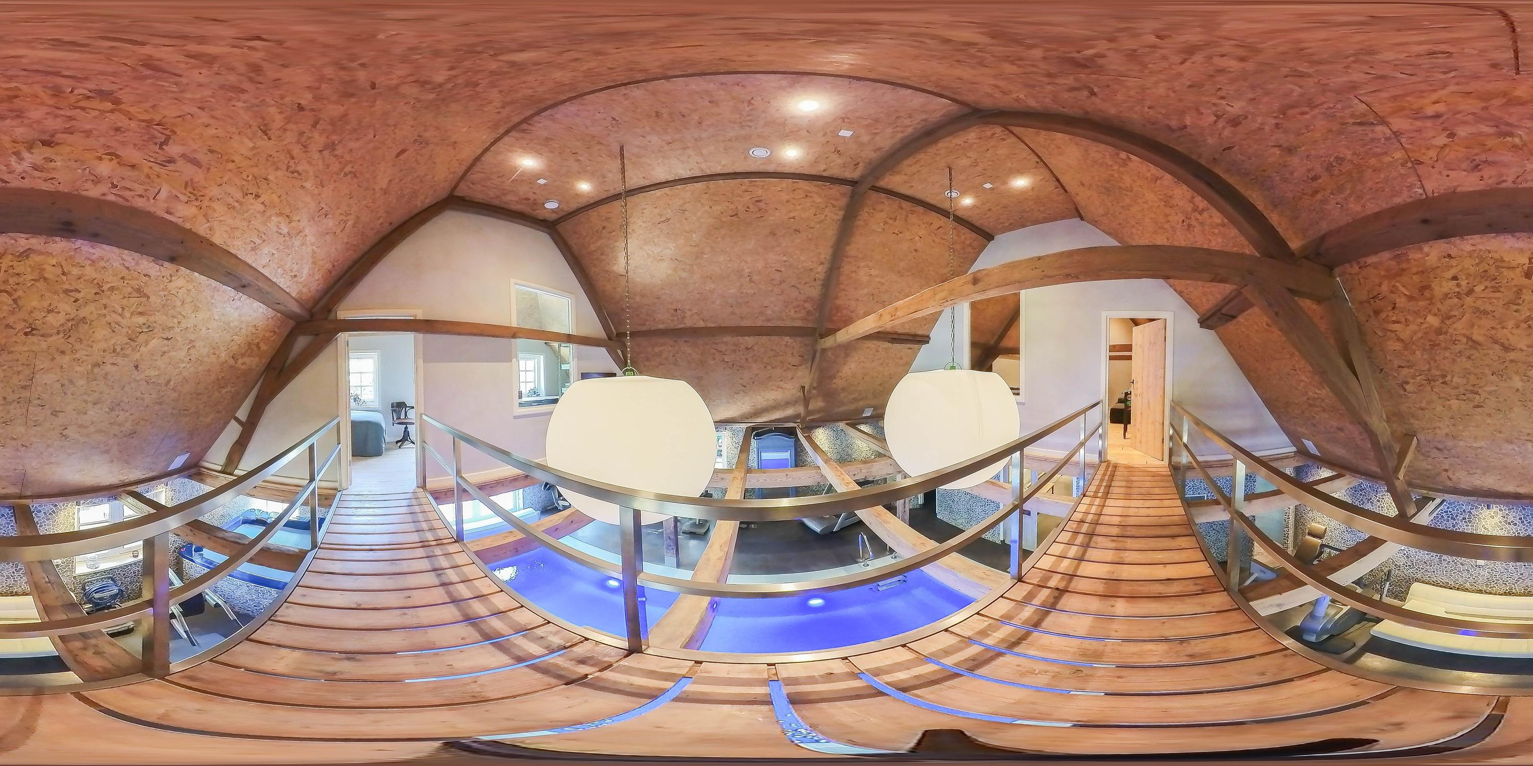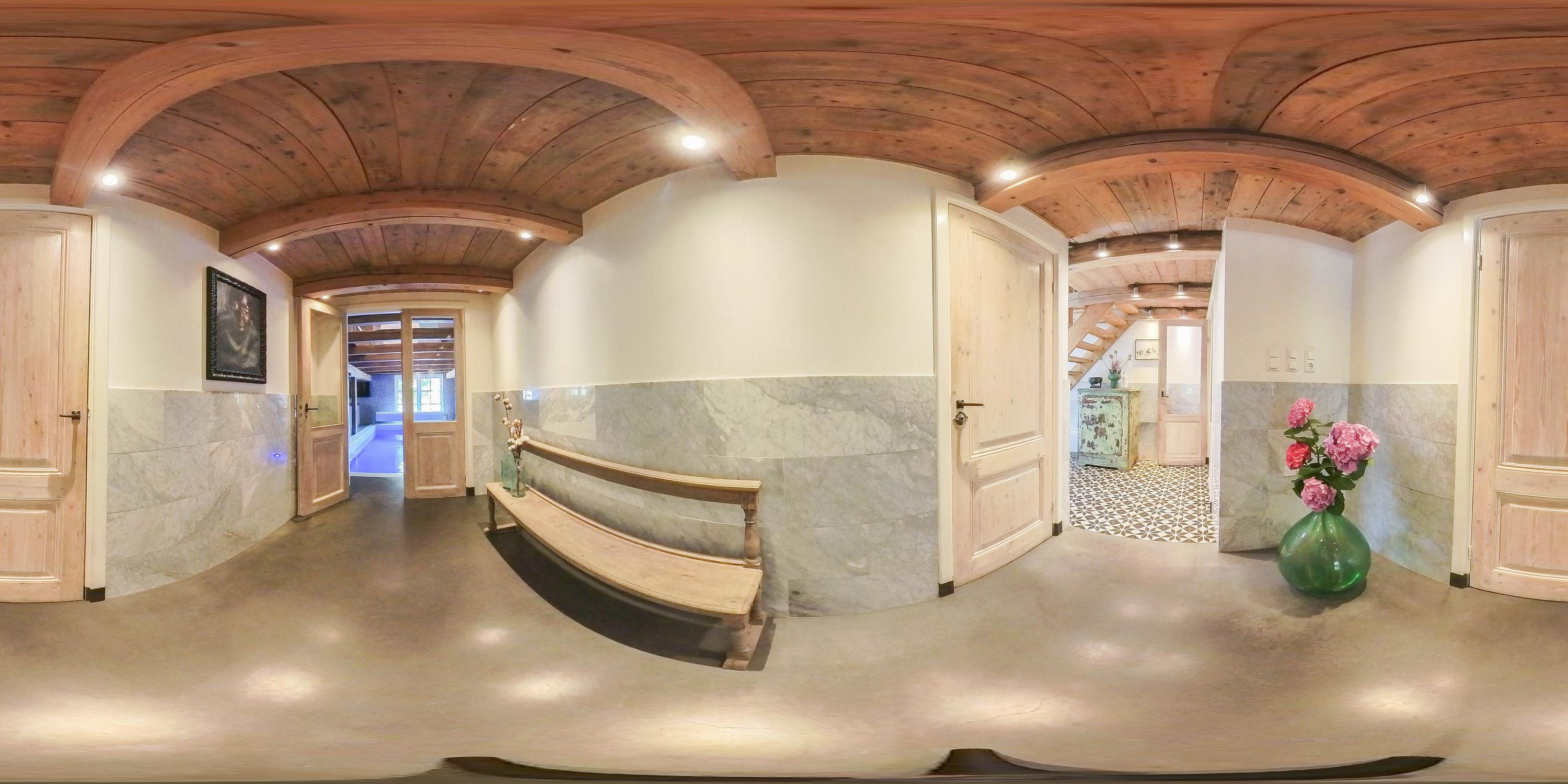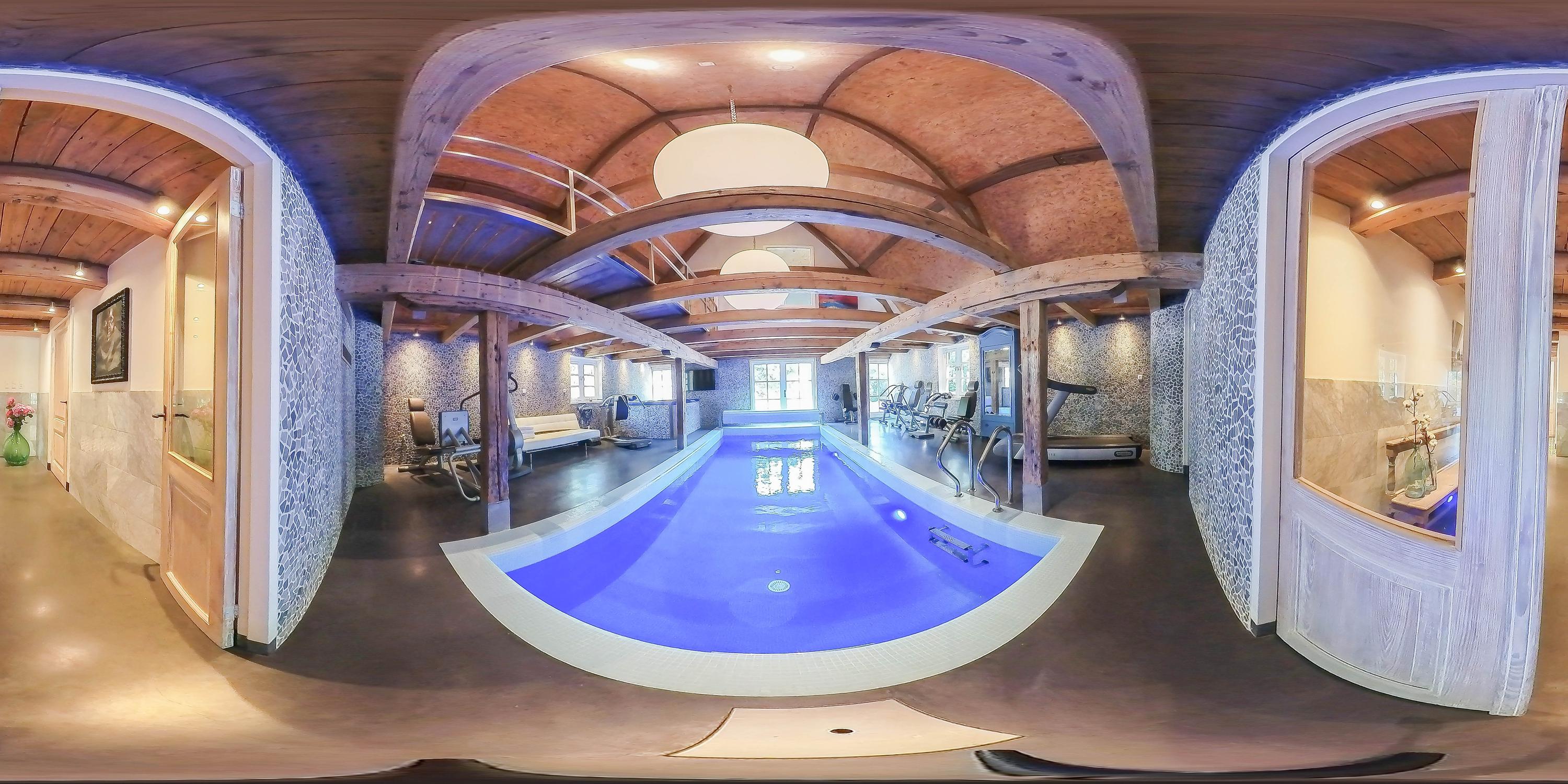 The absolute showpiece is the wellness area in the former stable. Here, a luxurious indoor pool has been installed with automatic cover, large jacuzzi, gym area, and preparations for a sauna – all surrounded by original stable windows and sturdy wooden beams.