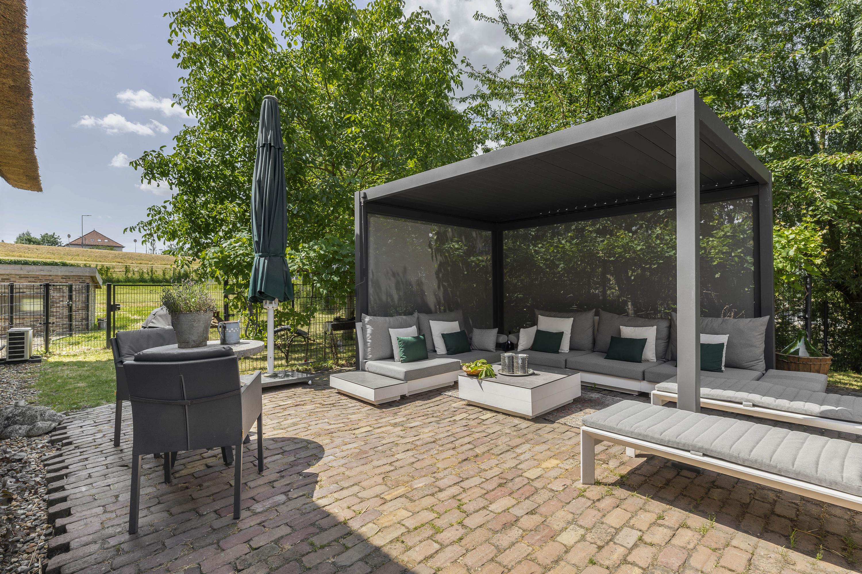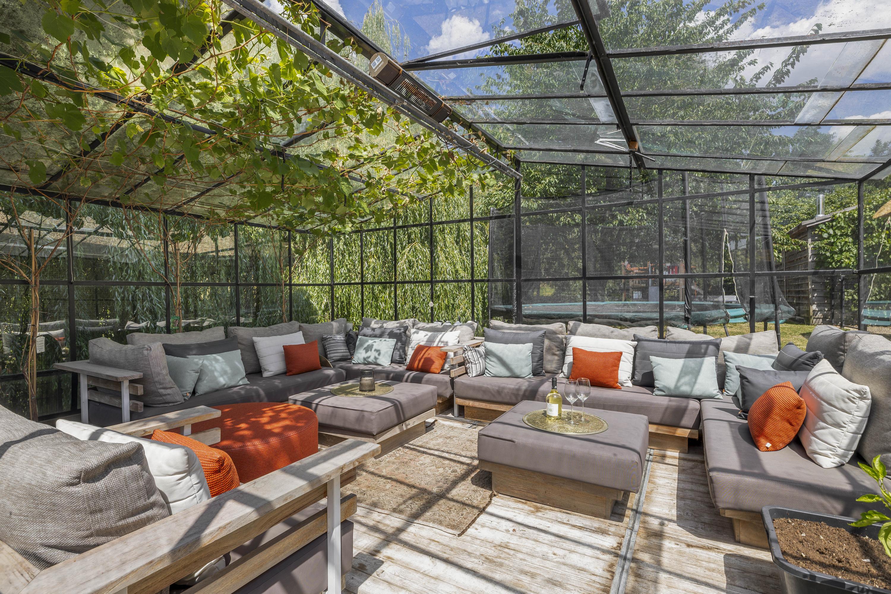 The yard features a spacious garage/barn of over 80m², a large greenhouse – perfect for enjoying even on cooler days – and an inviting canopy directly adjacent to the kitchen. For horse enthusiasts, there are three horse boxes. A drained all-weather riding arena and paddock were also installed in the past. The property is stylishly fenced with a double-spoke gate and accessed via an automatic entrance gate.