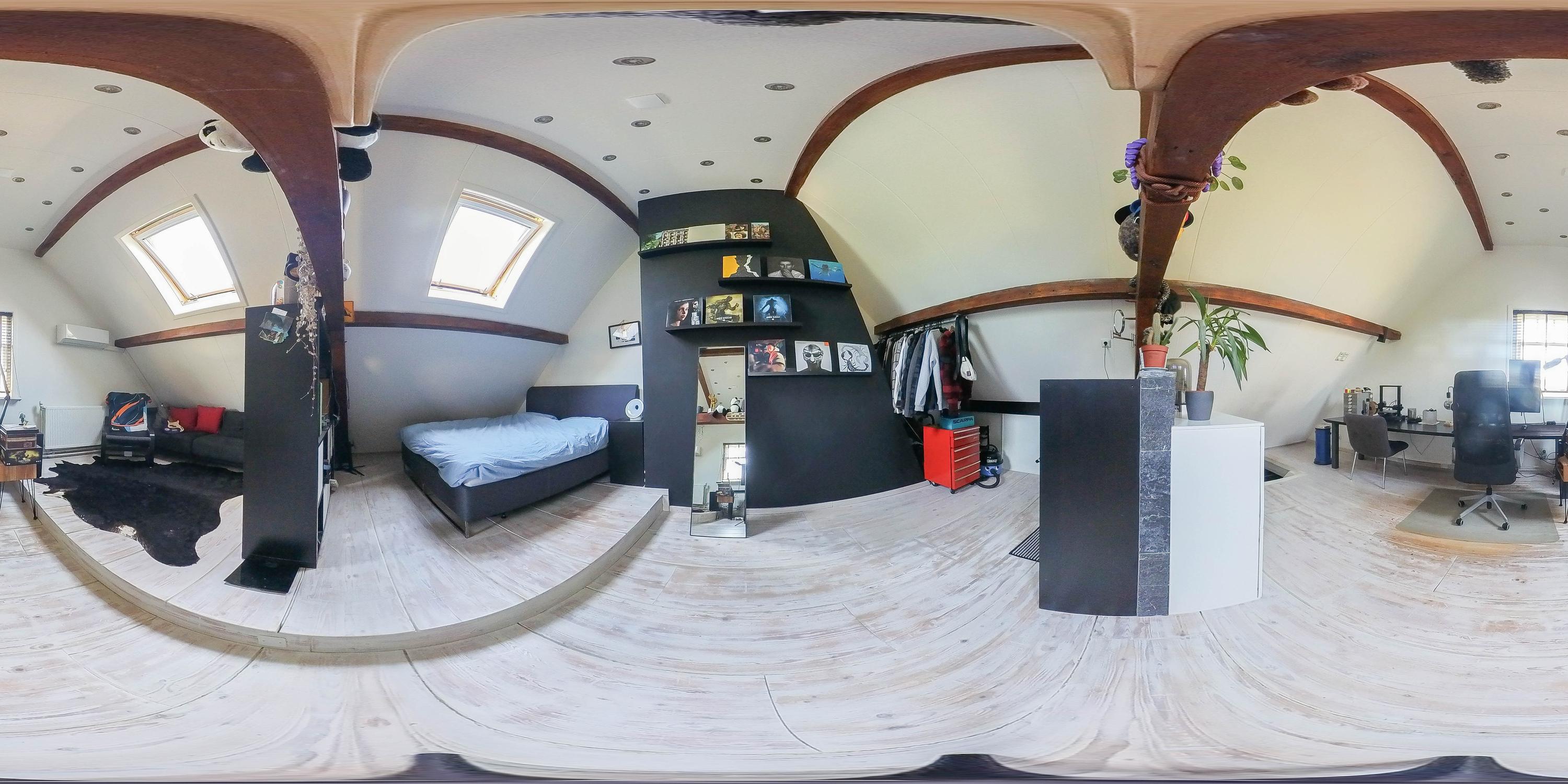 Beautiful staircase, spacious landing with dormer window, separate toilet and walk-in closet, expansive bedroom with 2 new skylights, en-suite bathroom (2020) with walk-in shower, 2 sinks and underfloor heating, entertainment room with billiards and cinema setup, which could also be used as a bedroom, and passage via footbridge over the pool to the rear bedroom with wooden floors.