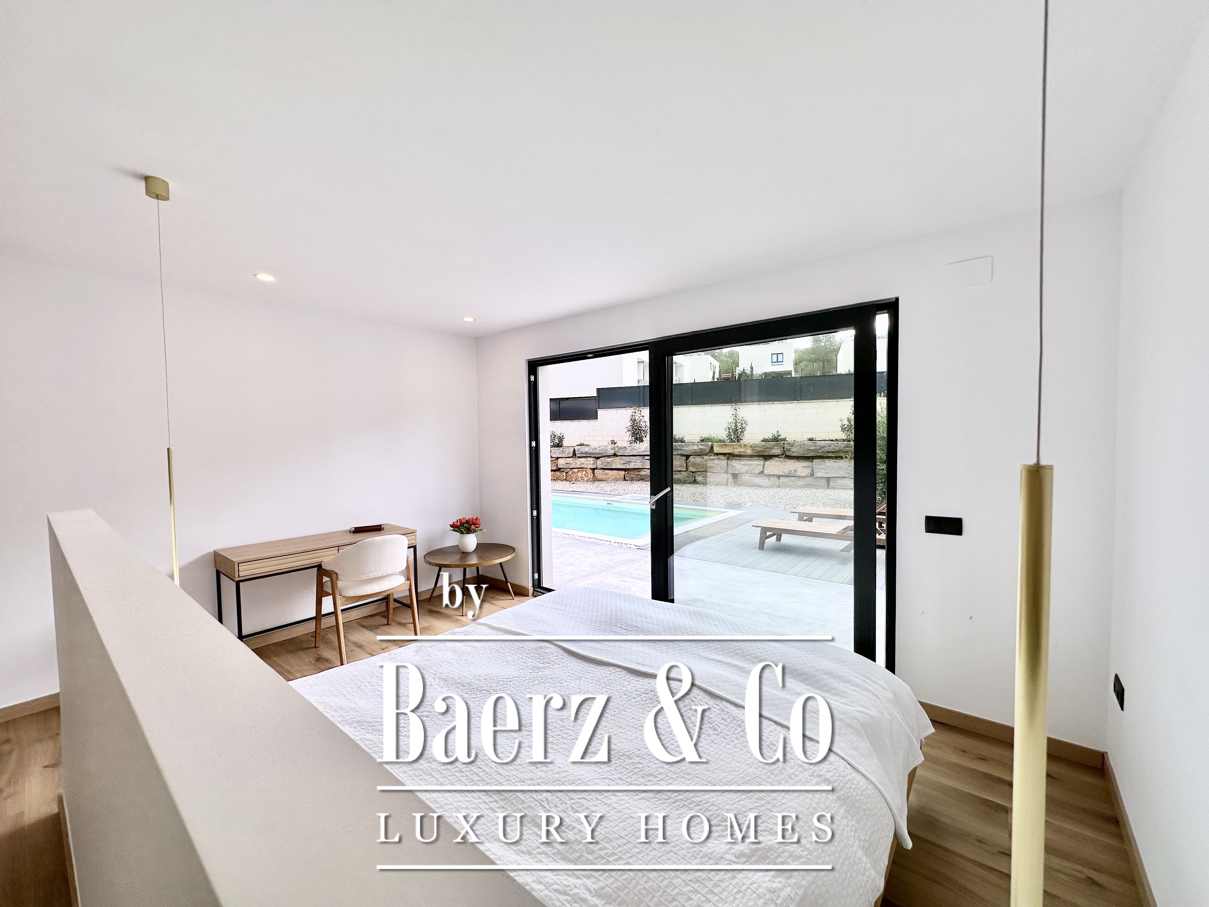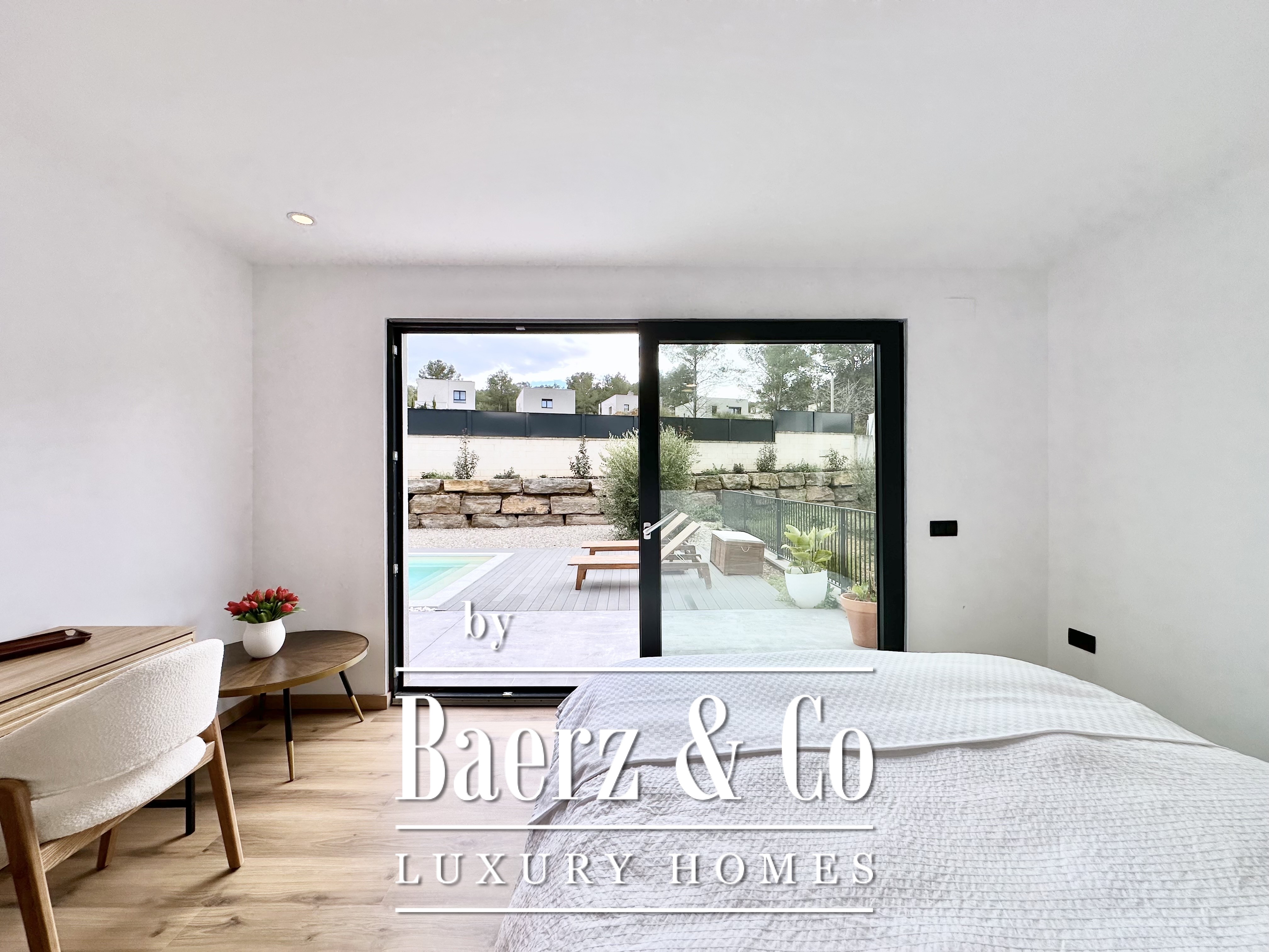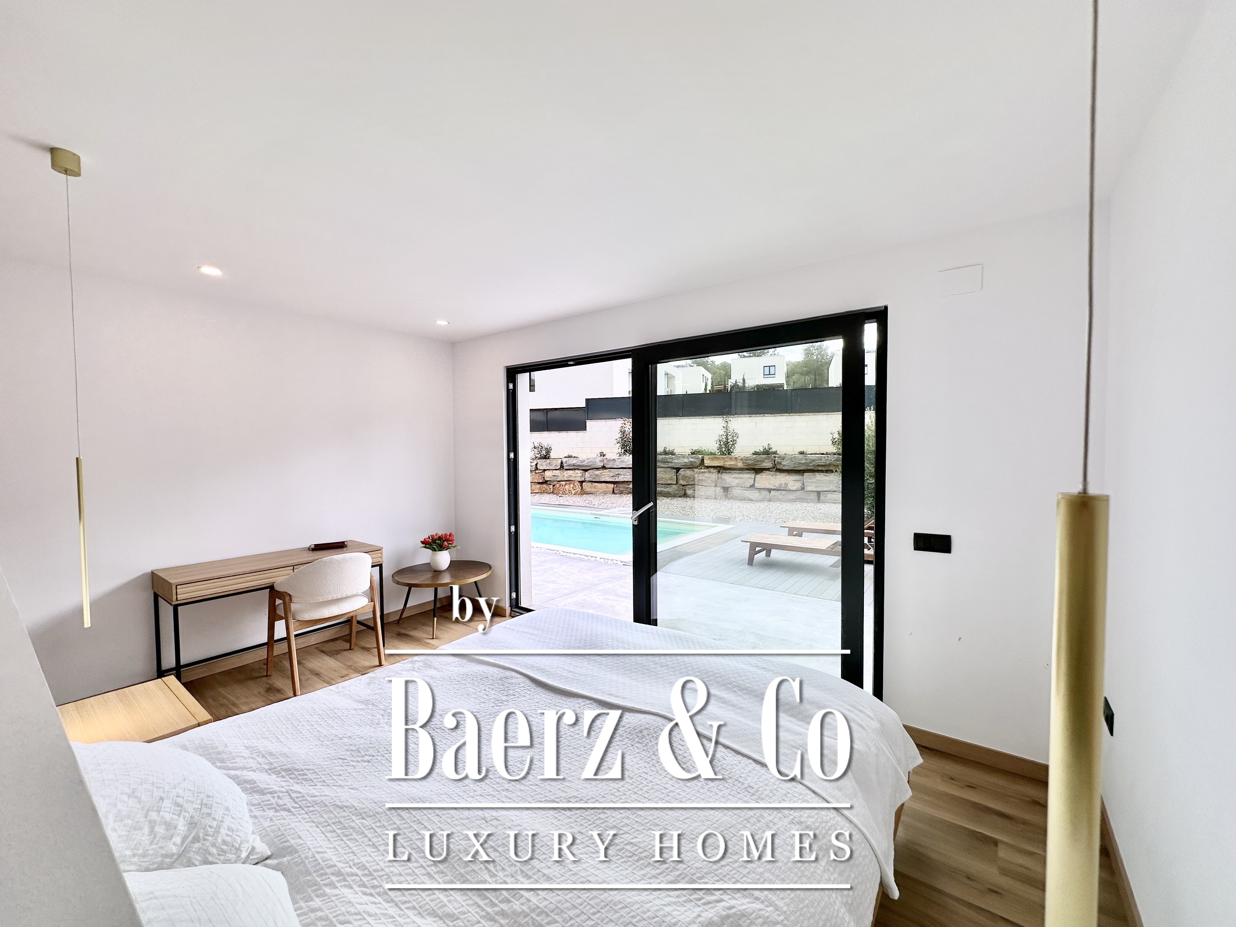 The layout is intentionally open and luminous. Floor-to-ceiling sliding glass doors in the spacious living and dining area connect seamlessly to the garden and pool, creating flow and bringing the outdoors into daily life. The modern, fully equipped kitchen is designed for both functionality and aesthetic clarity. Four bedrooms, including two en-suite, offer versatile accommodation. On the main floor, two double bedrooms share a full bath and open directly towards the pool, while the master suite features its own dressing room and private bathroom with garden views. On the lower floor, a guest suite and two large multipurpose rooms adapt to leisure, fitness, or work, alongside parking for two cars.