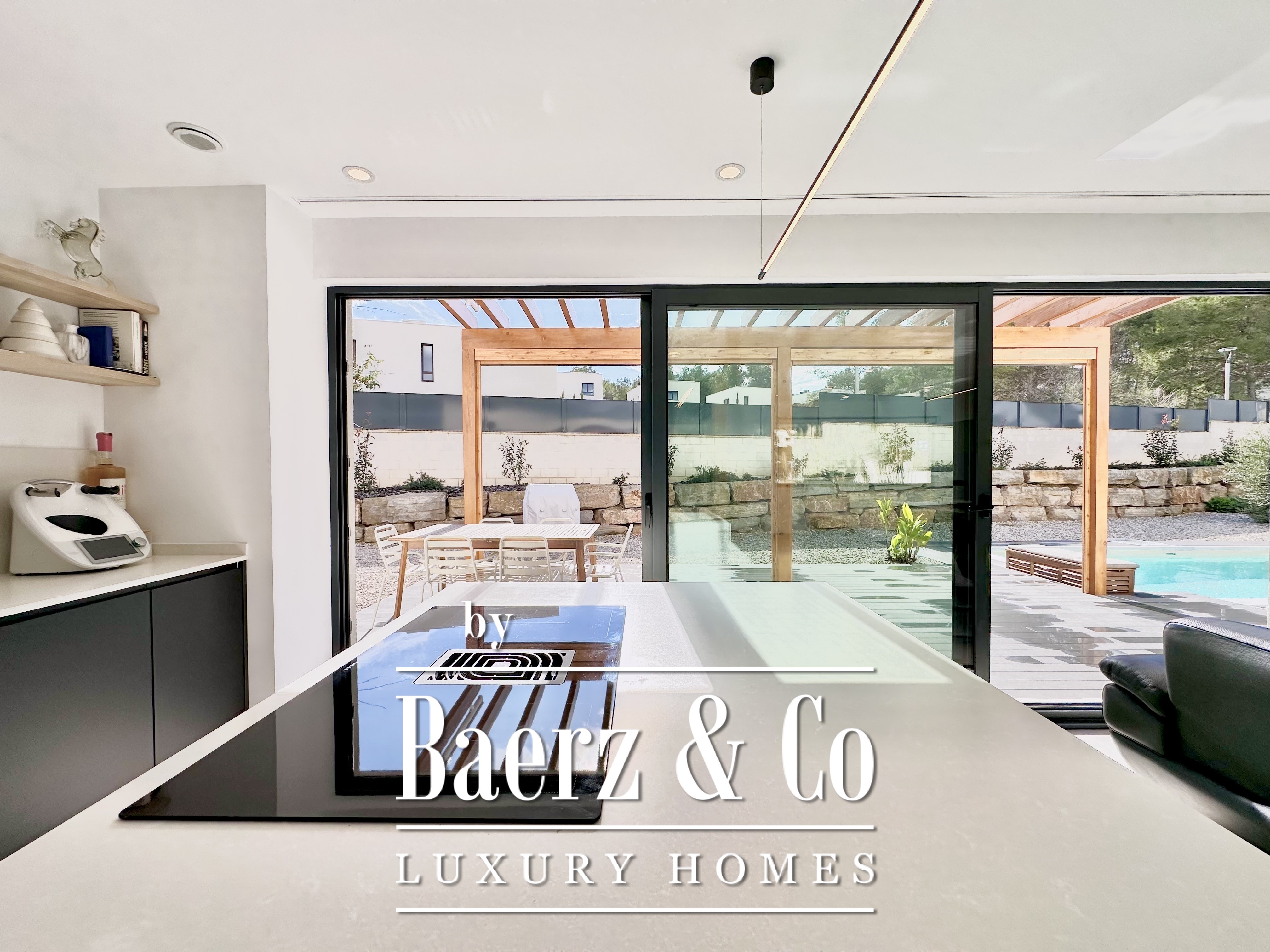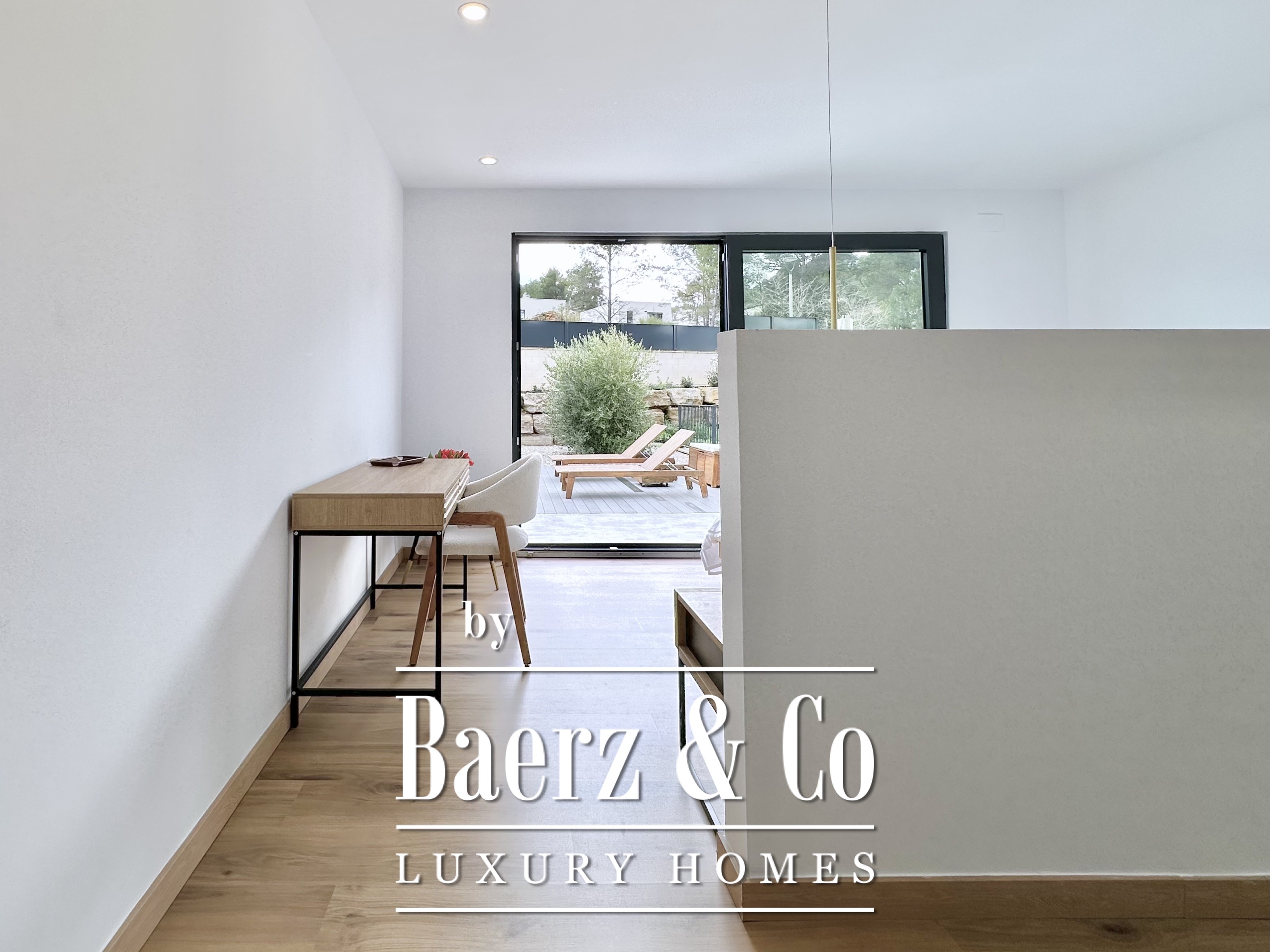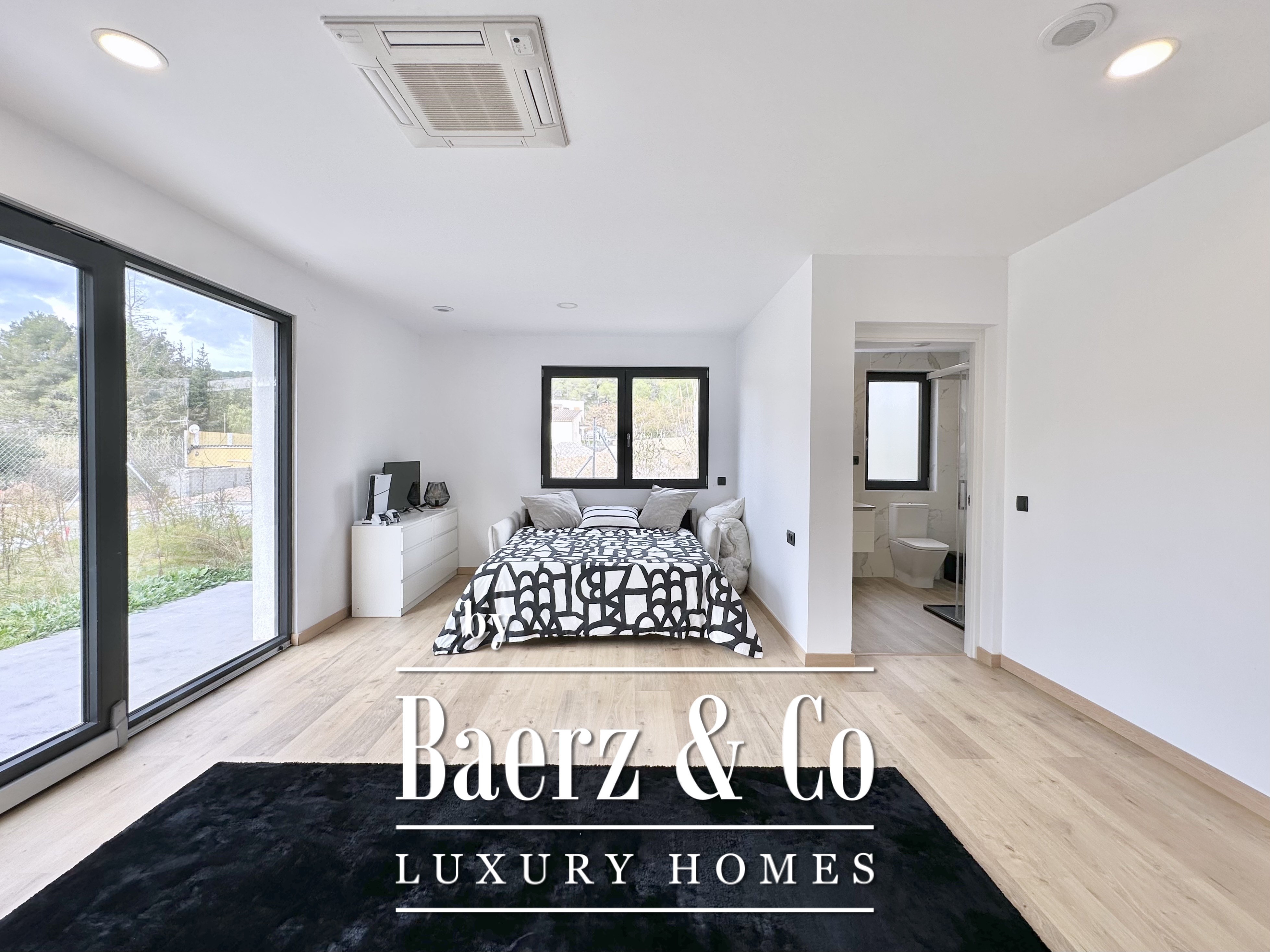 The layout is intentionally open and luminous. Floor-to-ceiling sliding glass doors in the spacious living and dining area connect seamlessly to the garden and pool, creating flow and bringing the outdoors into daily life. The modern, fully equipped kitchen is designed for both functionality and aesthetic clarity. Four bedrooms, including two en-suite, offer versatile accommodation. On the main floor, two double bedrooms share a full bath and open directly towards the pool, while the master suite features its own dressing room and private bathroom with garden views. On the lower floor, a guest suite and two large multipurpose rooms adapt to leisure, fitness, or work, alongside parking for two cars.