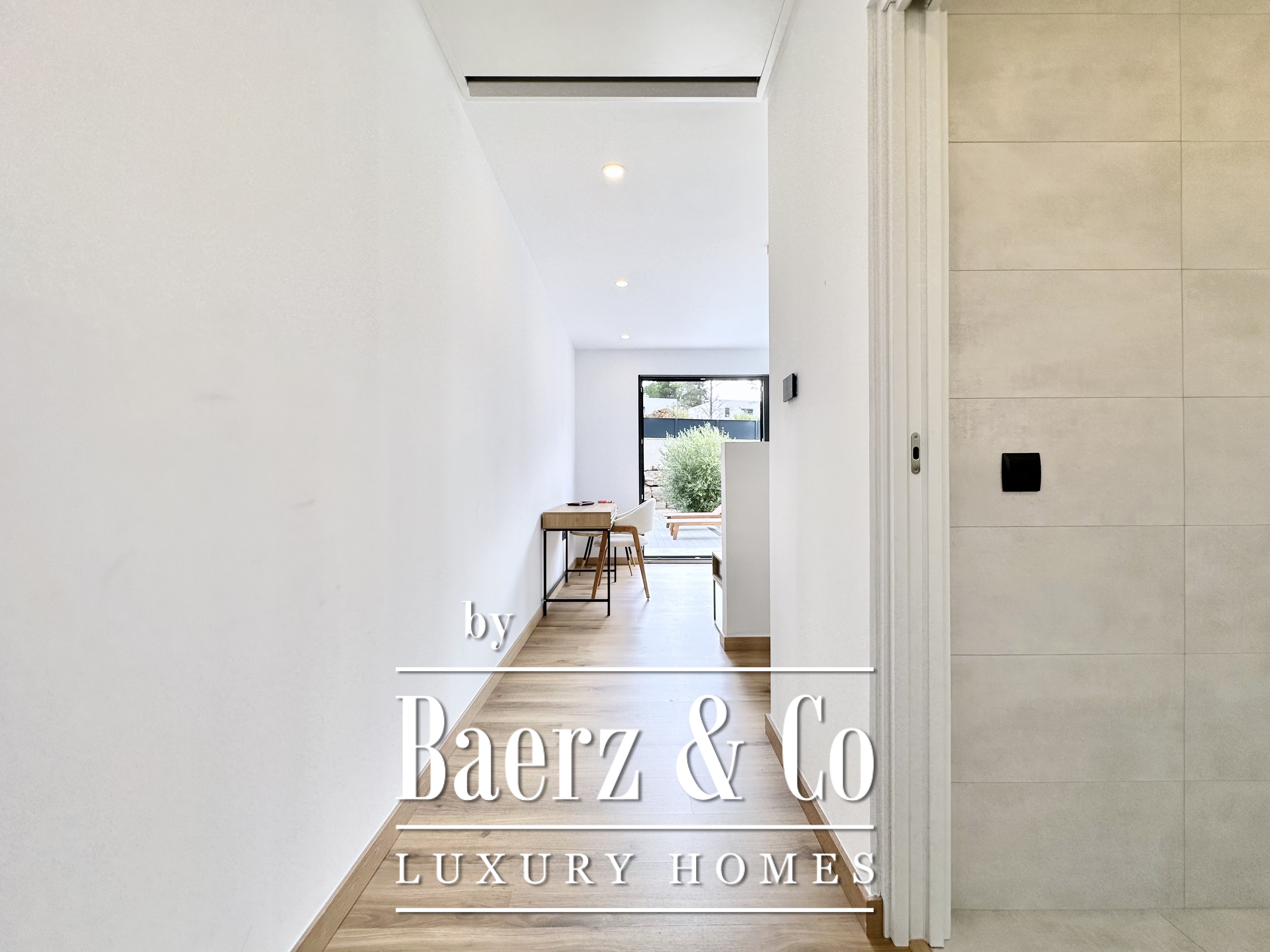 Constructed in 2023 following rigorous Passivhaus criteria, the villa achieves energy class A. It features an aerothermal system, photovoltaic panels, and superior wall insulation with a thermal transmittance of 0.12 W/m²K, as well as double-glazed, argon-filled windows and full blind coverage in every room. The result is year-round thermal comfort, near-silent interiors, and exceptionally low energy use.