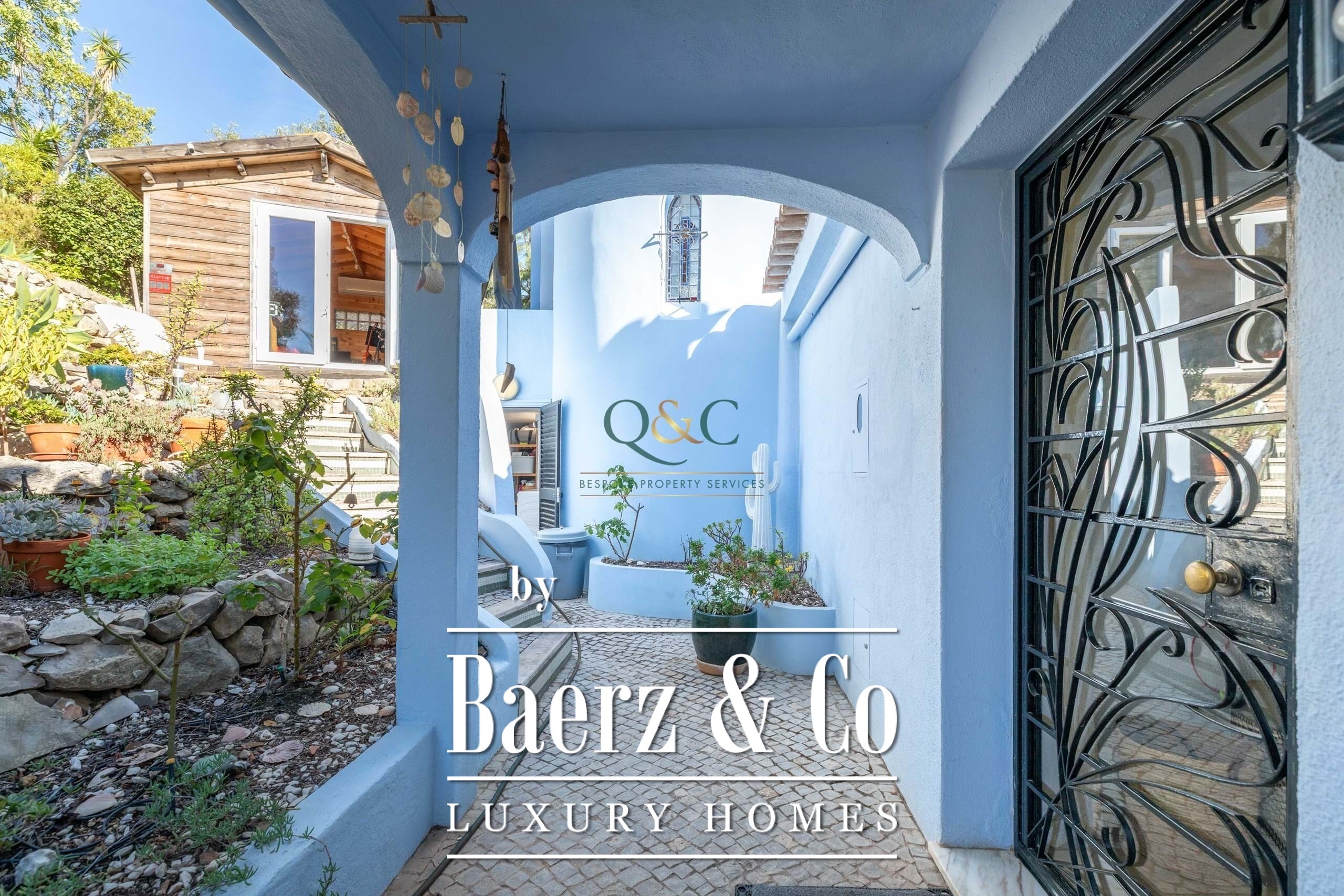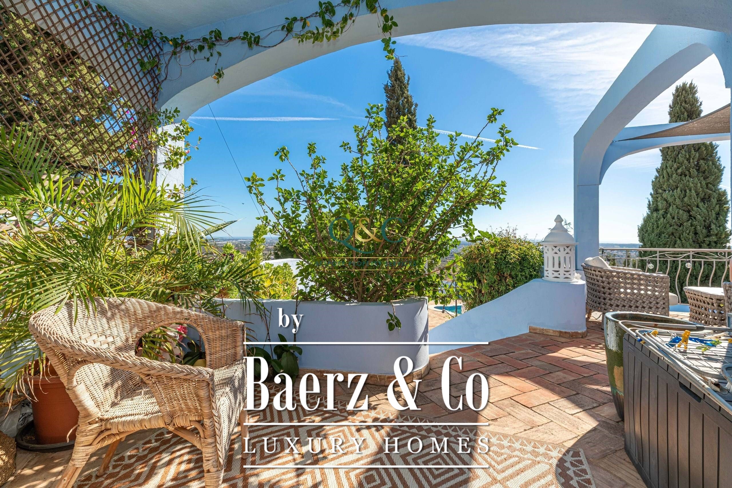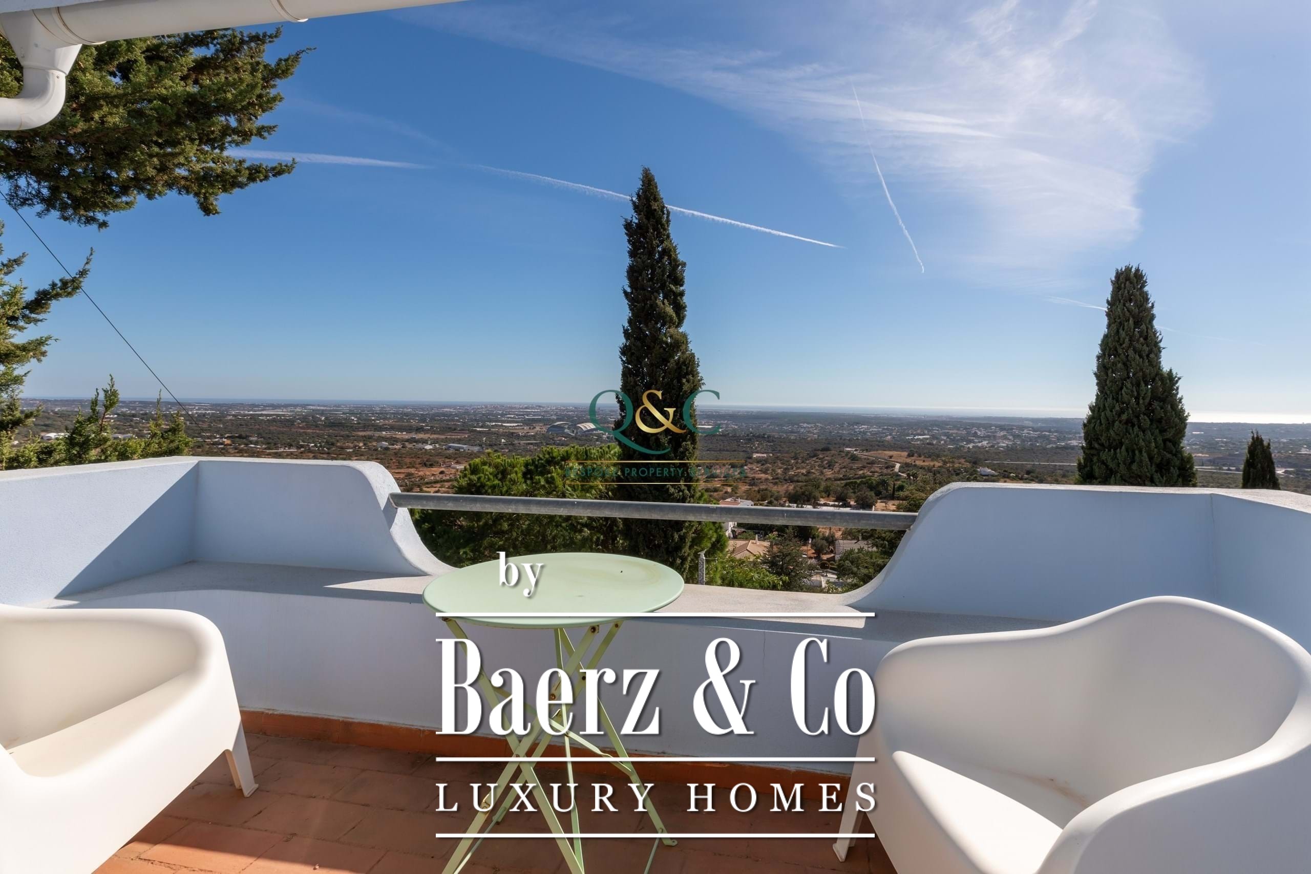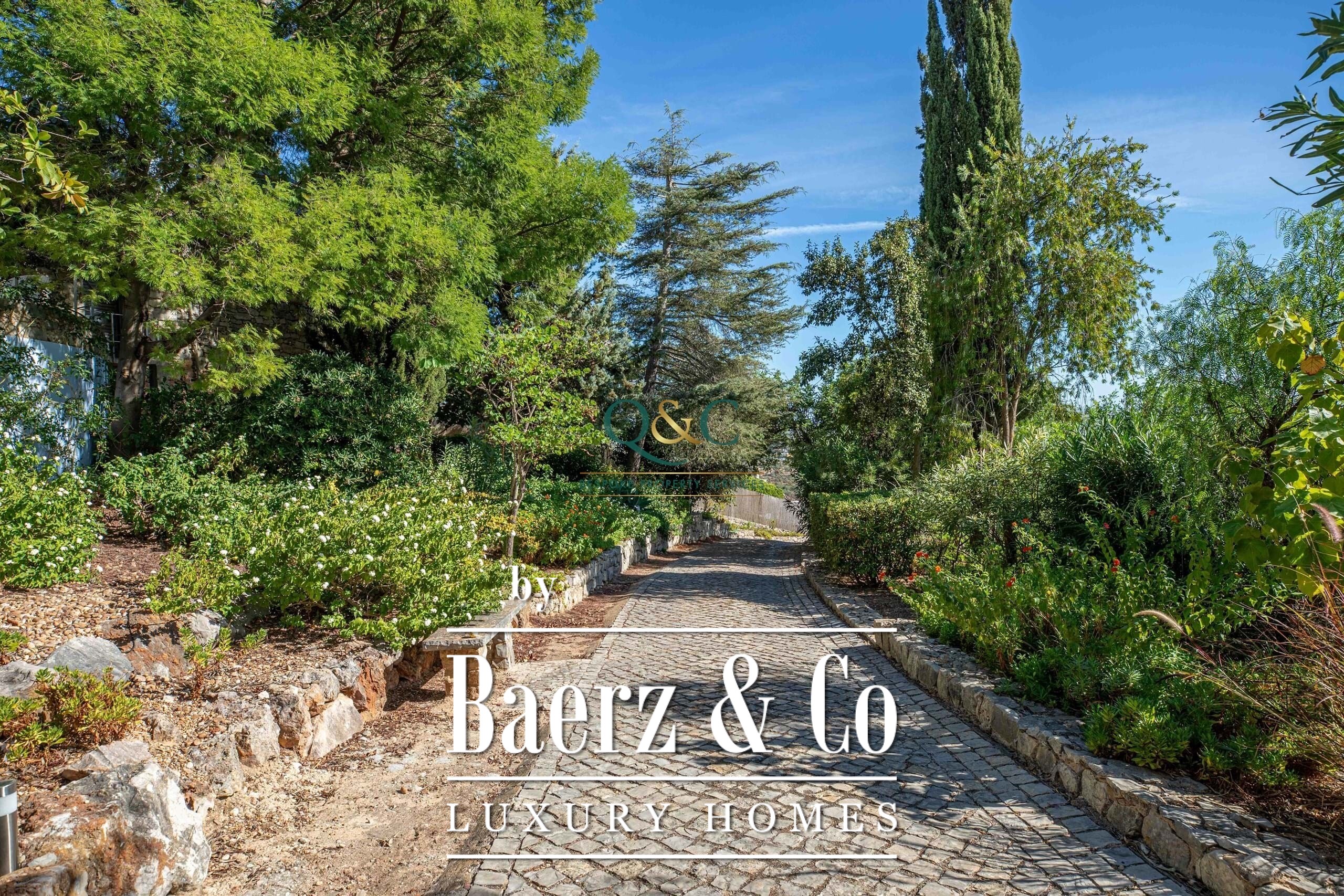 Villa Santa Bárbara de Nexe sits in an elevated, south-facing position, offering uninterrupted ocean and countryside views that frame the essence of Algarve living. This villa is set within a fully fenced 2,600 m² plot, accessed through electric gates that reveal mature gardens, a calcada driveway, and discreet parking including a garage and carport.
