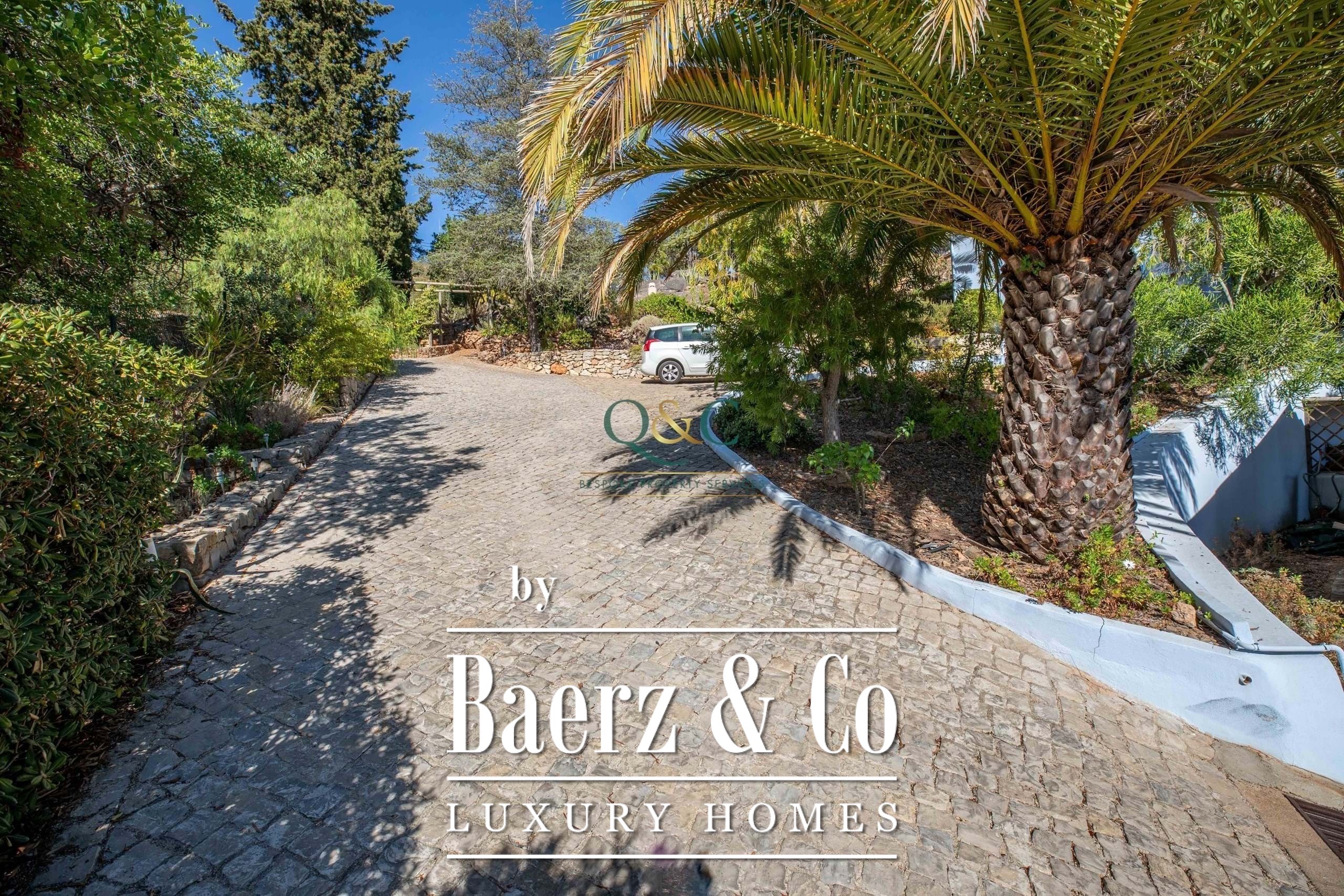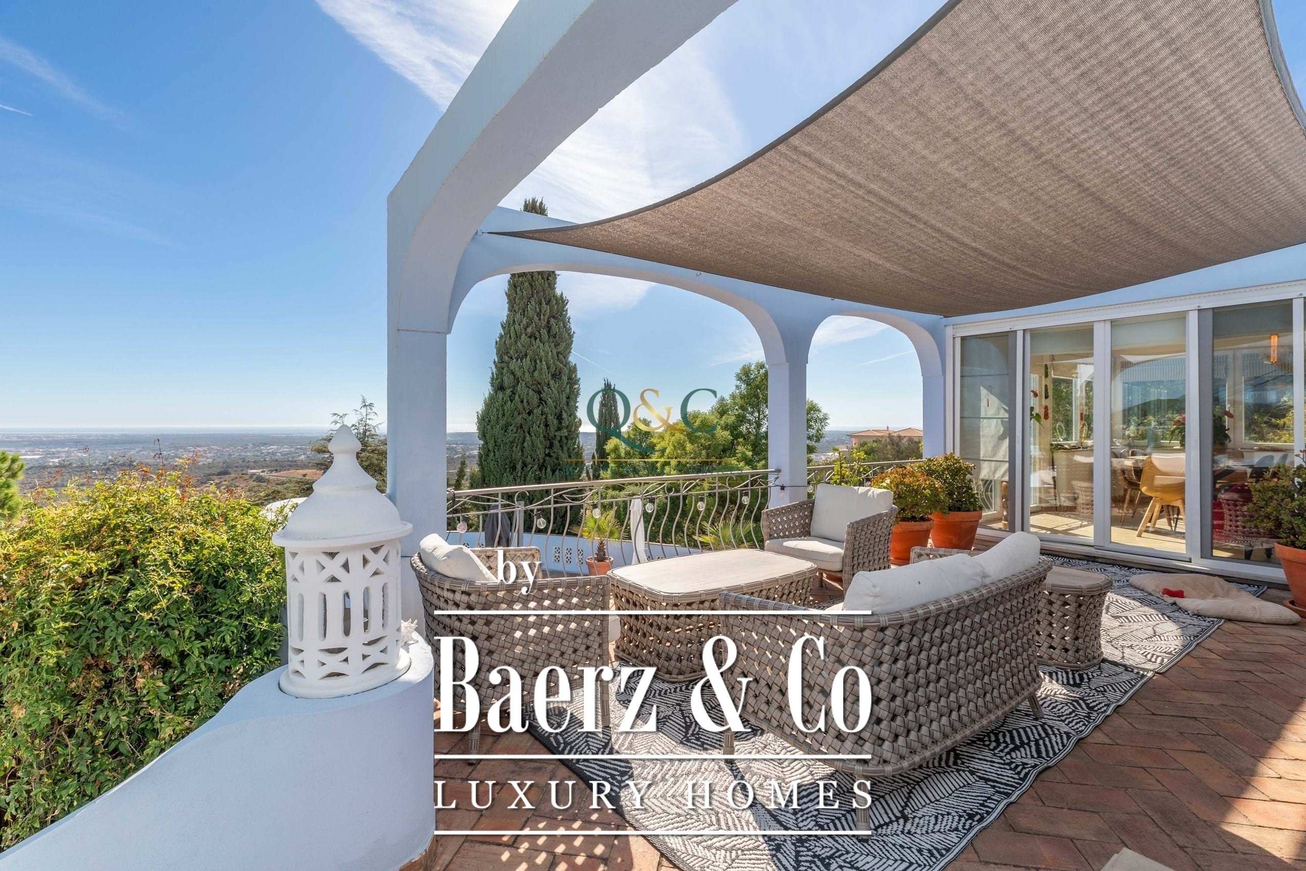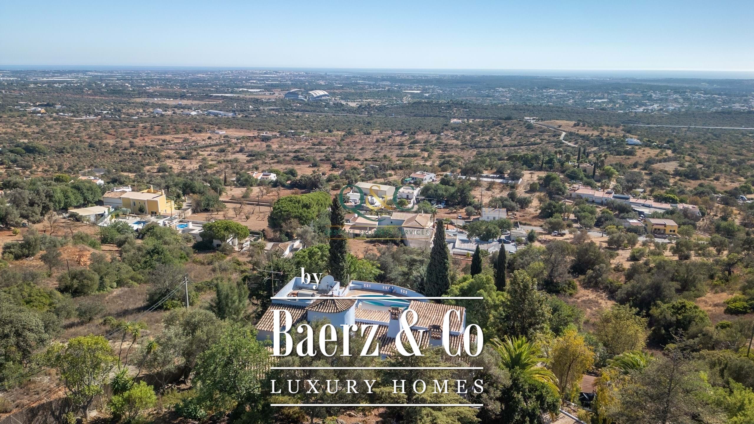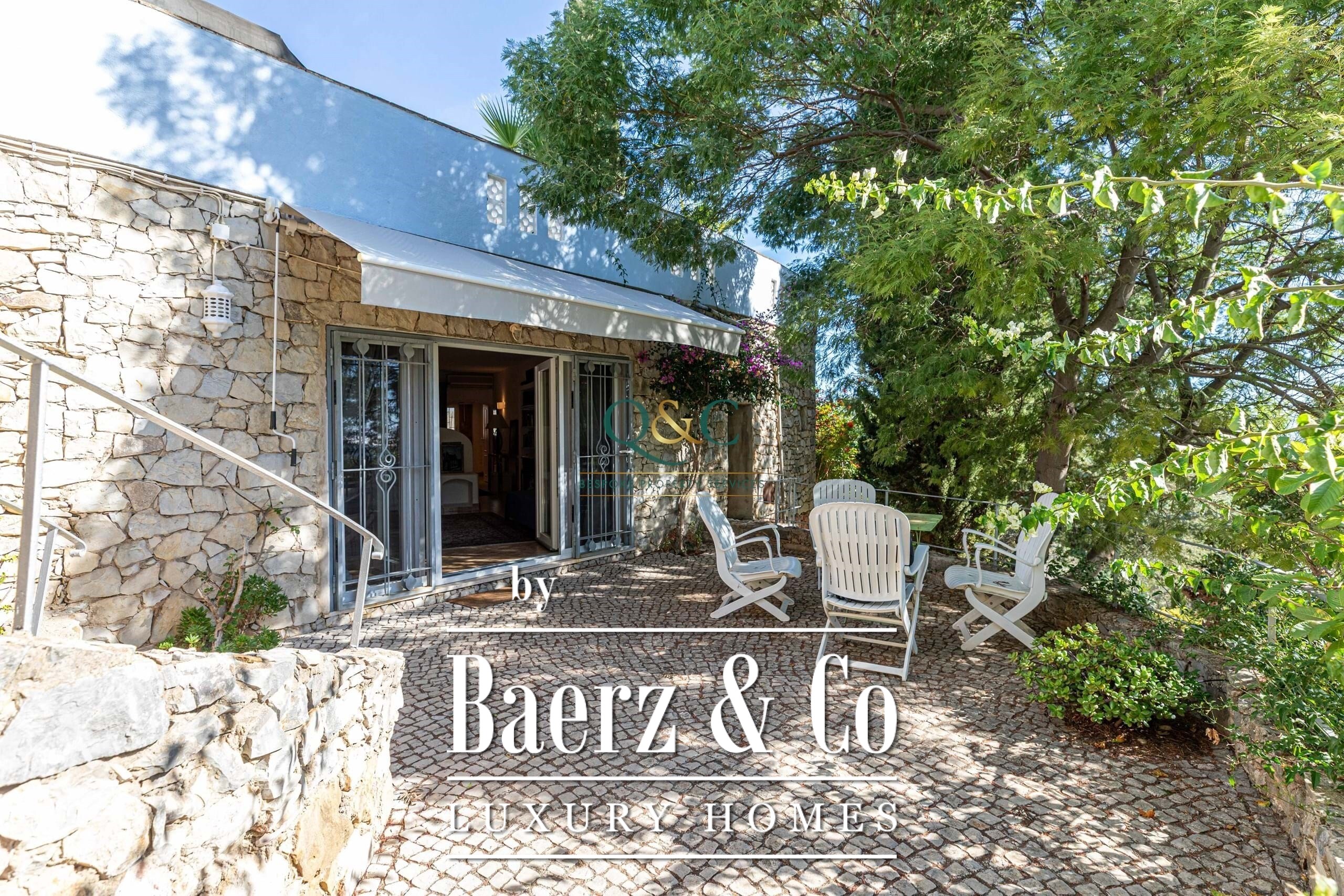 Villa Santa Bárbara de Nexe sits in an elevated, south-facing position, offering uninterrupted ocean and countryside views that frame the essence of Algarve living. This villa is set within a fully fenced 2,600 m² plot, accessed through electric gates that reveal mature gardens, a calcada driveway, and discreet parking including a garage and carport.