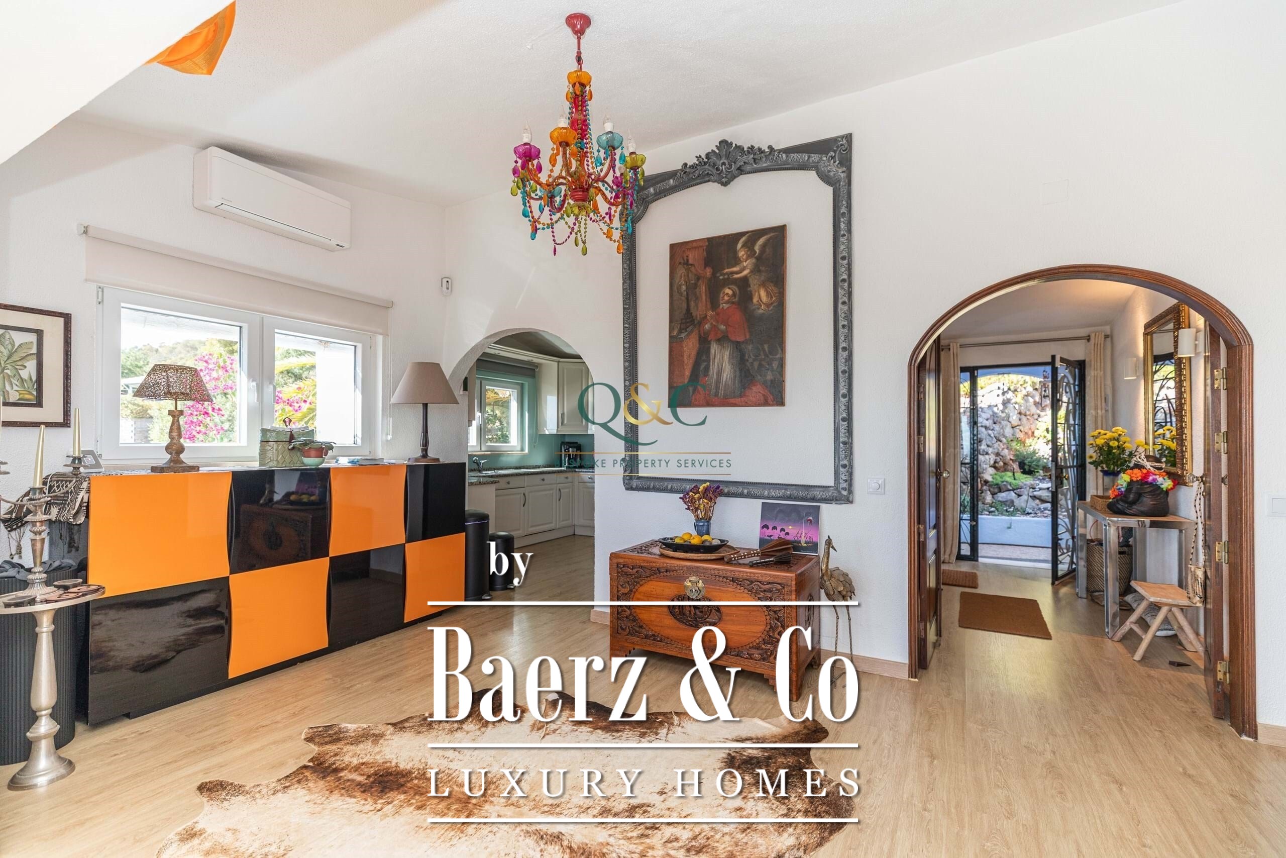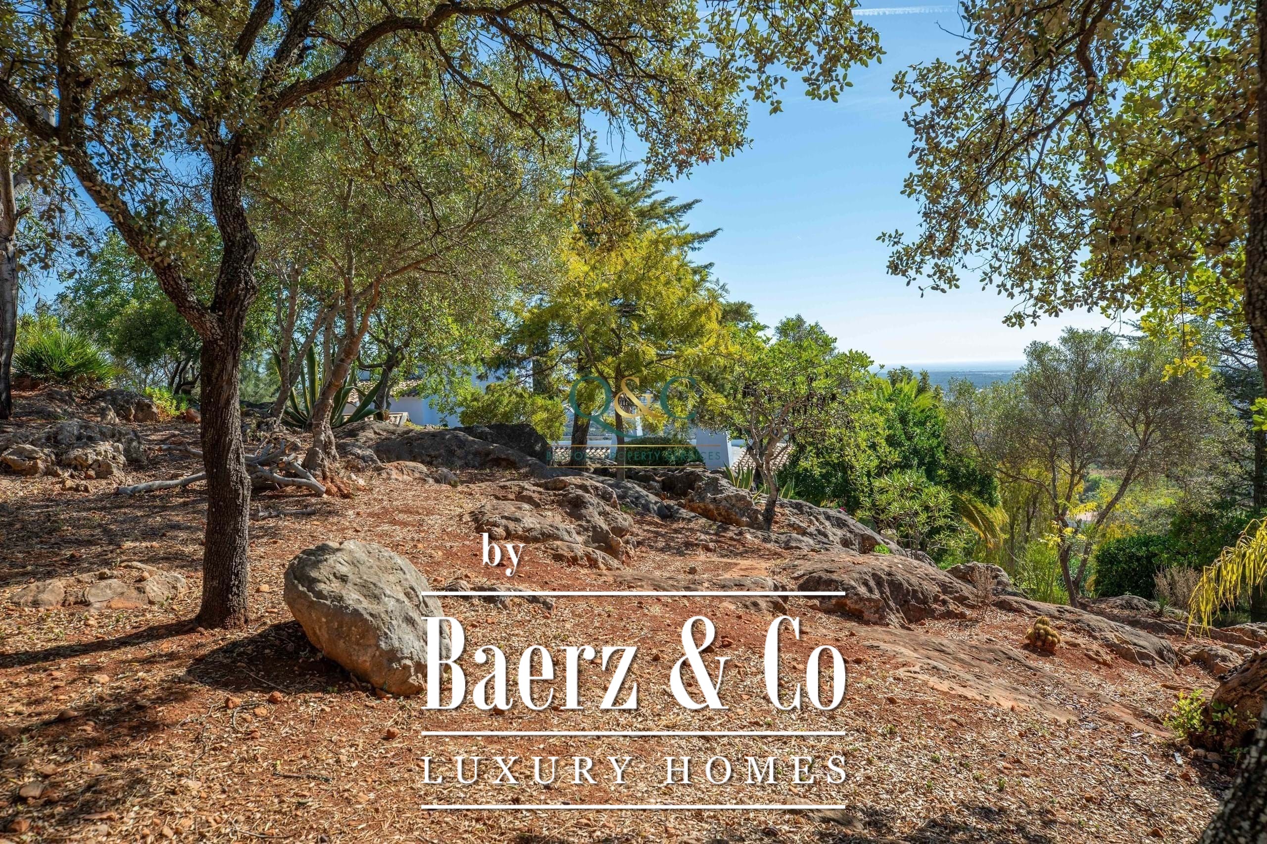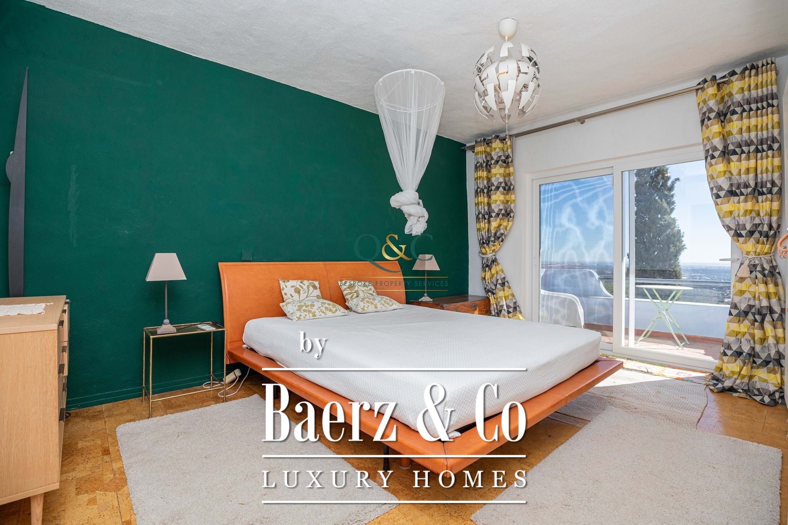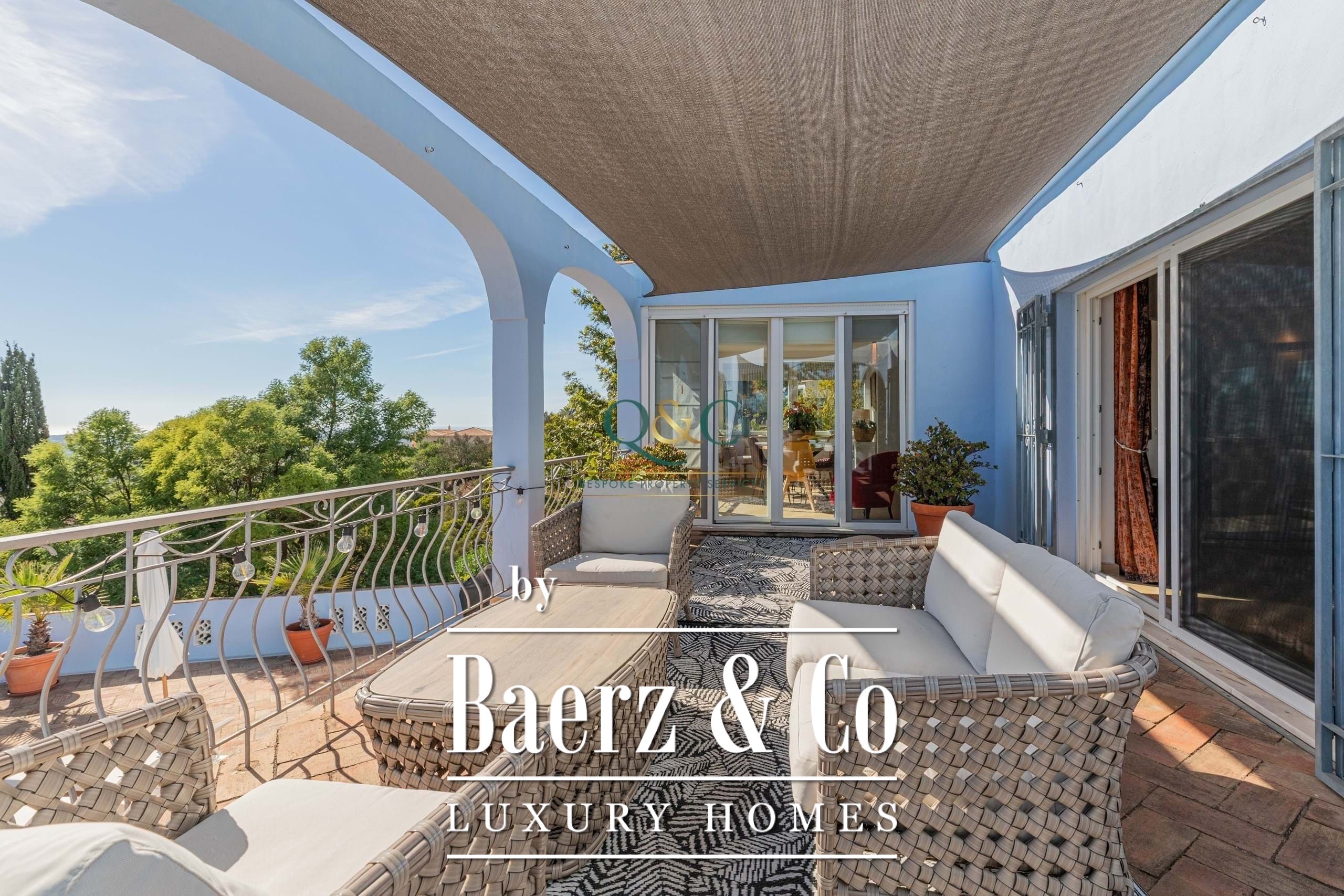 Villa Santa Bárbara de Nexe sits in an elevated, south-facing position, offering uninterrupted ocean and countryside views that frame the essence of Algarve living. This villa is set within a fully fenced 2,600 m² plot, accessed through electric gates that reveal mature gardens, a calcada driveway, and discreet parking including a garage and carport.