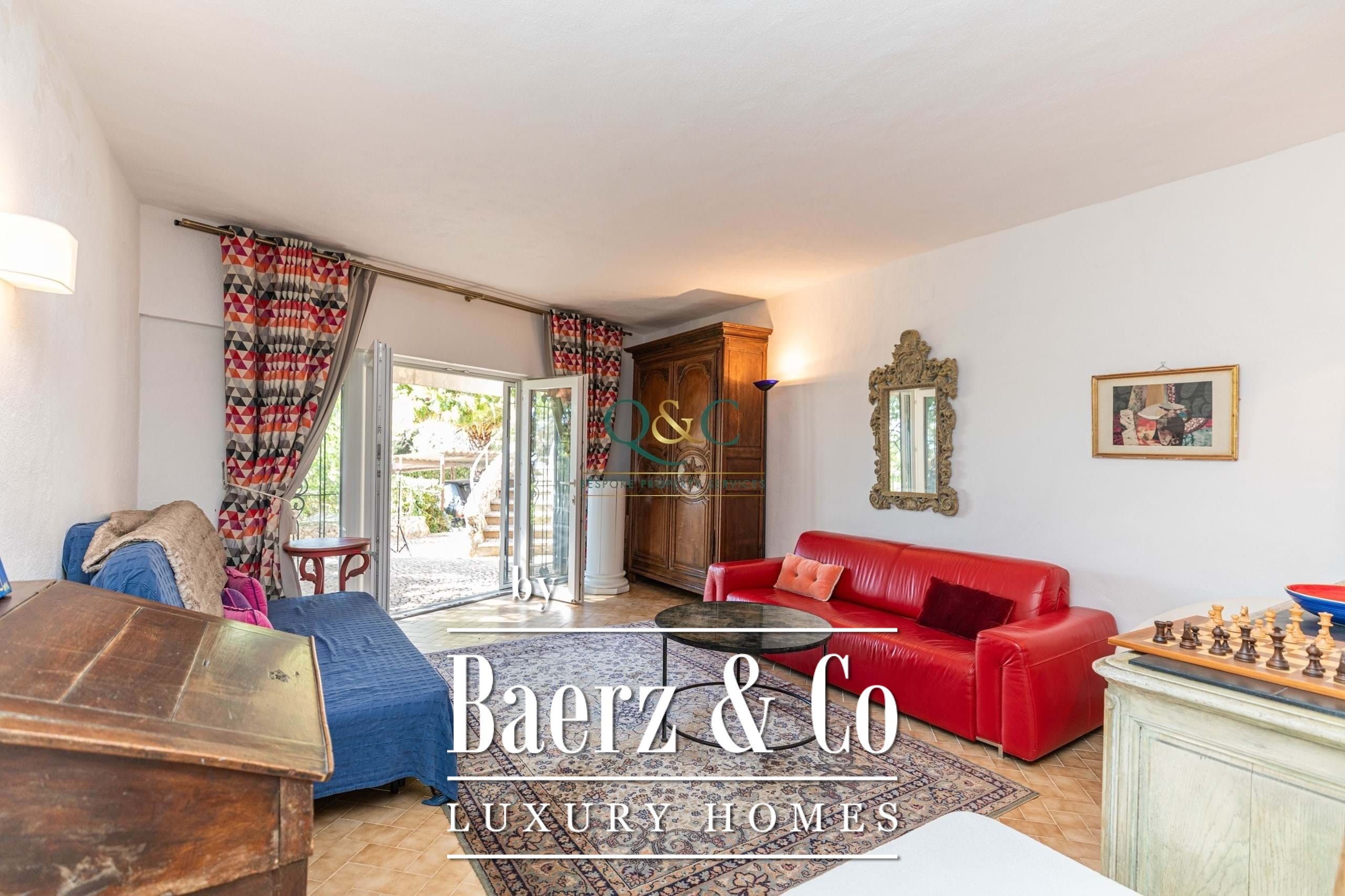 The main residence encompasses 292 m² over two levels, balancing traditional character with thoughtful contemporary updates. The generous living area, distinguished by a fireplace and panoramic outlook, flows to an equipped kitchen and extends naturally onto a covered terrace. This outdoor space, ideal for both sunrise and sunset, overlooks landscaped grounds with drought-tolerant flora and a serene swimming pool area shaded by mature trees.