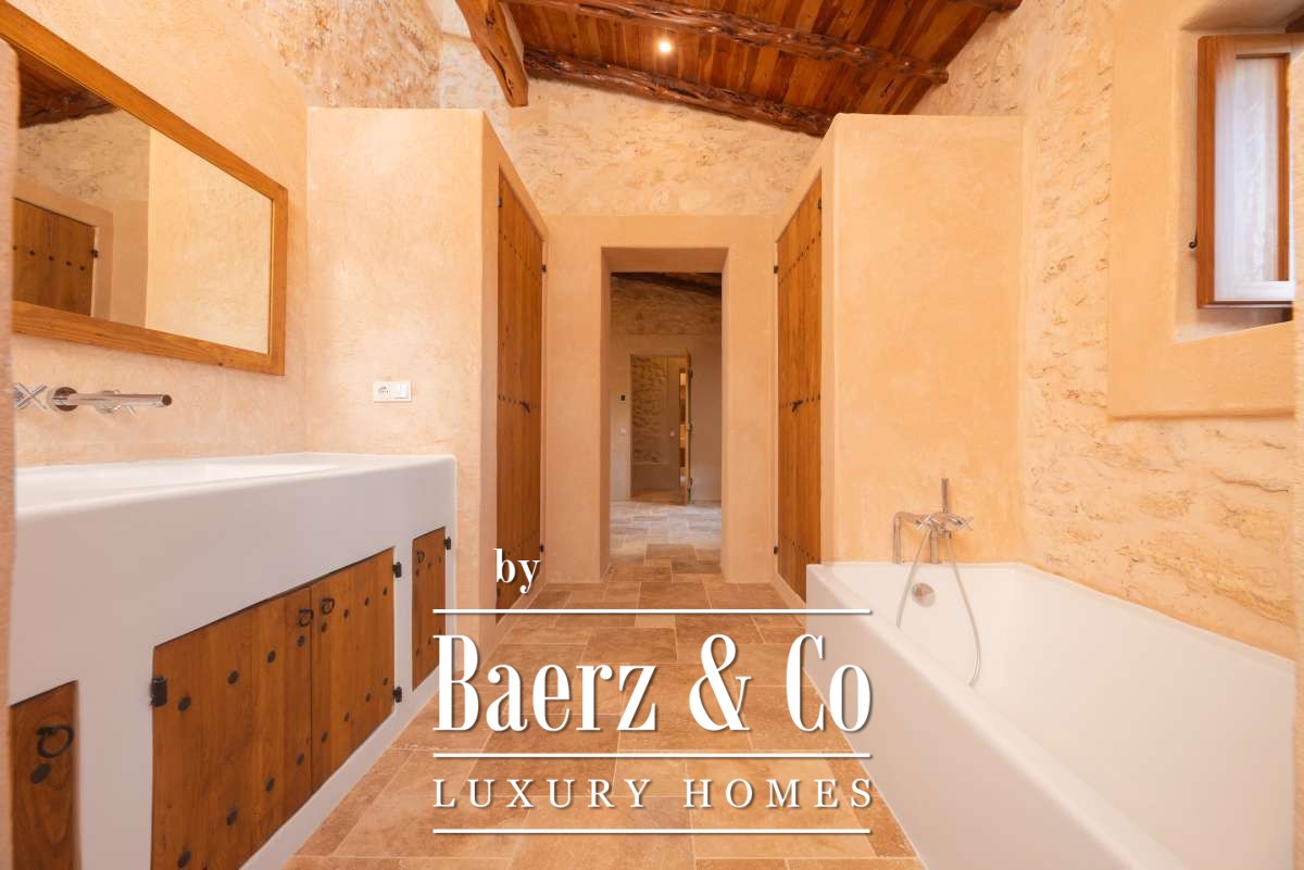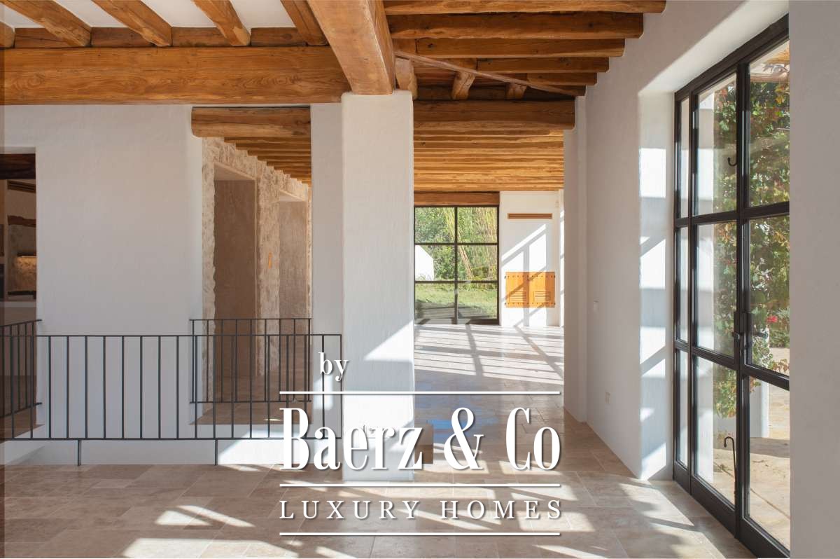 The recently renovated finca blends historic character with contemporary finesse. Every detail of the 620 m² residence, from exposed stone walls to soft, harmonious tones, underlines an enduring elegance. The living areas are open, inviting light and nature into each room, while the seamless integration of kitchen and lounges lends itself to both intimate gatherings and quiet reflection. Six bedrooms and five bathrooms provide refined comfort, with the master suite offering panoramic views and nightly glimpses of Dalt Vila’s illuminated skyline.