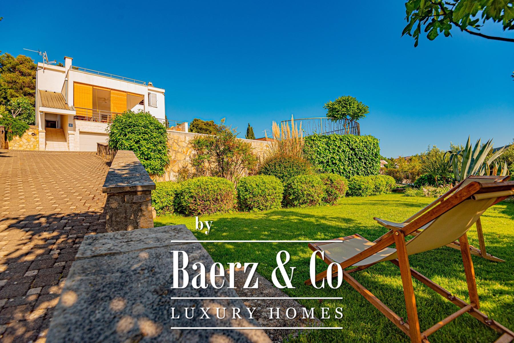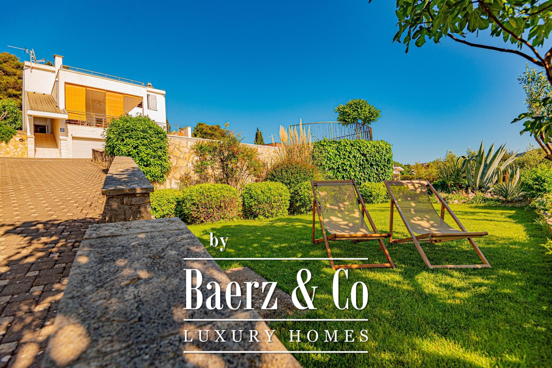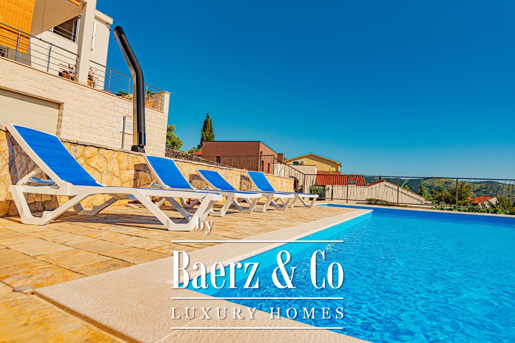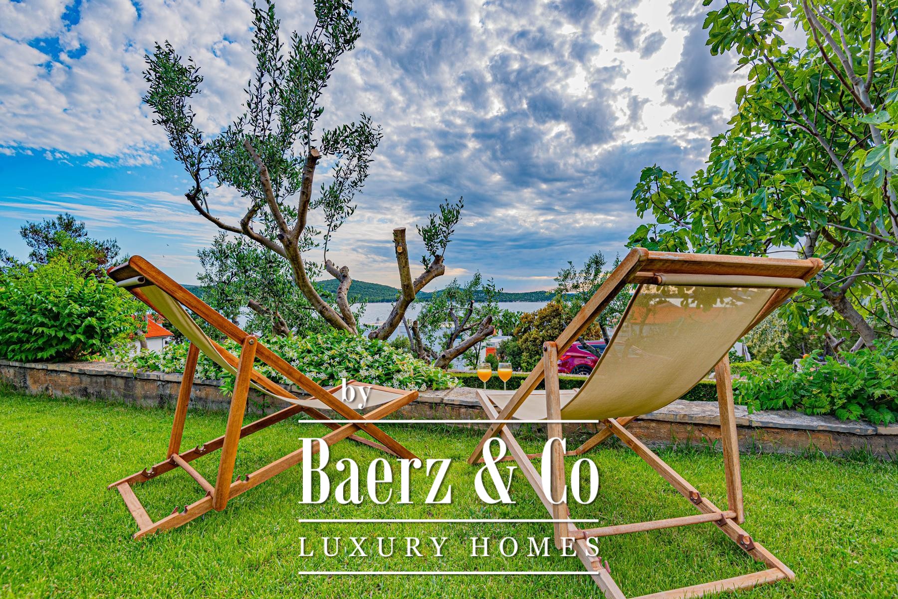 Upstairs, three bedrooms each feature private bathrooms, with two opening onto terraces that frame the seascape. Gardens embrace the house, meticulously landscaped, alongside a large pool and sunbathing area—spaces that favour tranquil afternoons and effortless entertaining. This townhouse in Šibenik offers an understated retreat amid the coastal landscape, adaptable to both relaxed family living and refined hosting.