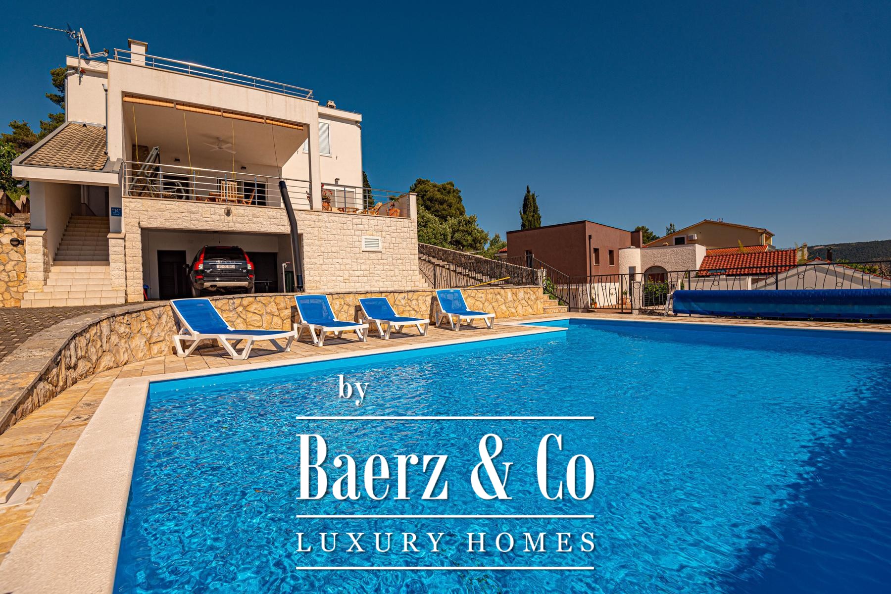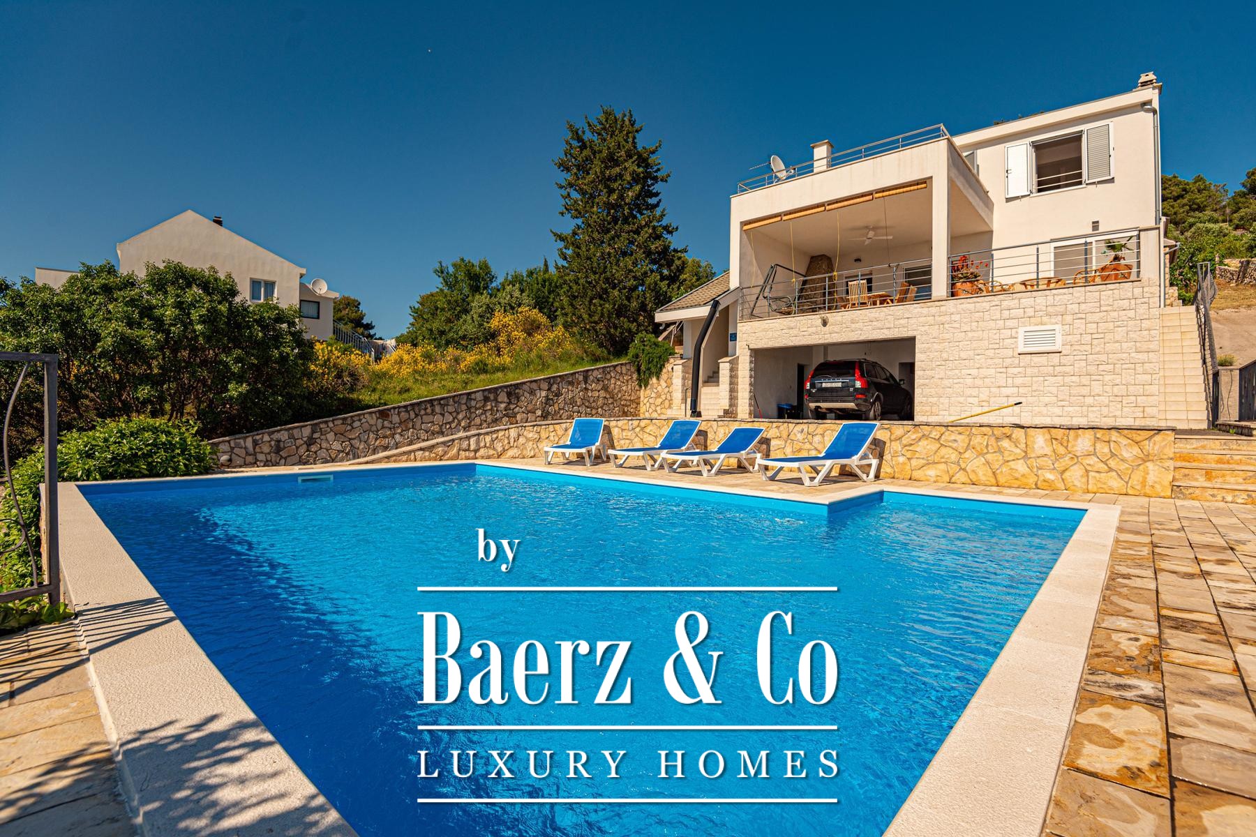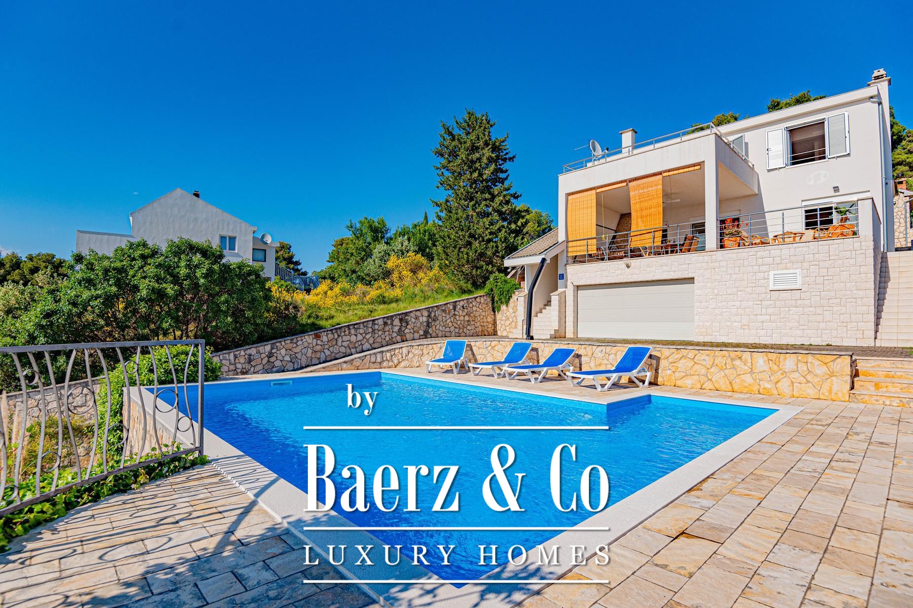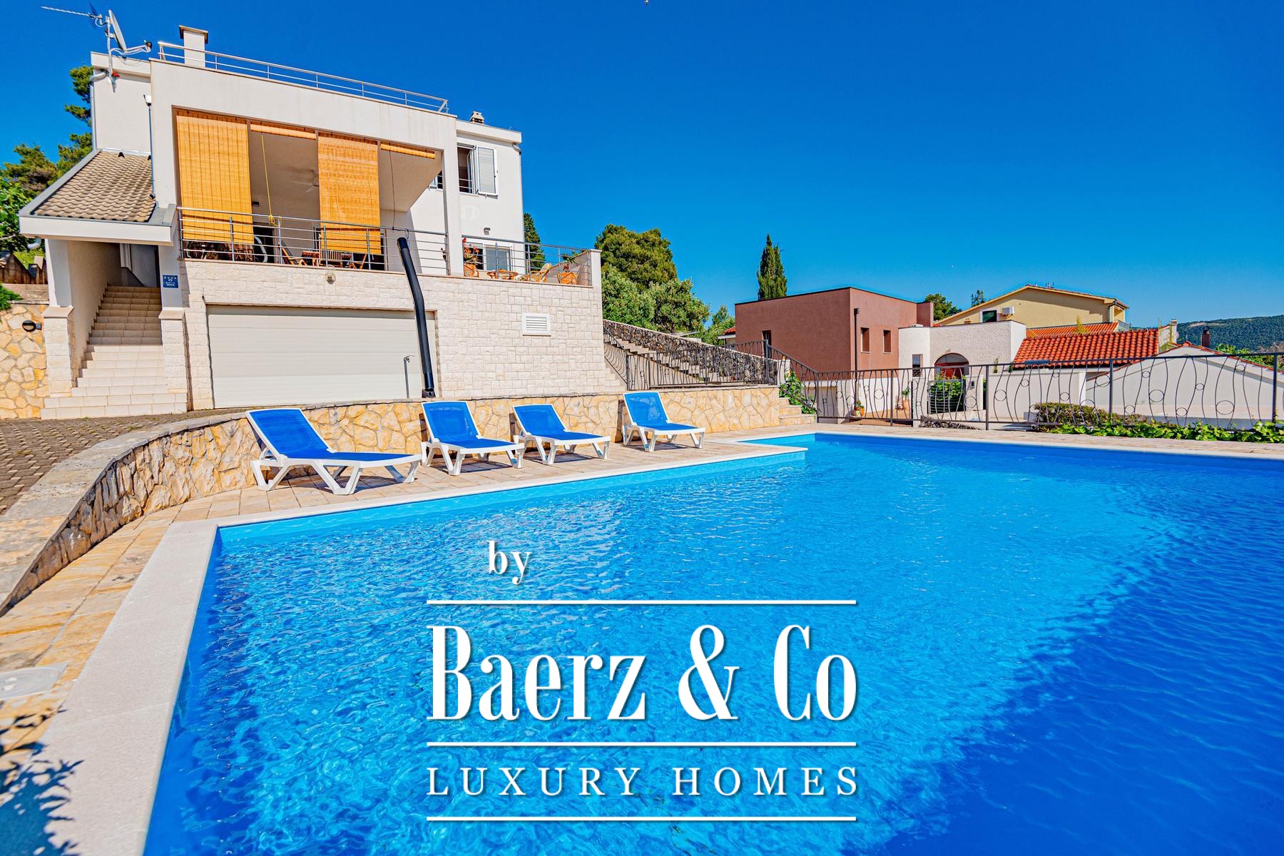 Upstairs, three bedrooms each feature private bathrooms, with two opening onto terraces that frame the seascape. Gardens embrace the house, meticulously landscaped, alongside a large pool and sunbathing area—spaces that favour tranquil afternoons and effortless entertaining. This townhouse in Šibenik offers an understated retreat amid the coastal landscape, adaptable to both relaxed family living and refined hosting.