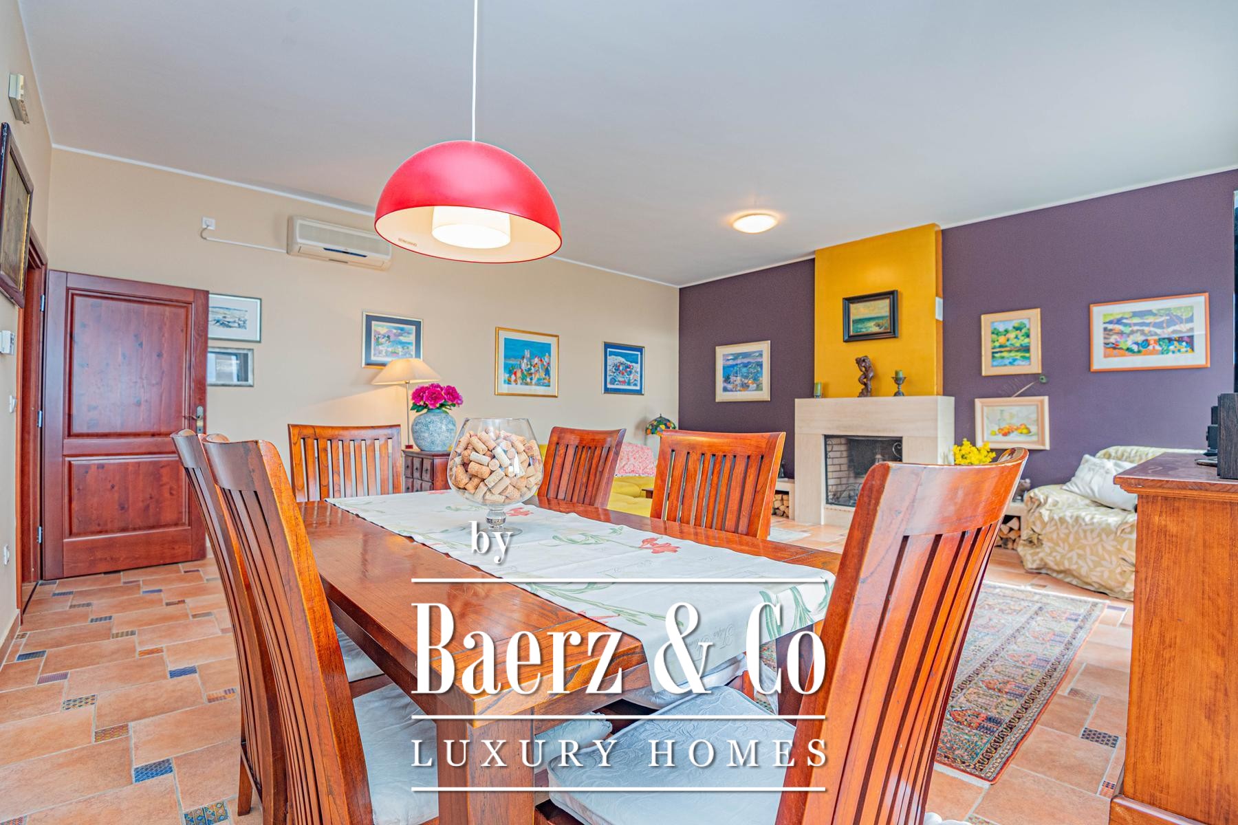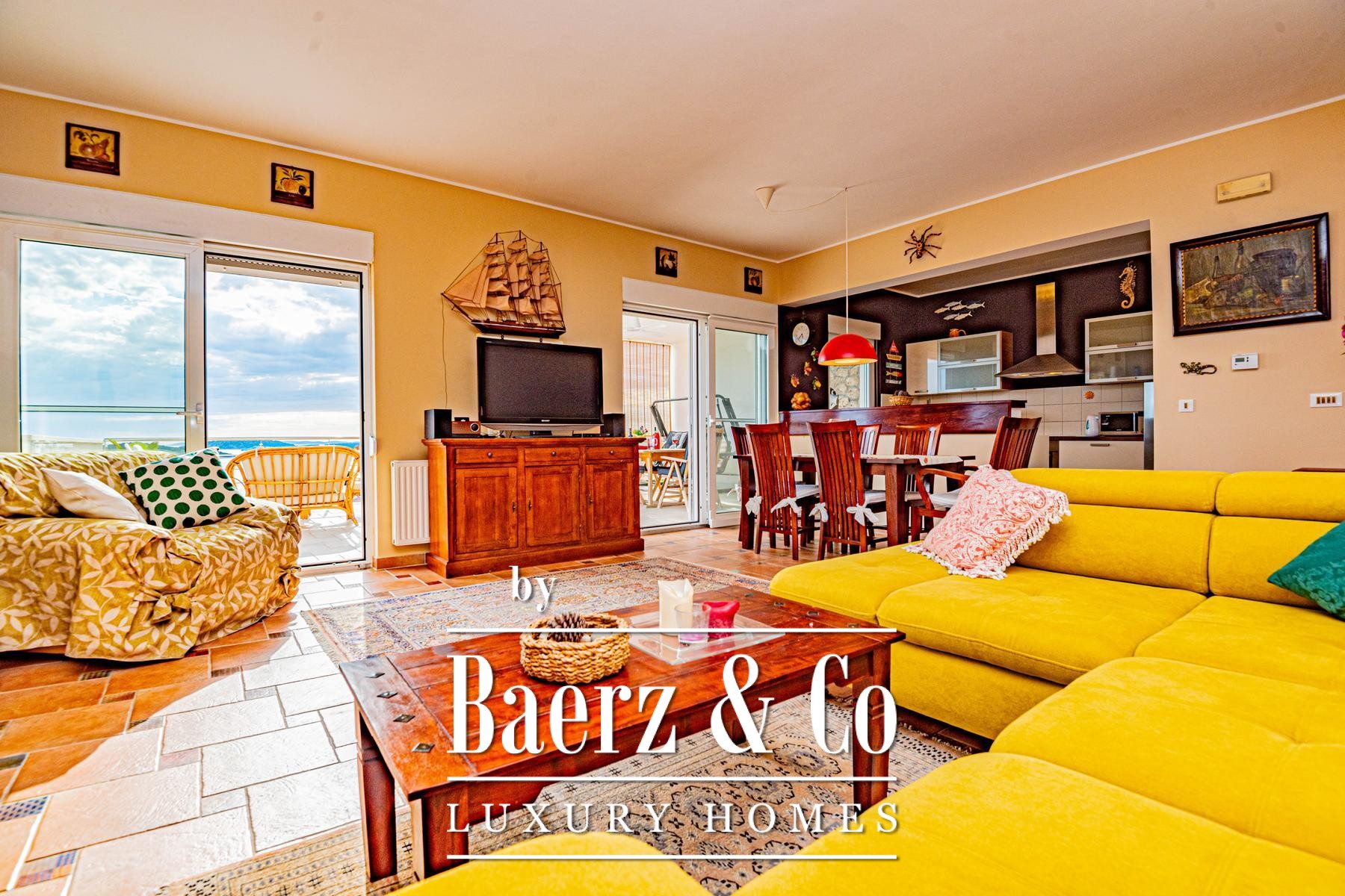 The layout invites leisure and connection. A basement level provides a garage for two cars, a tavern, two storage rooms, and a technical suite. The ground floor flows from a spacious living and dining area into a kitchen defined by light and openness, extending outward to a covered terrace where sea views and a fireplace set the tone for gatherings. Adjacent, a laundry, storage, and guest facilities quietly serve daily rhythms.