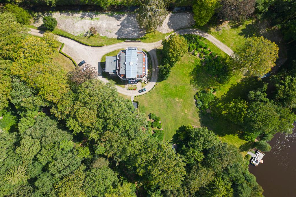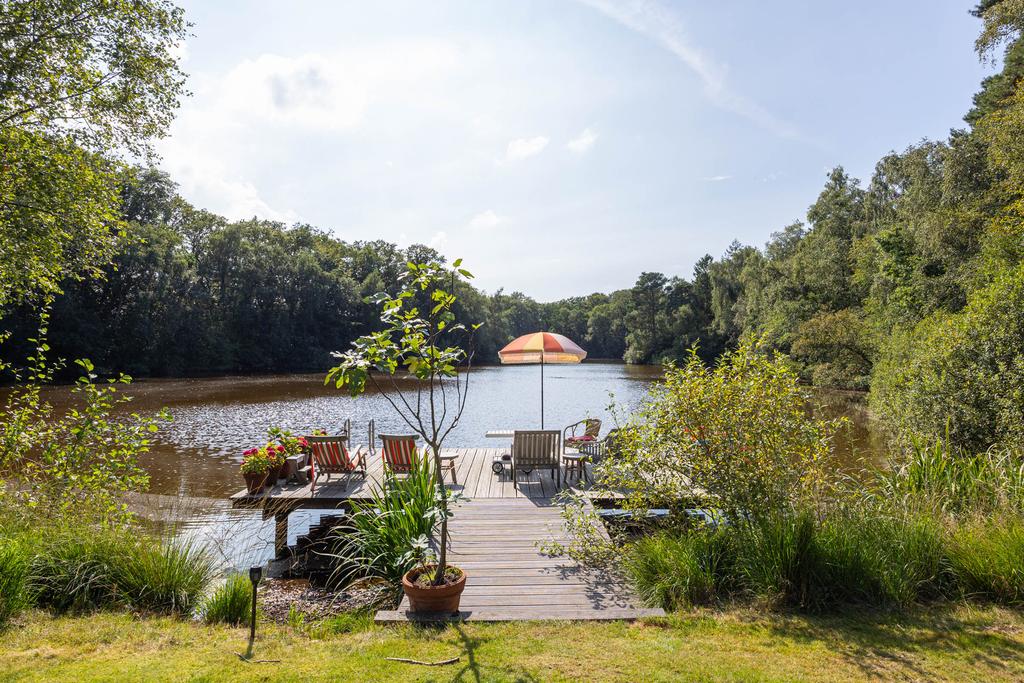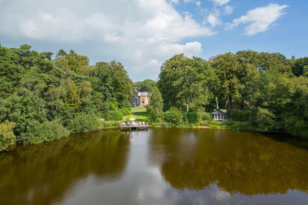 The landscaped estate extends to 5 hectares and borders the private Vegelin woodland, including a large pond. The grounds feature a terrace, a historic tea pavilion dating from circa 1900, a waterside gazebo and a carriage house with plans for conversion into additional guest accommodation or residential space with a separate driveway.