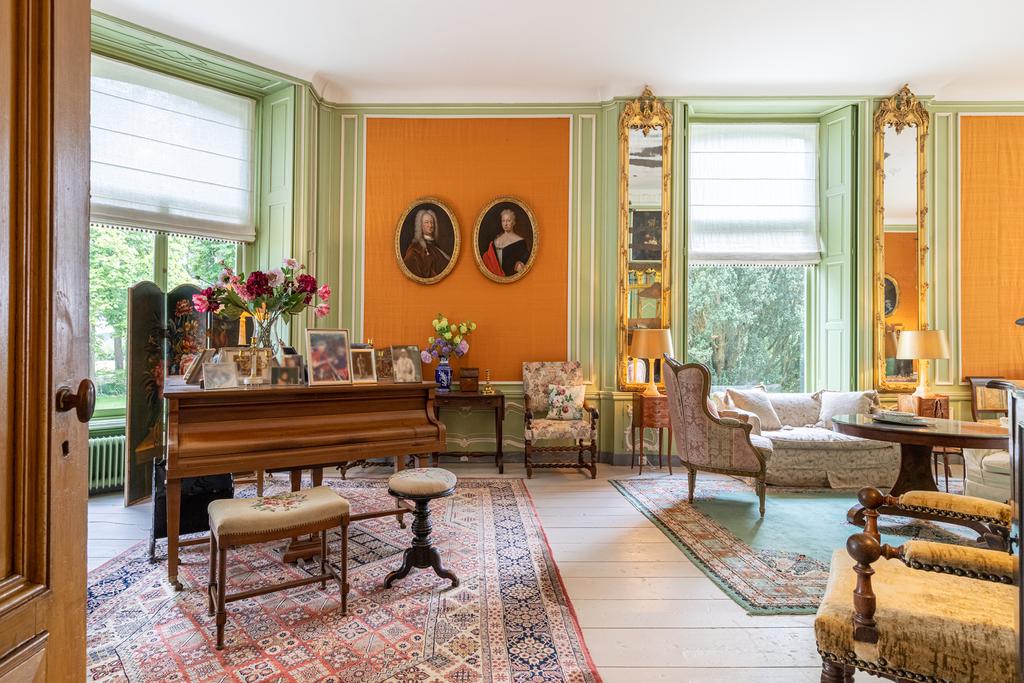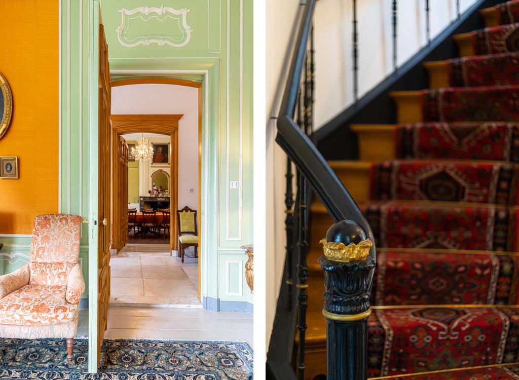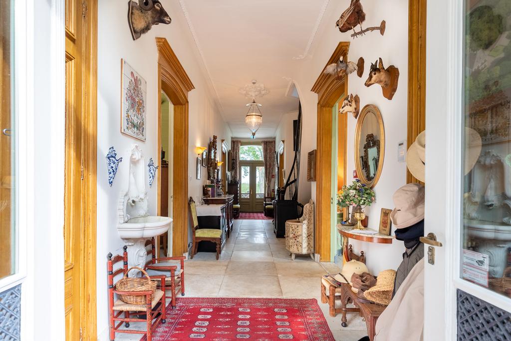 The interior is rich in period details, including ornate fireplaces, damask wall coverings, refined staircases and bespoke finishes.