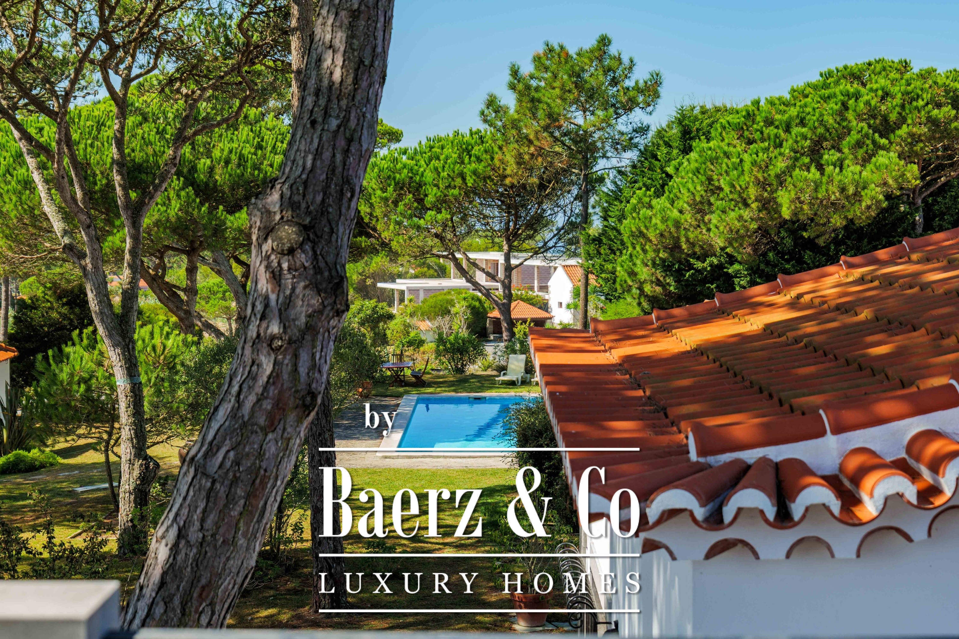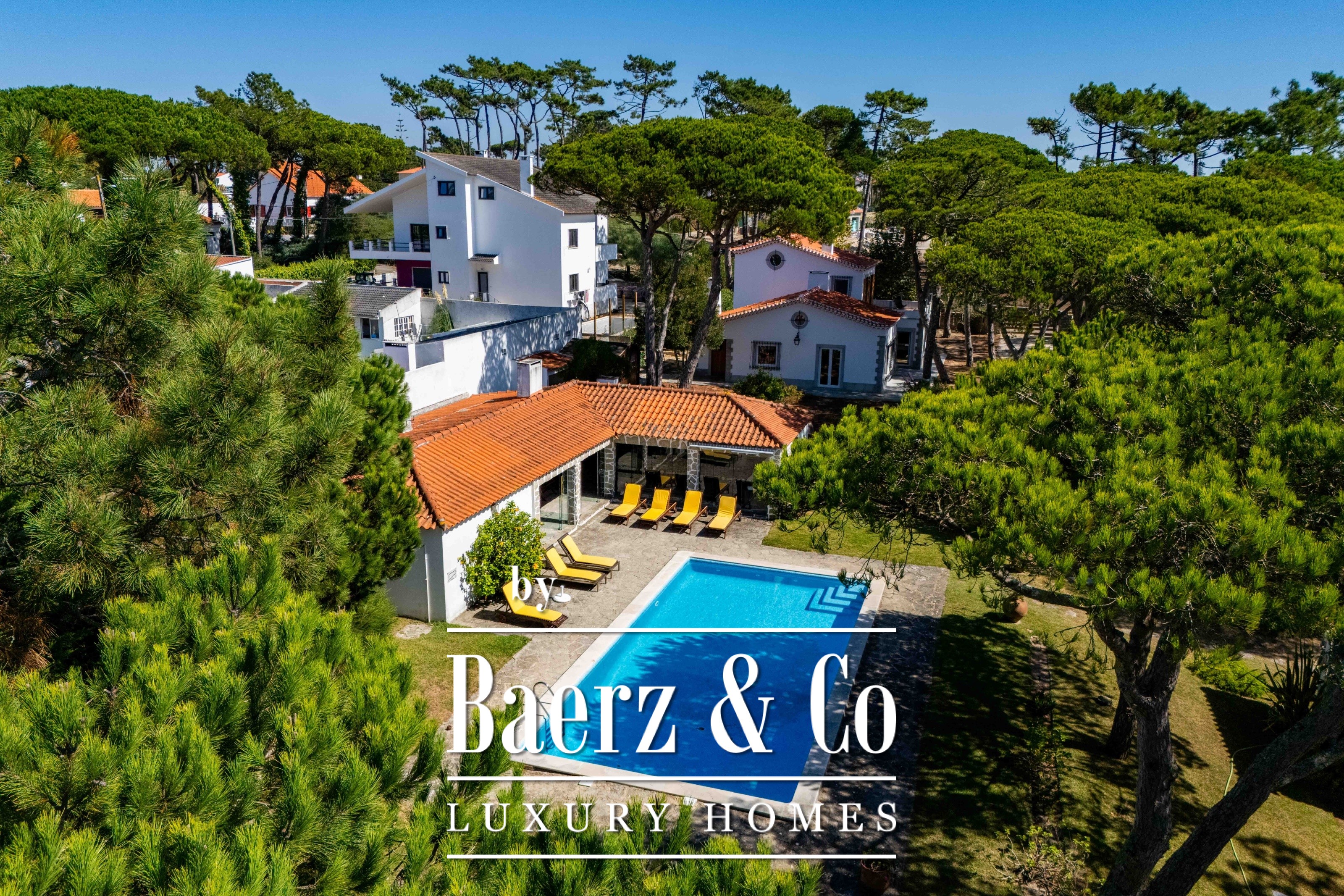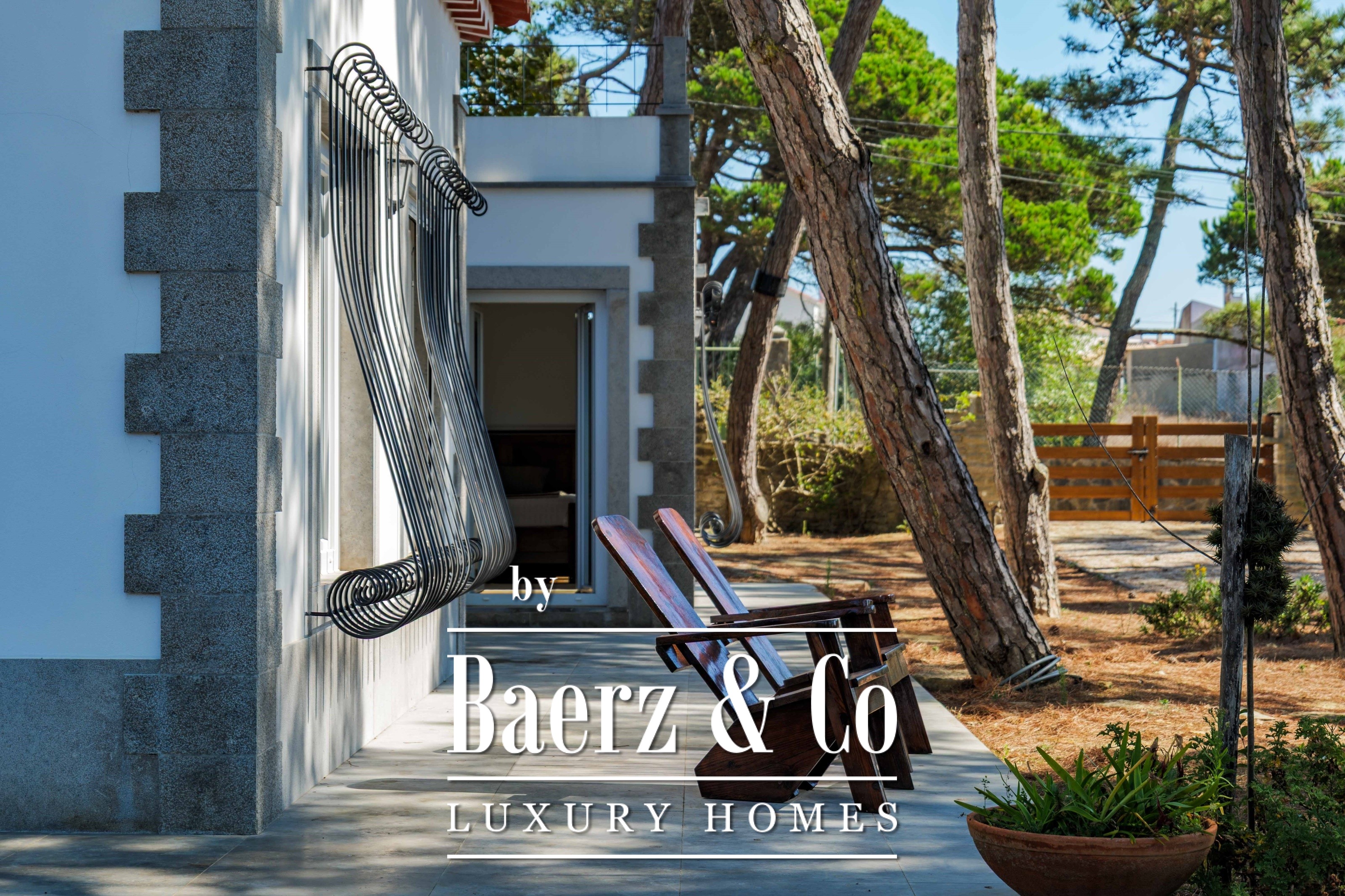 Villa Sintra with garden and sea views blends twentieth-century Portuguese architecture with contemporary sophistication. Set on 2,341 m² of landscaped gardens just five minutes from Praia do Magoito, the main house and guest accommodation are surrounded by mature pine trees under spacious skies.
