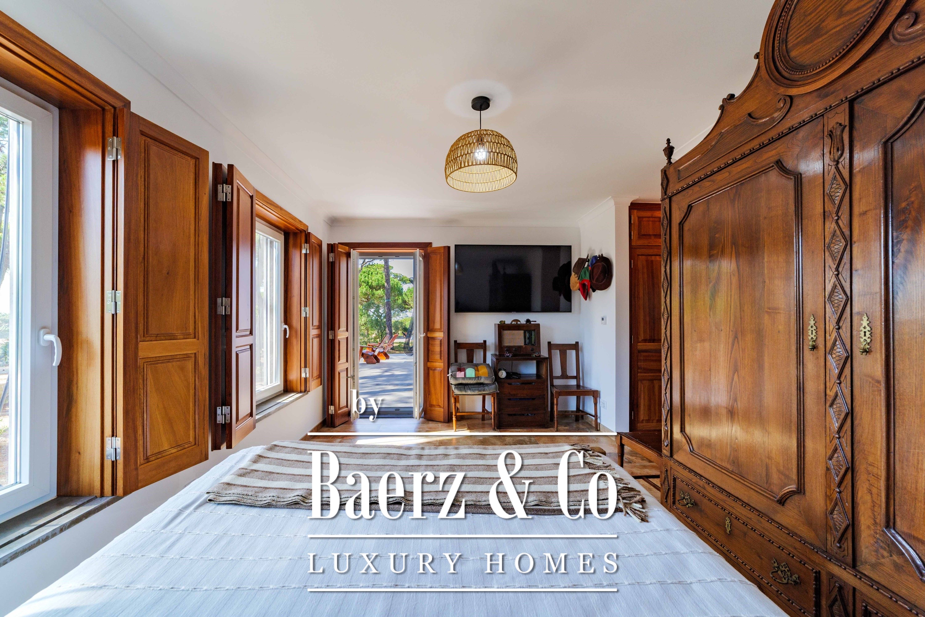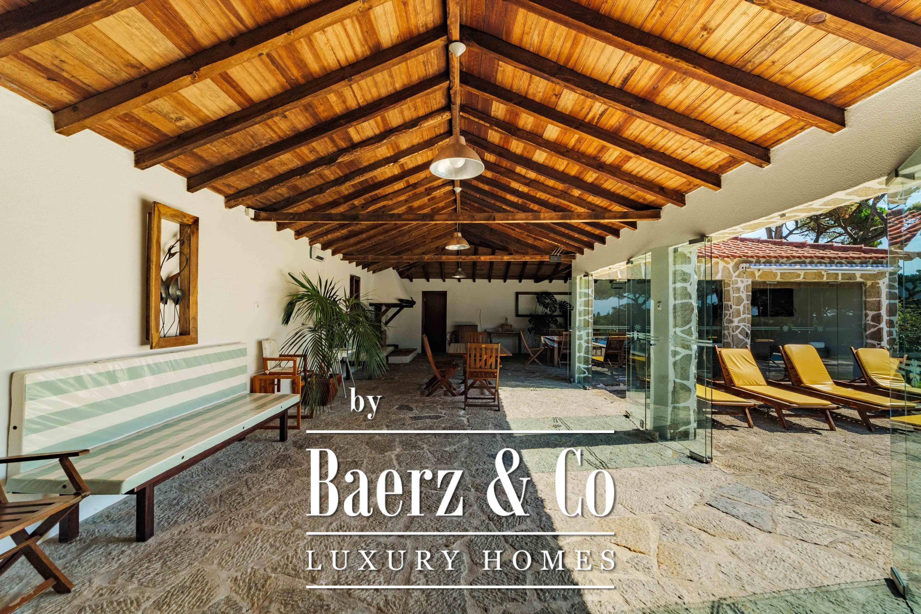 The main residence spans two stories and 302 m², completed in 2023 with a focus on authentic materials: exotic woods, fine stone, traditional clay tile roofing, and handmade wrought iron details. Sunlight from east to west fills harmoniously proportioned rooms—spacious living areas with a fireplace, a fully equipped kitchen opening onto the gardens, private suites, and terraces oriented toward serene views of the Sintra hills and the Atlantic.