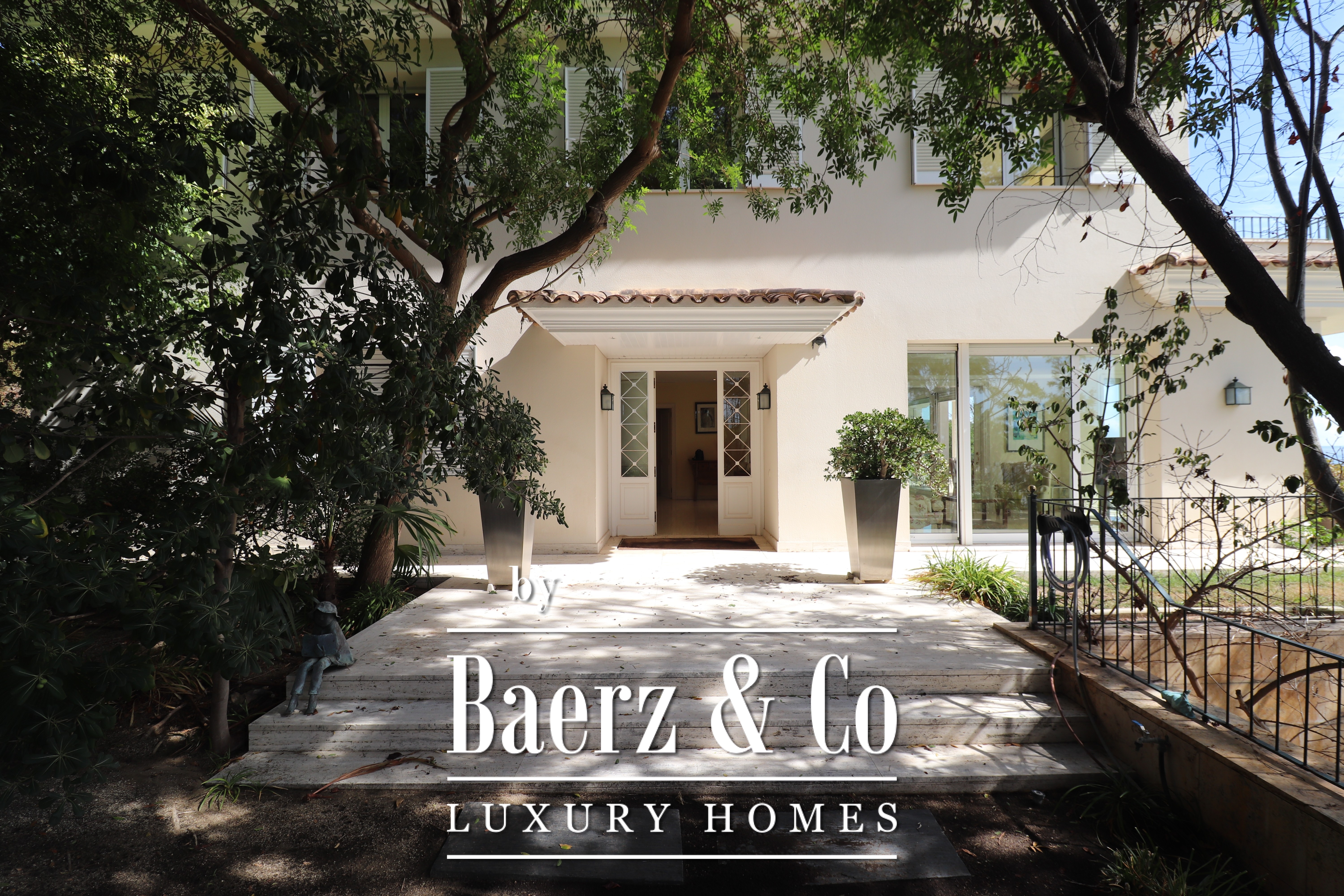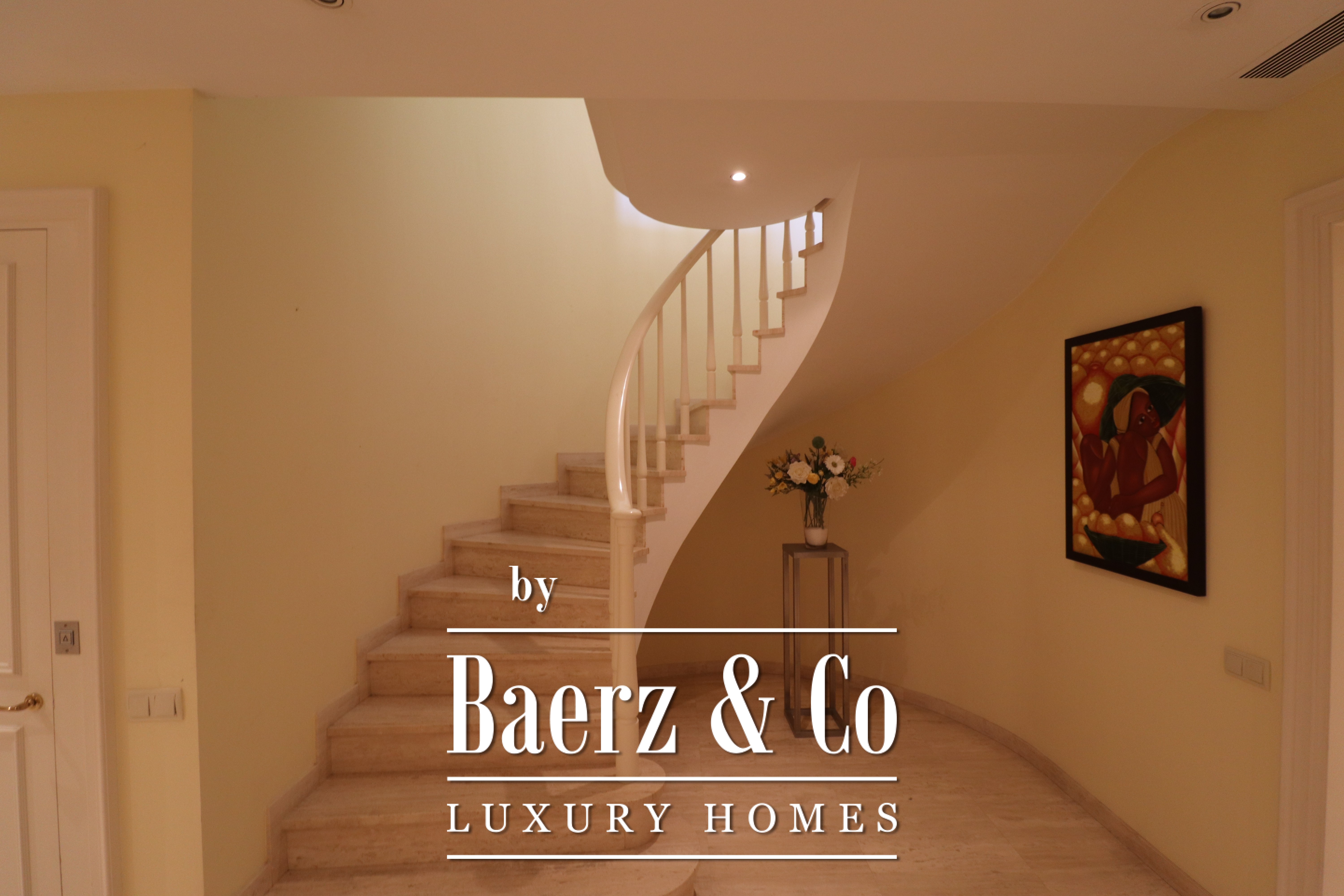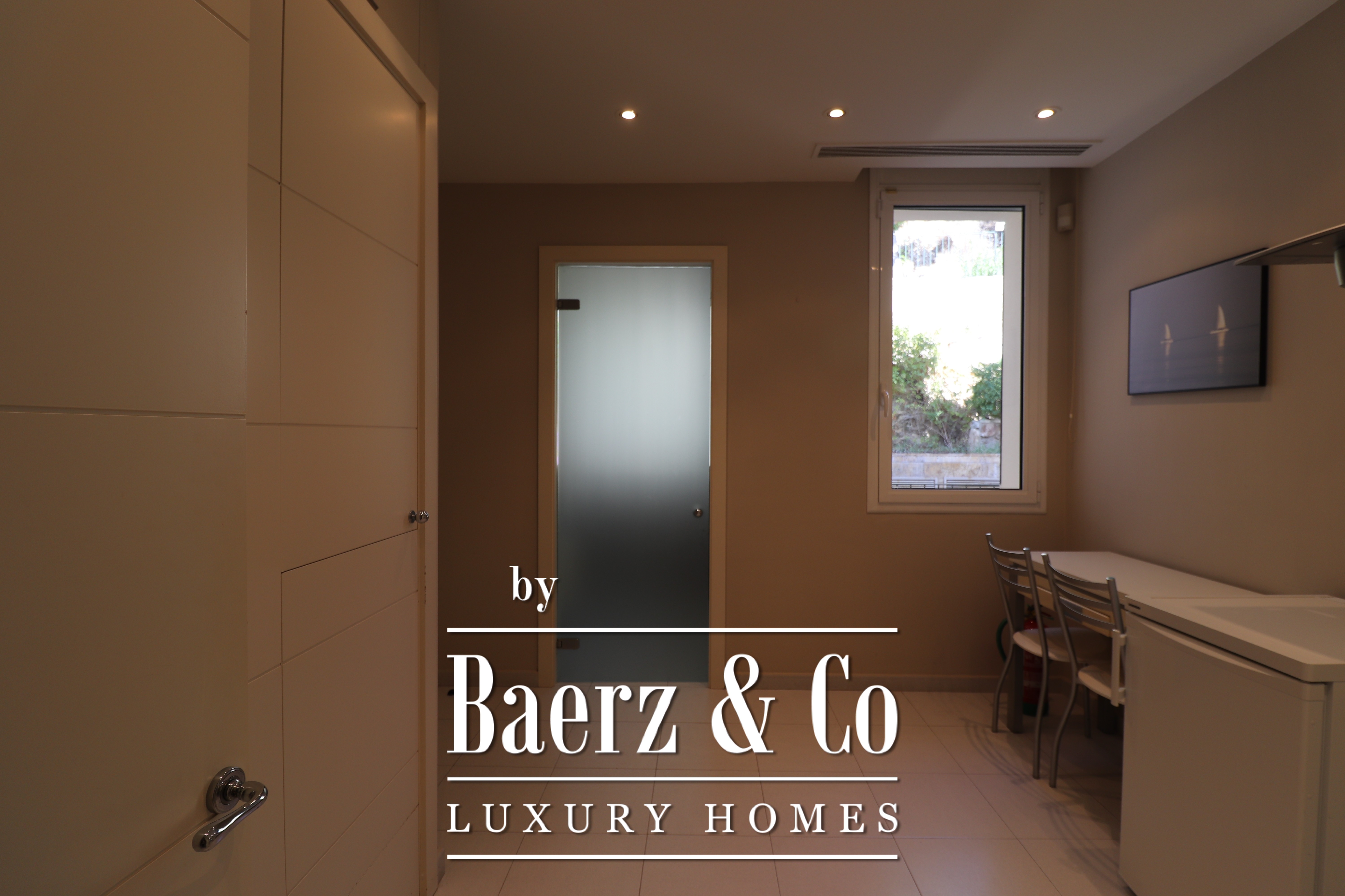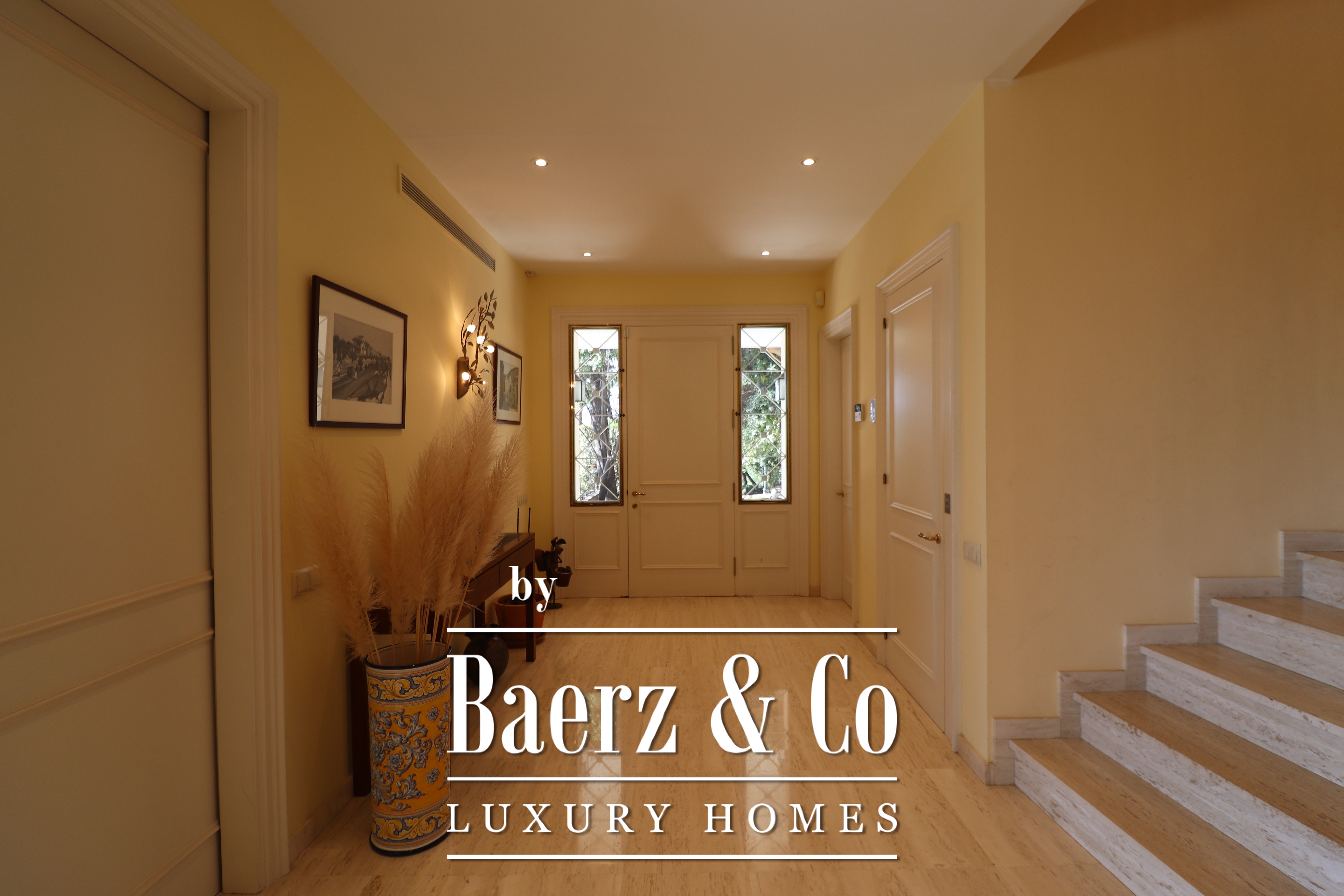 Designed for discretion and comfort, the villa unfolds across three levels, connected by a private lift. The main level opens with a refined entrance hall leading to a fluid living space, including living and dining rooms, a media zone, and a fully equipped kitchen with an adjoining service area and dedicated office. Five bedrooms and eight bathrooms allow for both family intimacy and entertaining on a generous scale.
