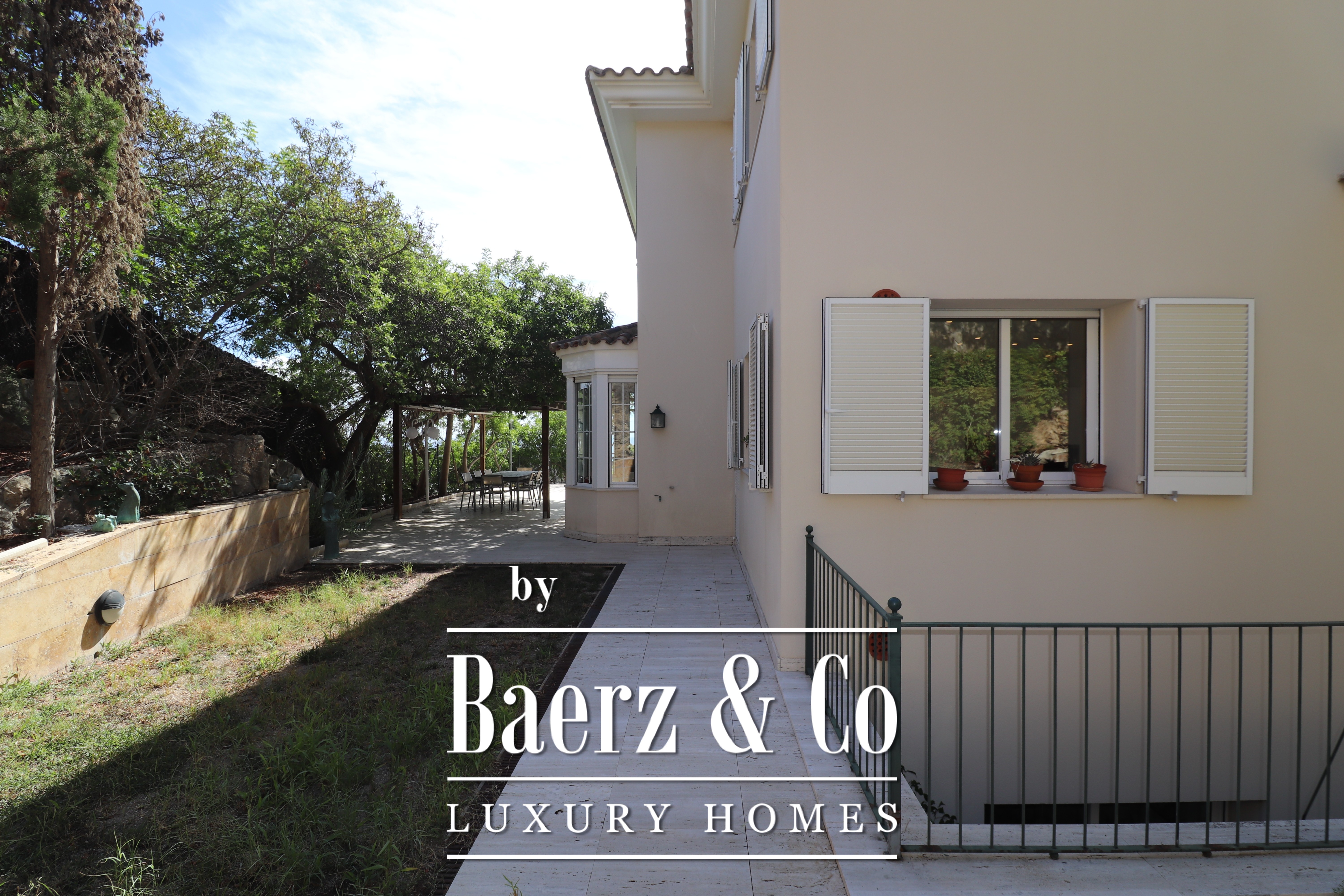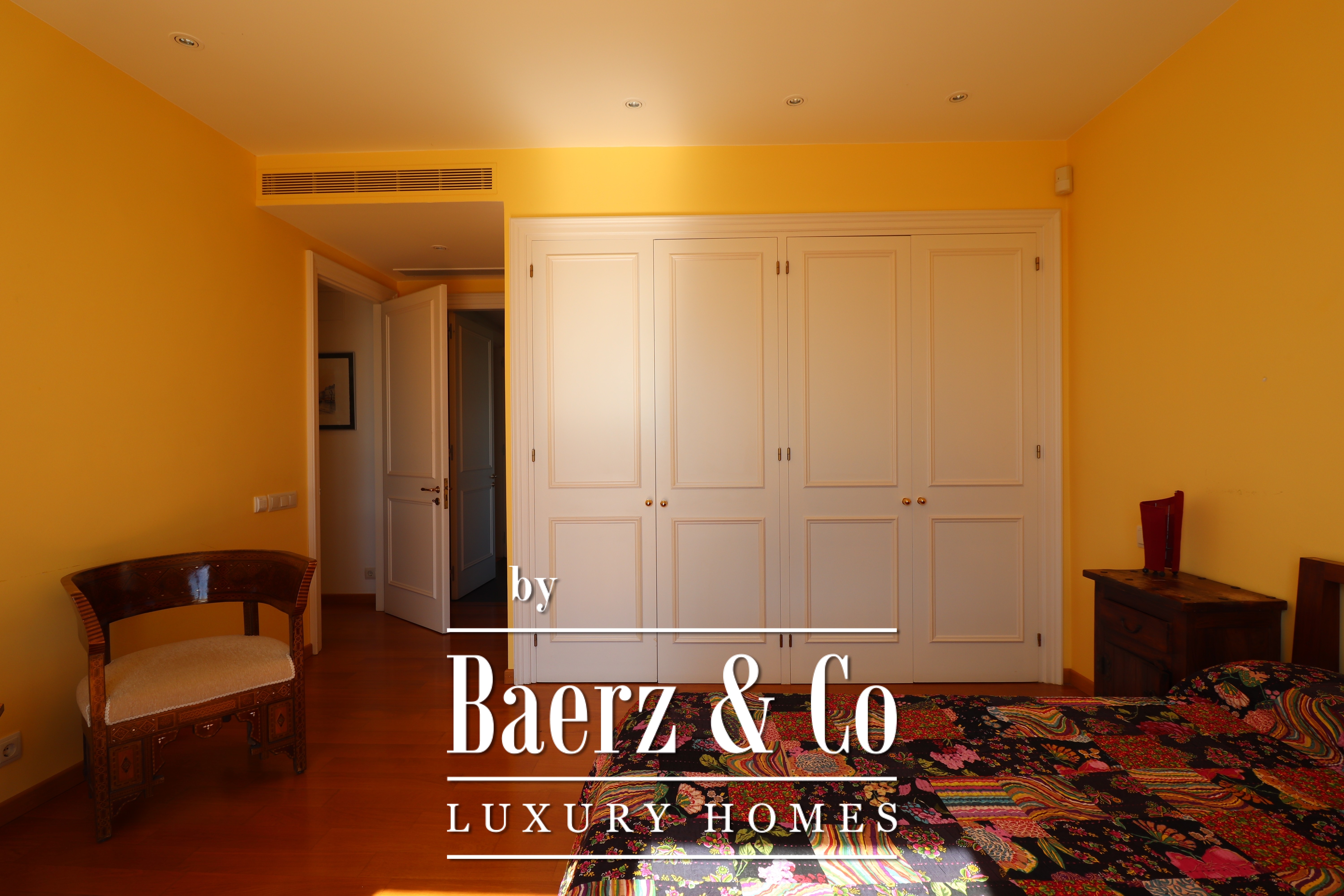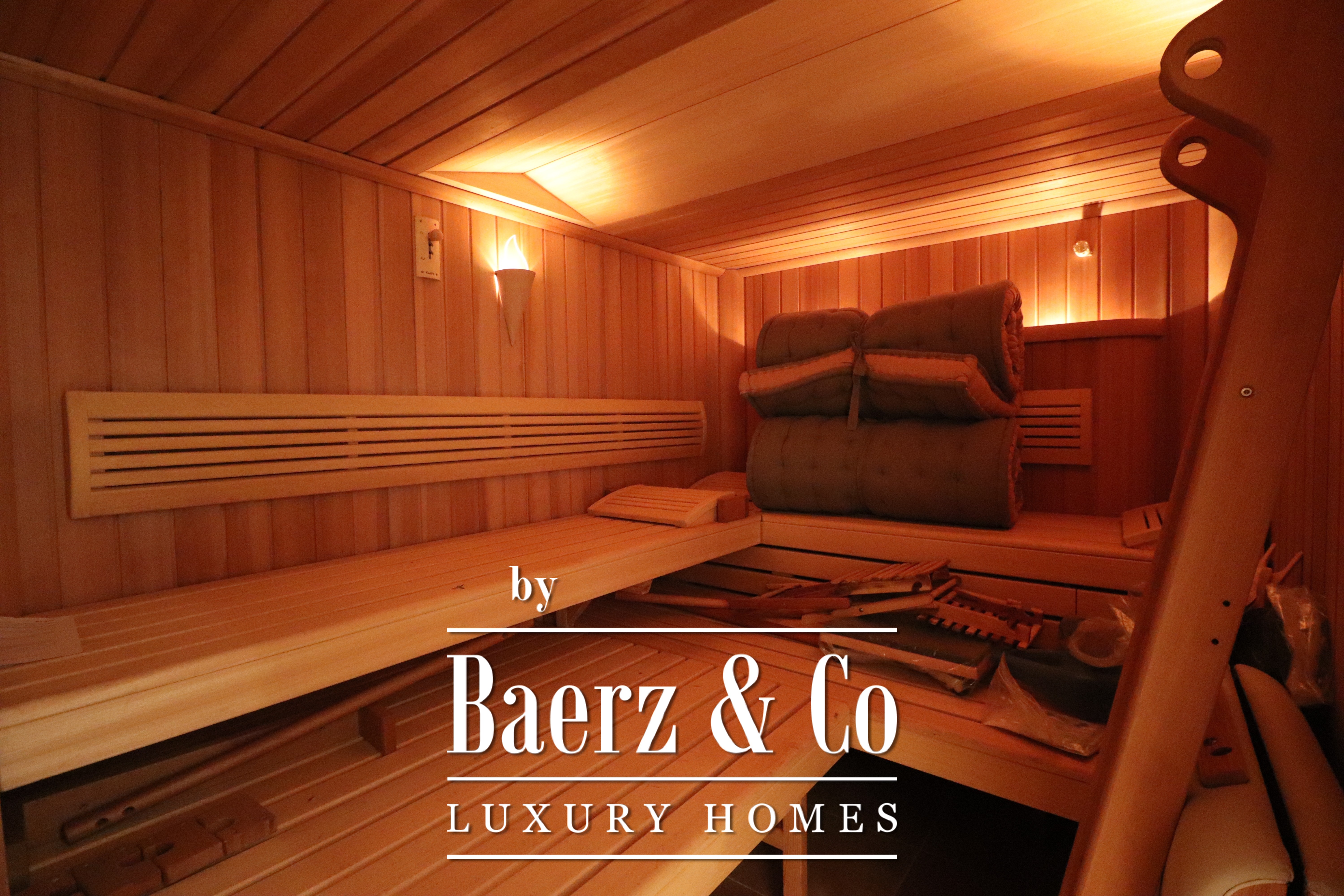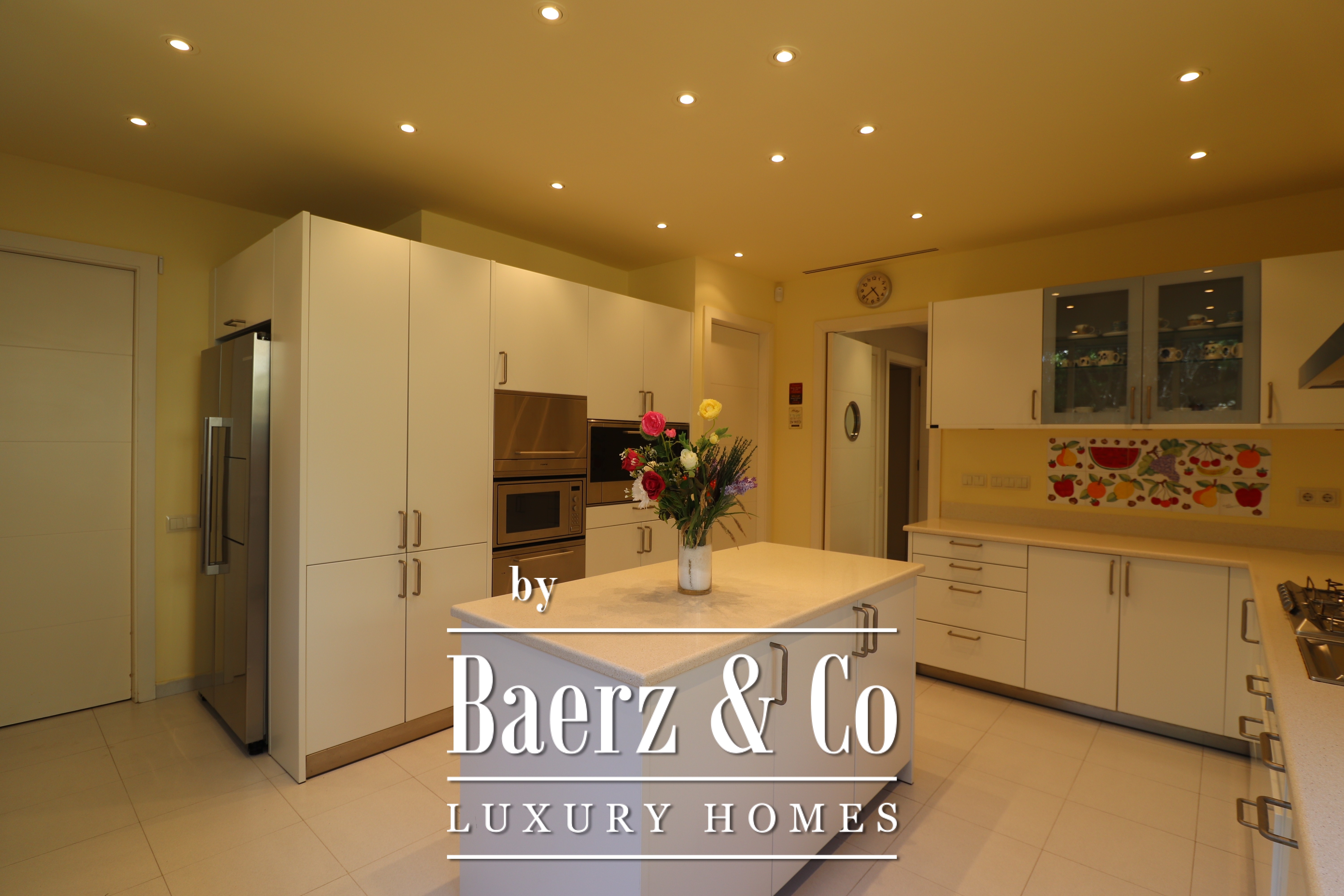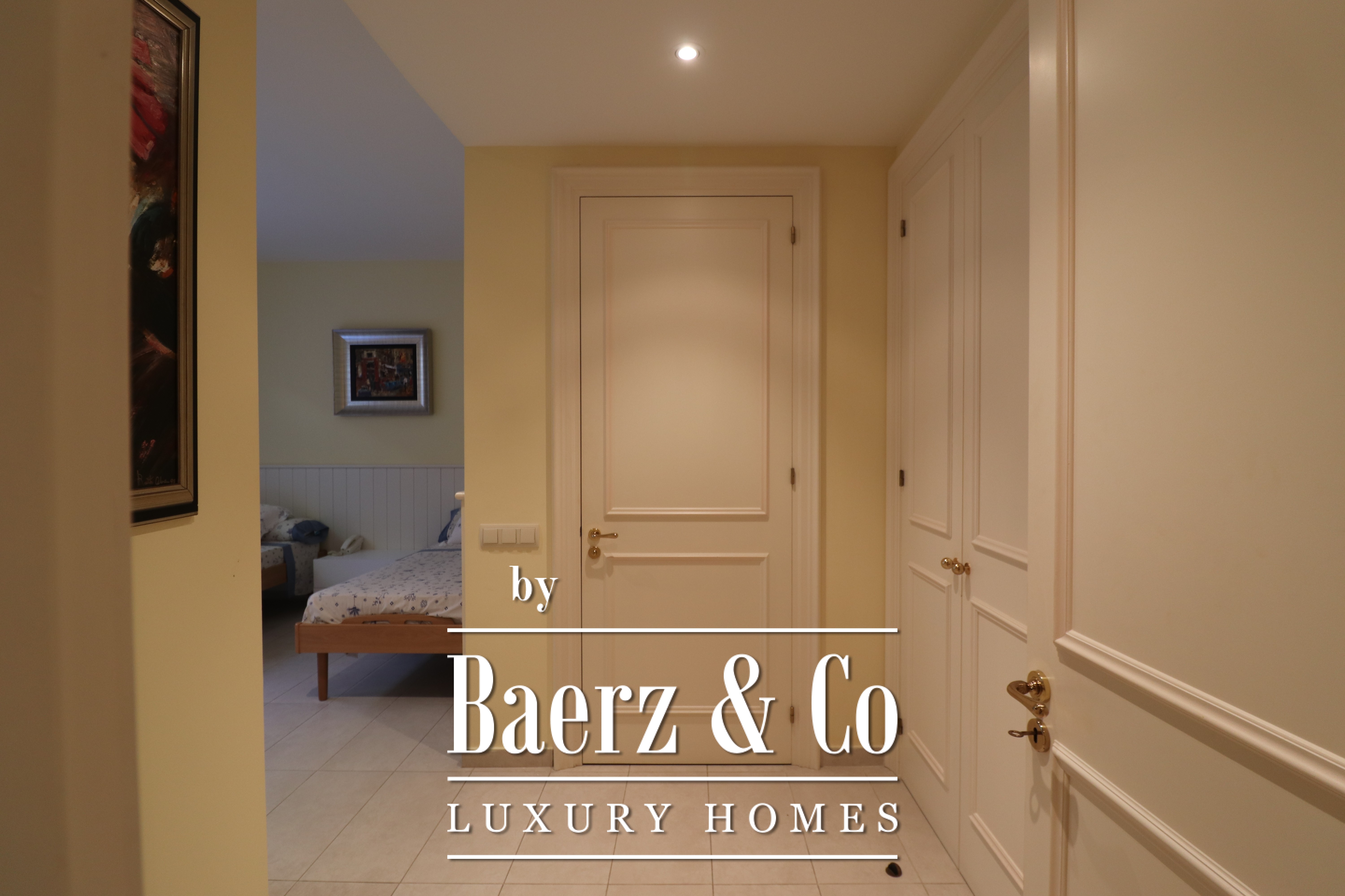 Designed for discretion and comfort, the villa unfolds across three levels, connected by a private lift. The main level opens with a refined entrance hall leading to a fluid living space, including living and dining rooms, a media zone, and a fully equipped kitchen with an adjoining service area and dedicated office. Five bedrooms and eight bathrooms allow for both family intimacy and entertaining on a generous scale.