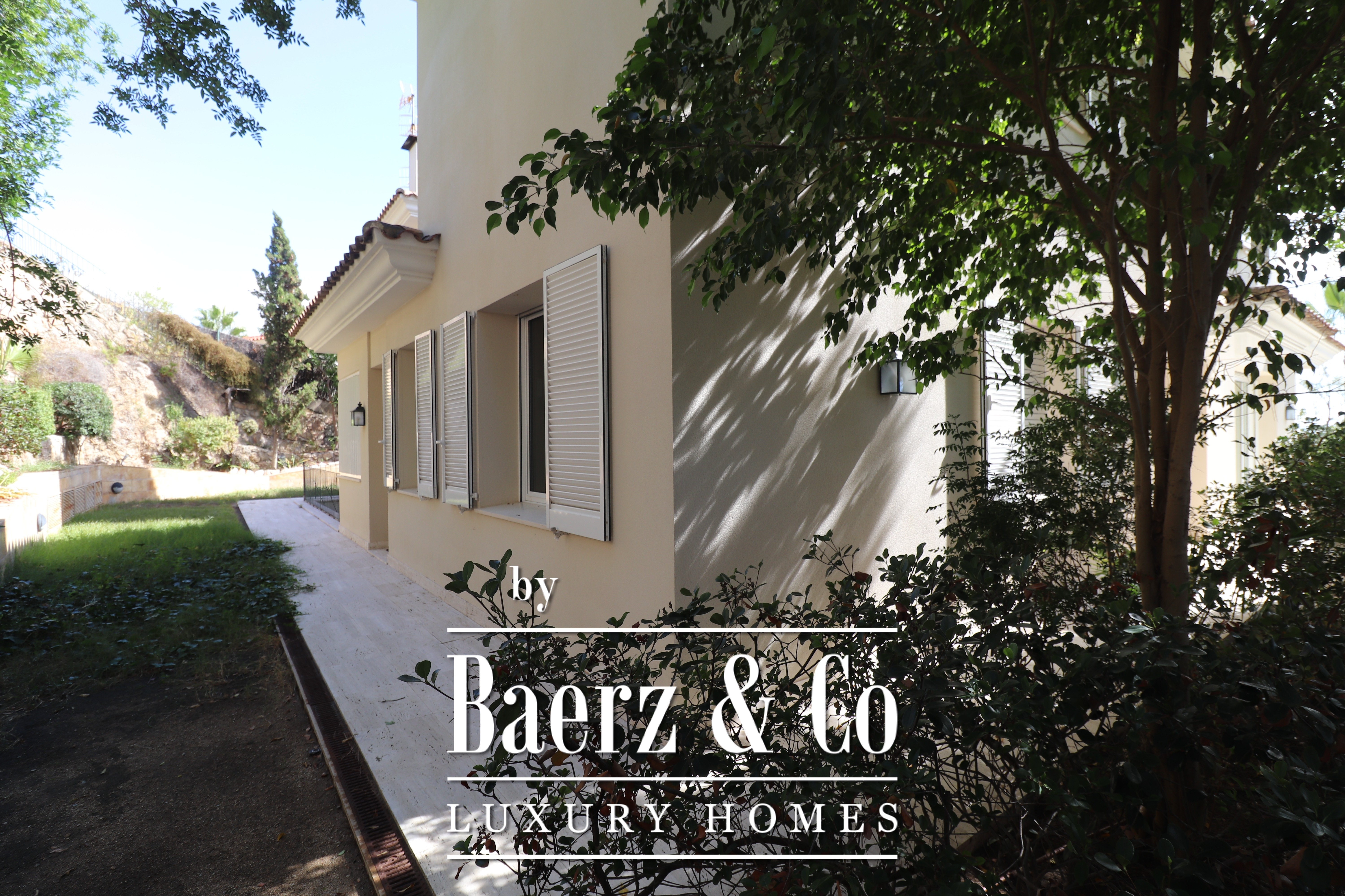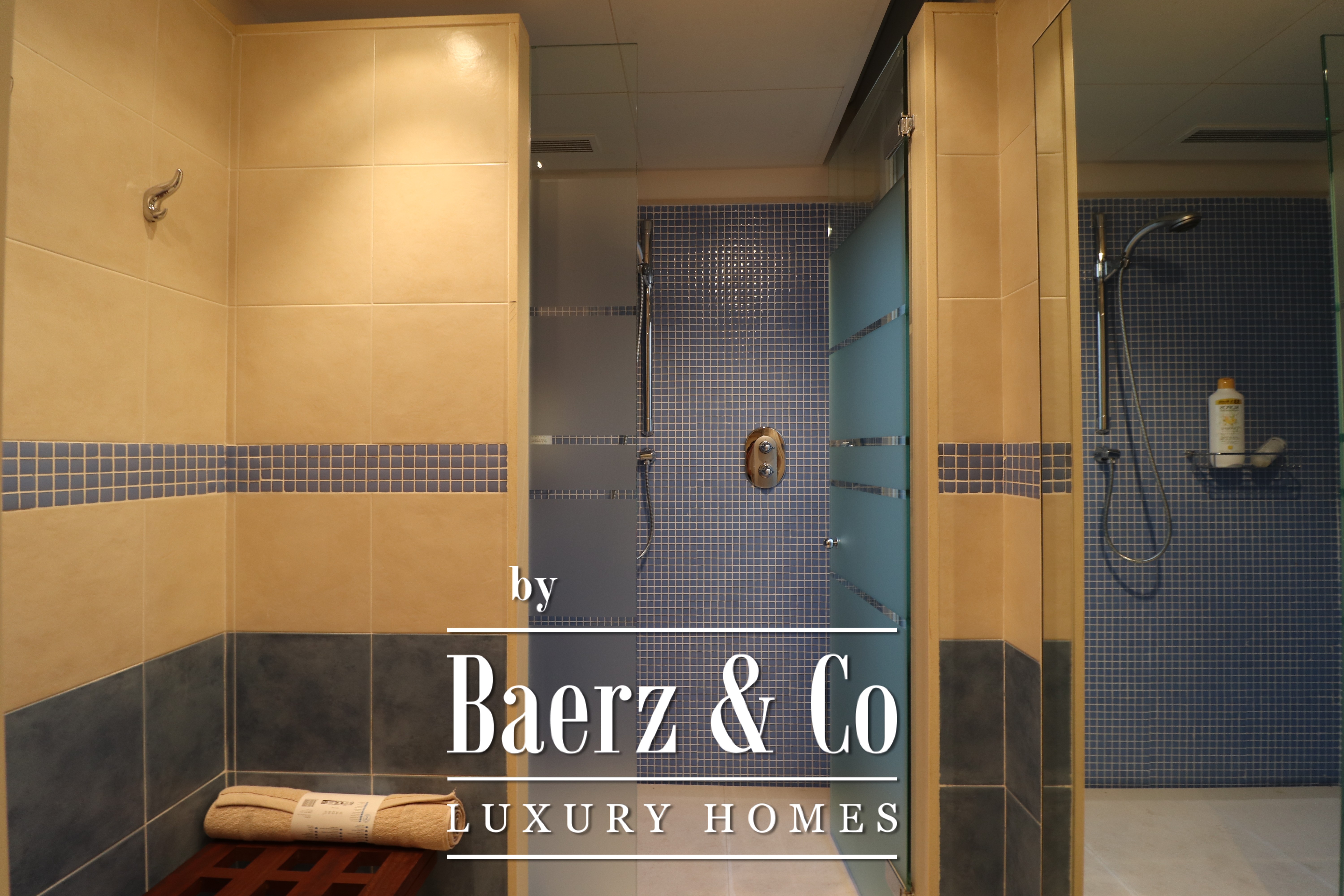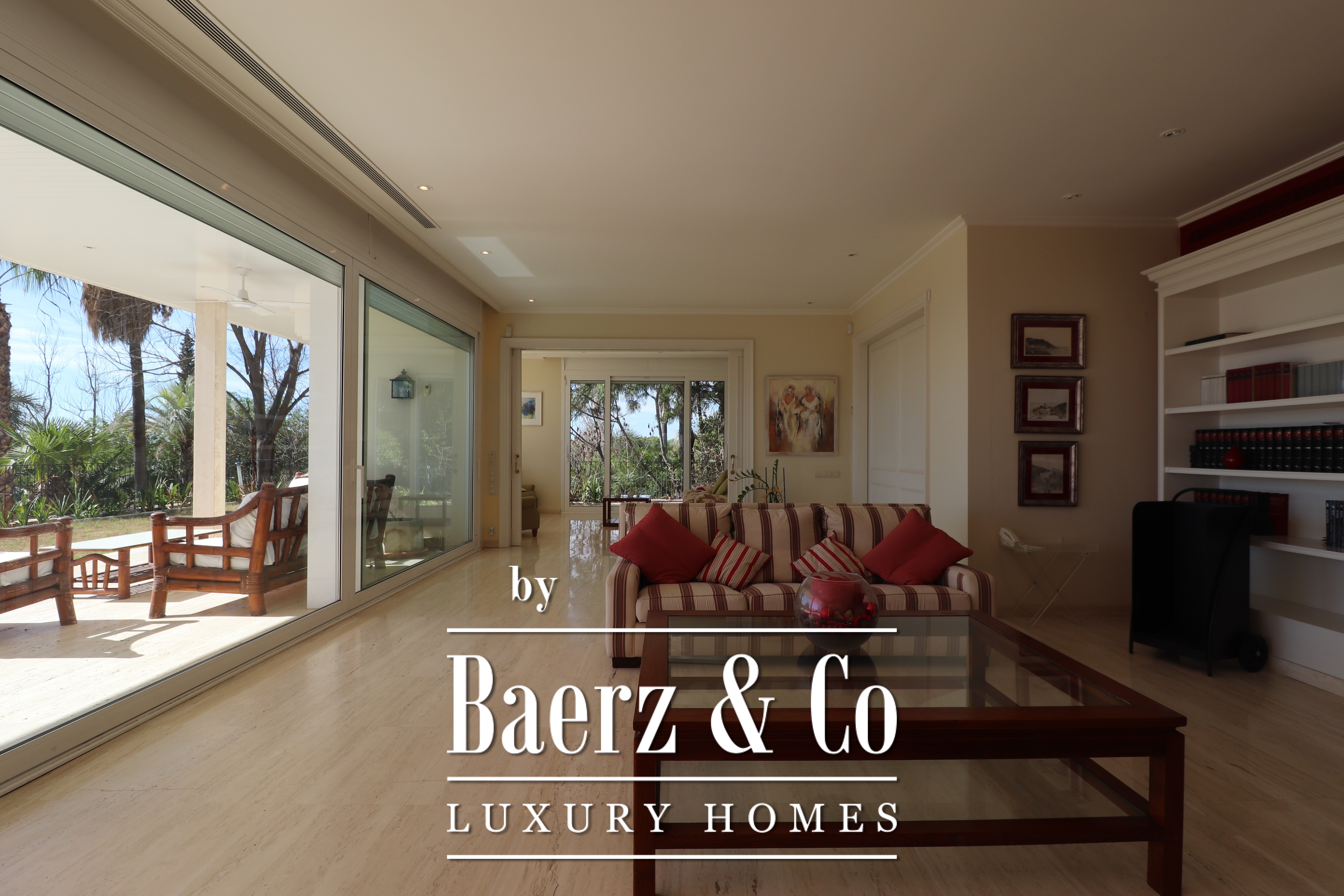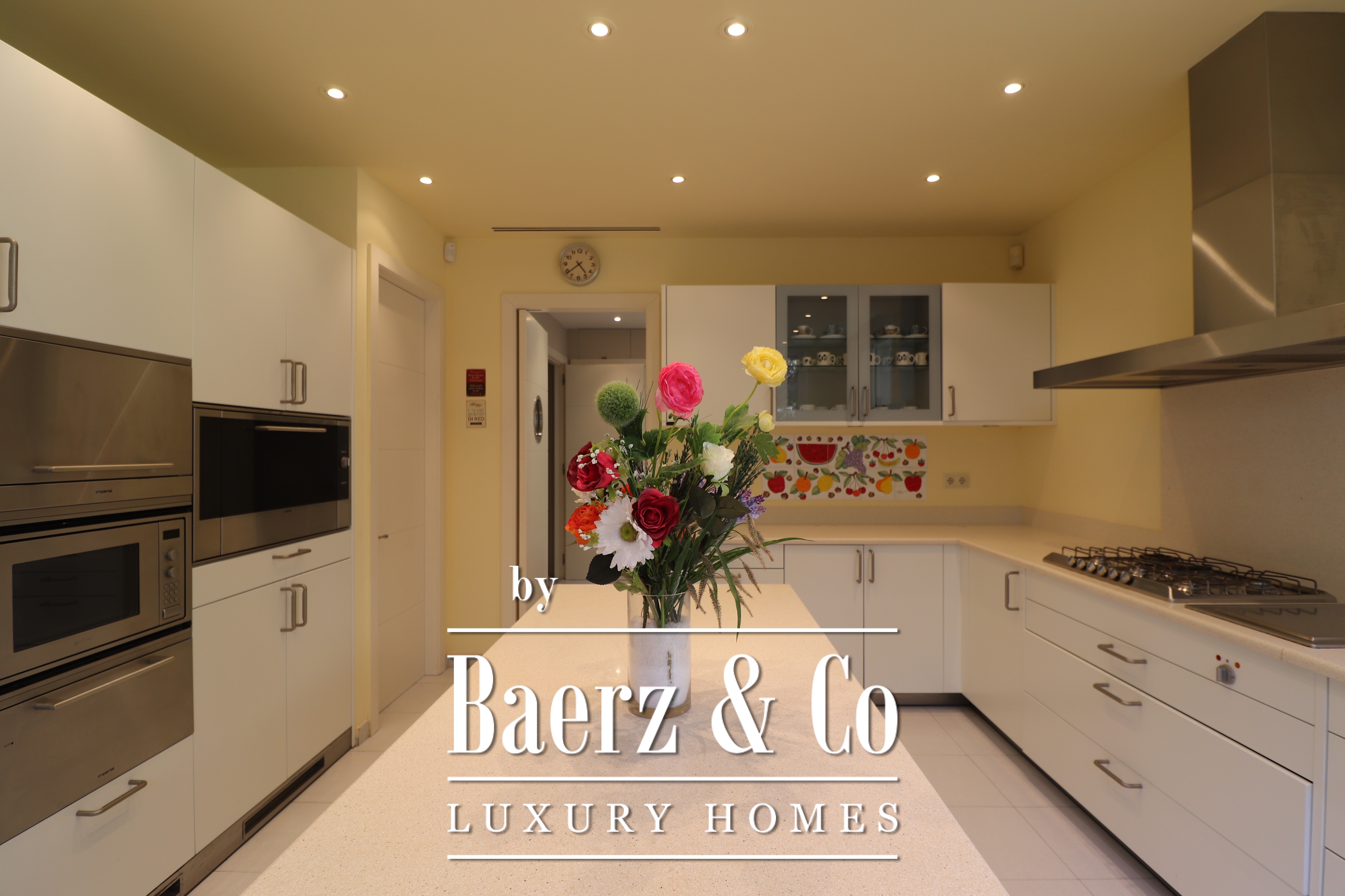Designed for discretion and comfort, the villa unfolds across three levels, connected by a private lift. The main level opens with a refined entrance hall leading to a fluid living space, including living and dining rooms, a media zone, and a fully equipped kitchen with an adjoining service area and dedicated office. Five bedrooms and eight bathrooms allow for both family intimacy and entertaining on a generous scale.