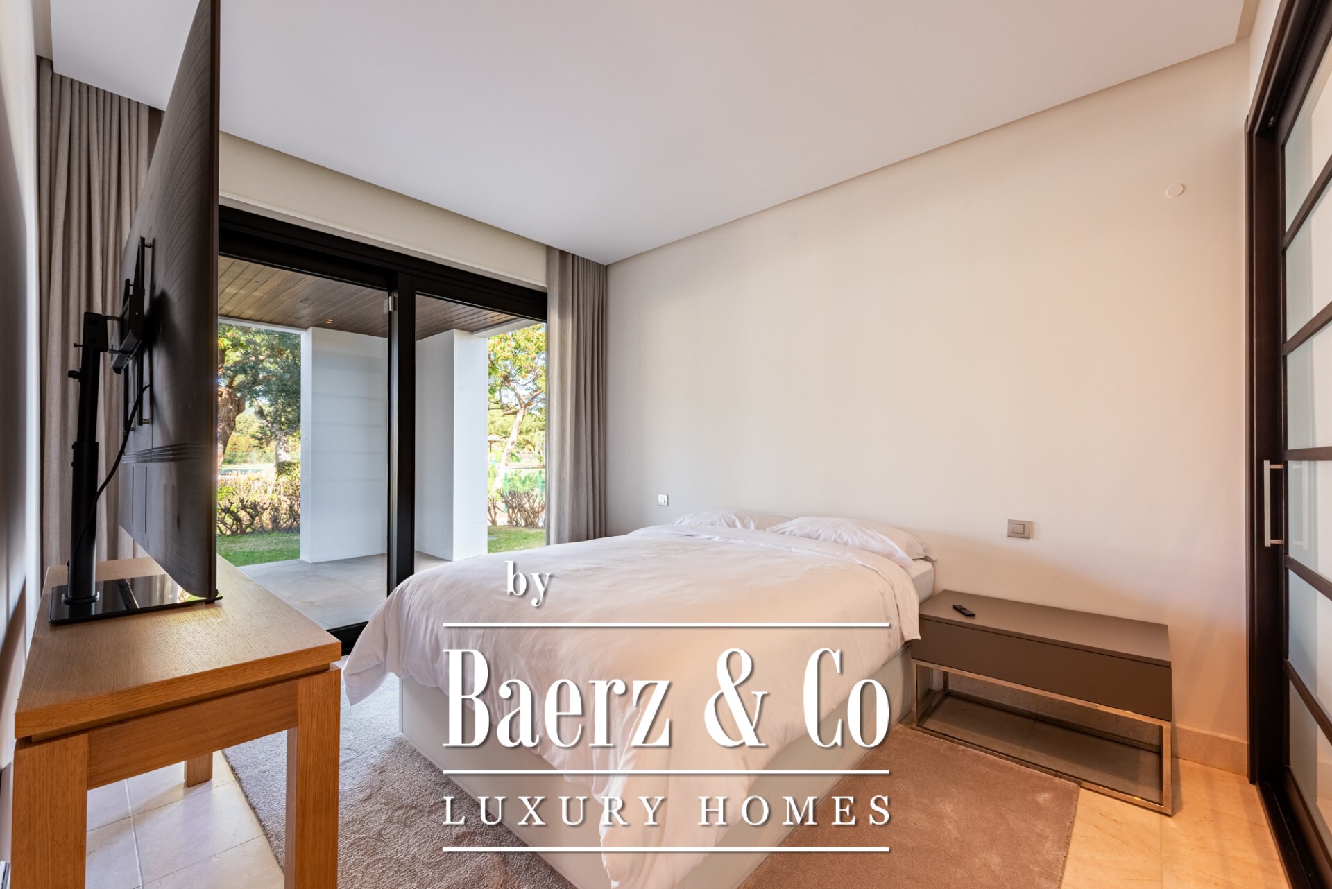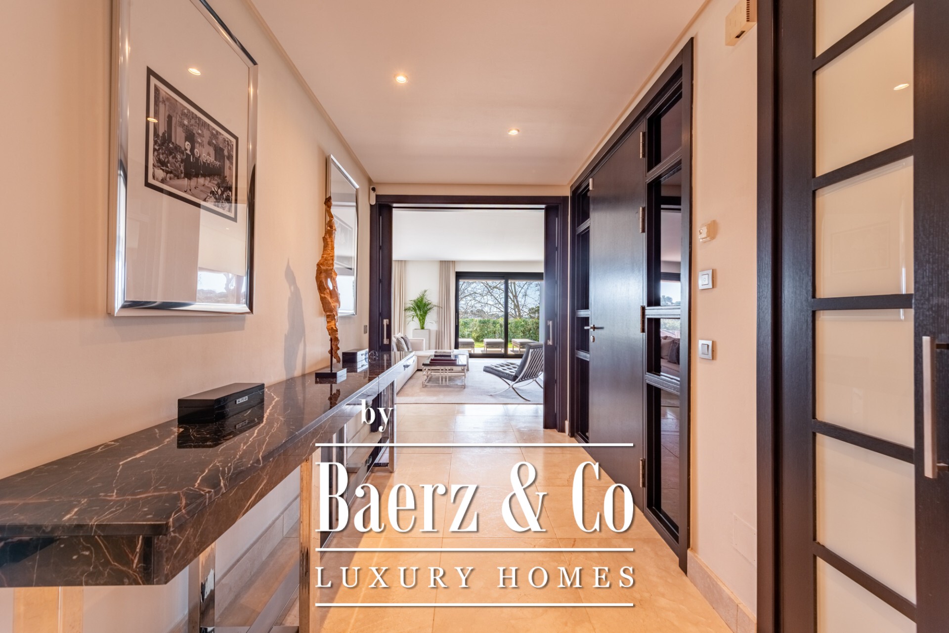 The residence measures 462 m² and spans a generous ground floor blueprint. Three well-proportioned bedrooms each hold en-suite bathrooms, while the living areas are defined by marble floors and south-east light. A home automation system, underfloor heating, and advanced security join air conditioning, fitted wardrobes and a fully appointed kitchen, ensuring comfort is as integral as design. Direct garden access flows from the main rooms, extending the living experience outdoors across 97 m² of private terrace and garden space.