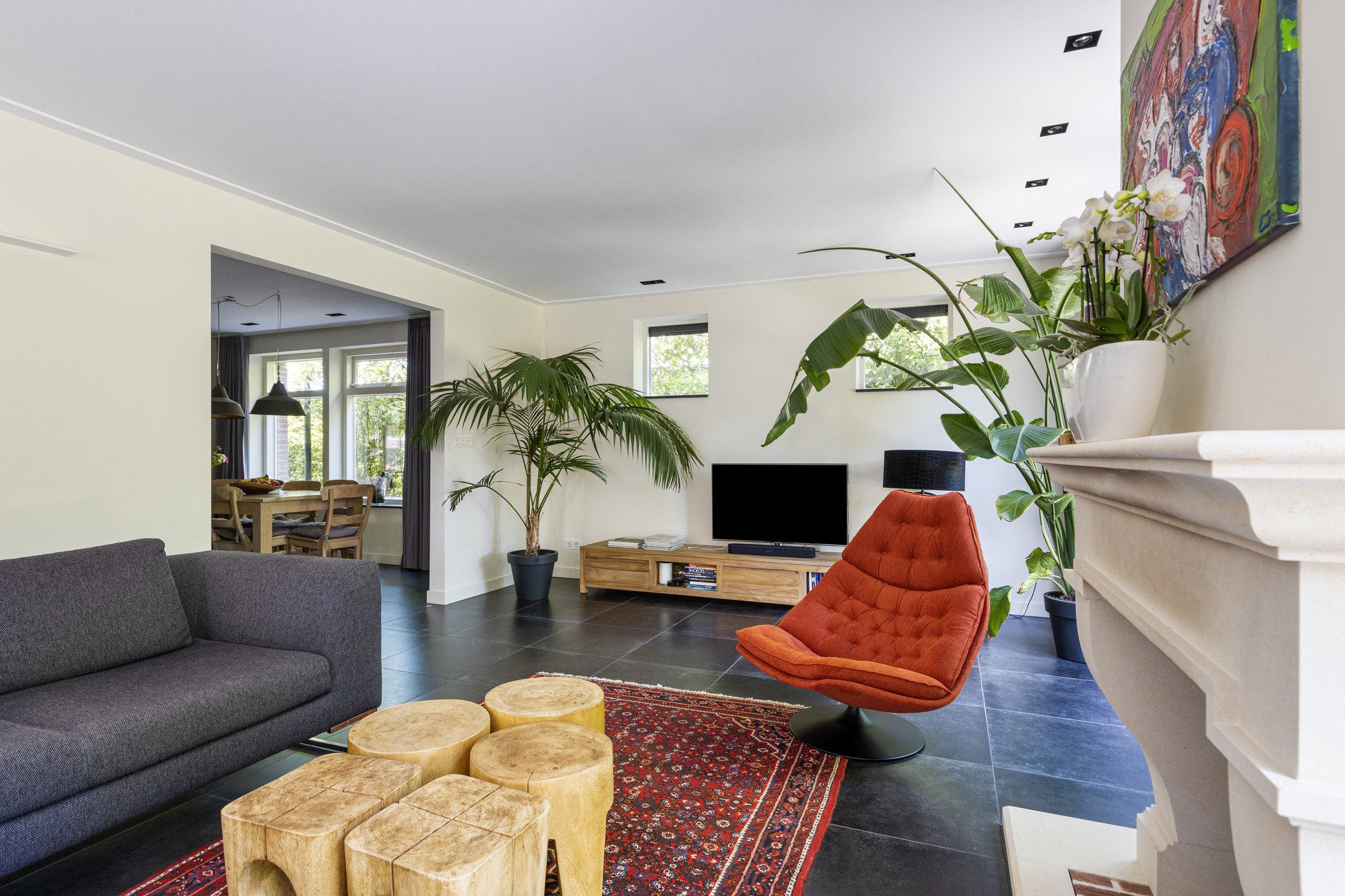 sfeervolle woonkamer voorzien van een gashaard (mogelijkheid voor een houtkachel), wandafwerking stucwerk, tegelvloer, plafond afgewerkt met stucwerk vv. inbouwspots, 2-tal tuindeuren naar tuin/terras;