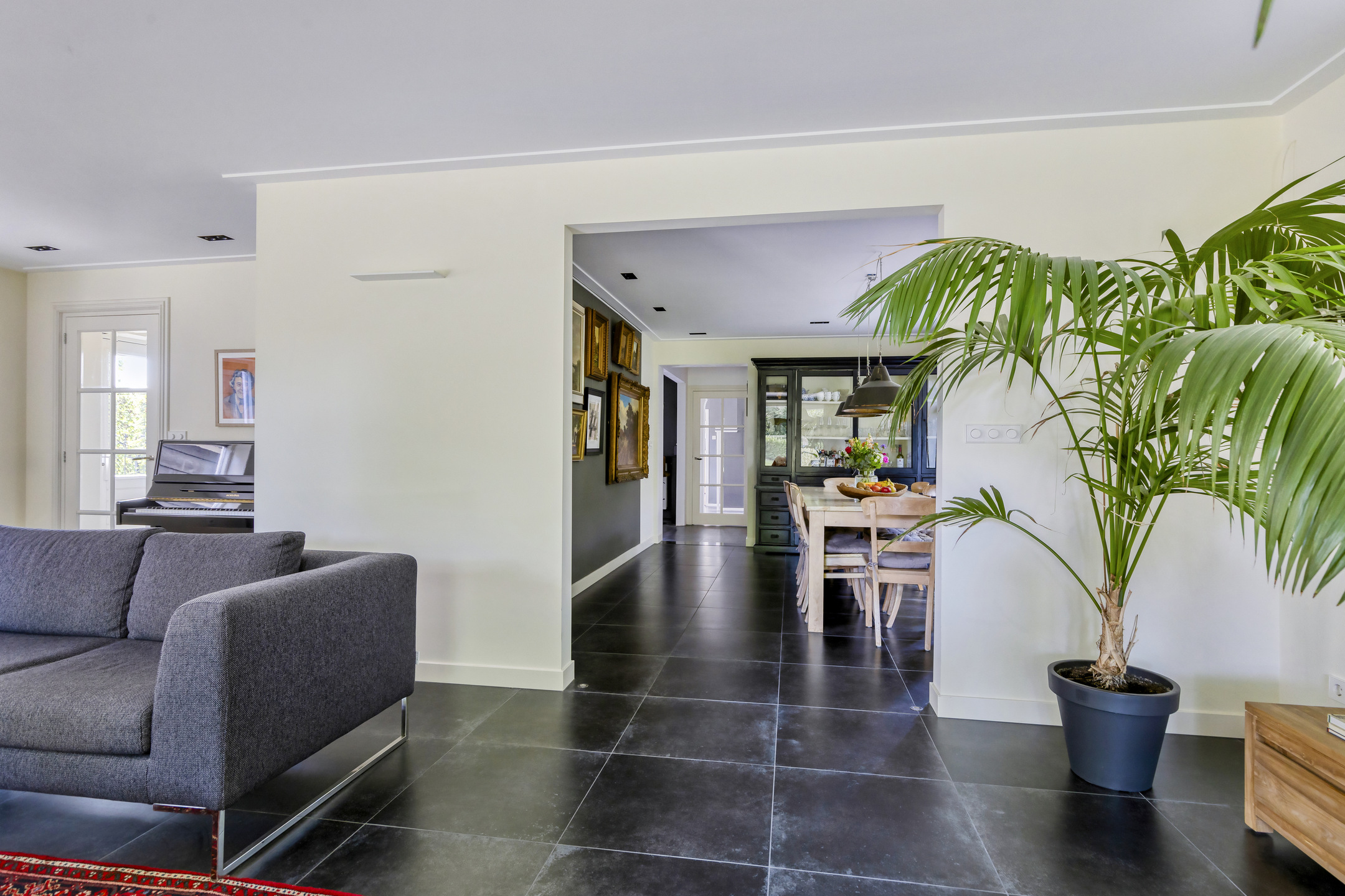 tussenhal, wandafwerking stucwerk, tegelvloer, plafond afgewerkt met stucwerk;