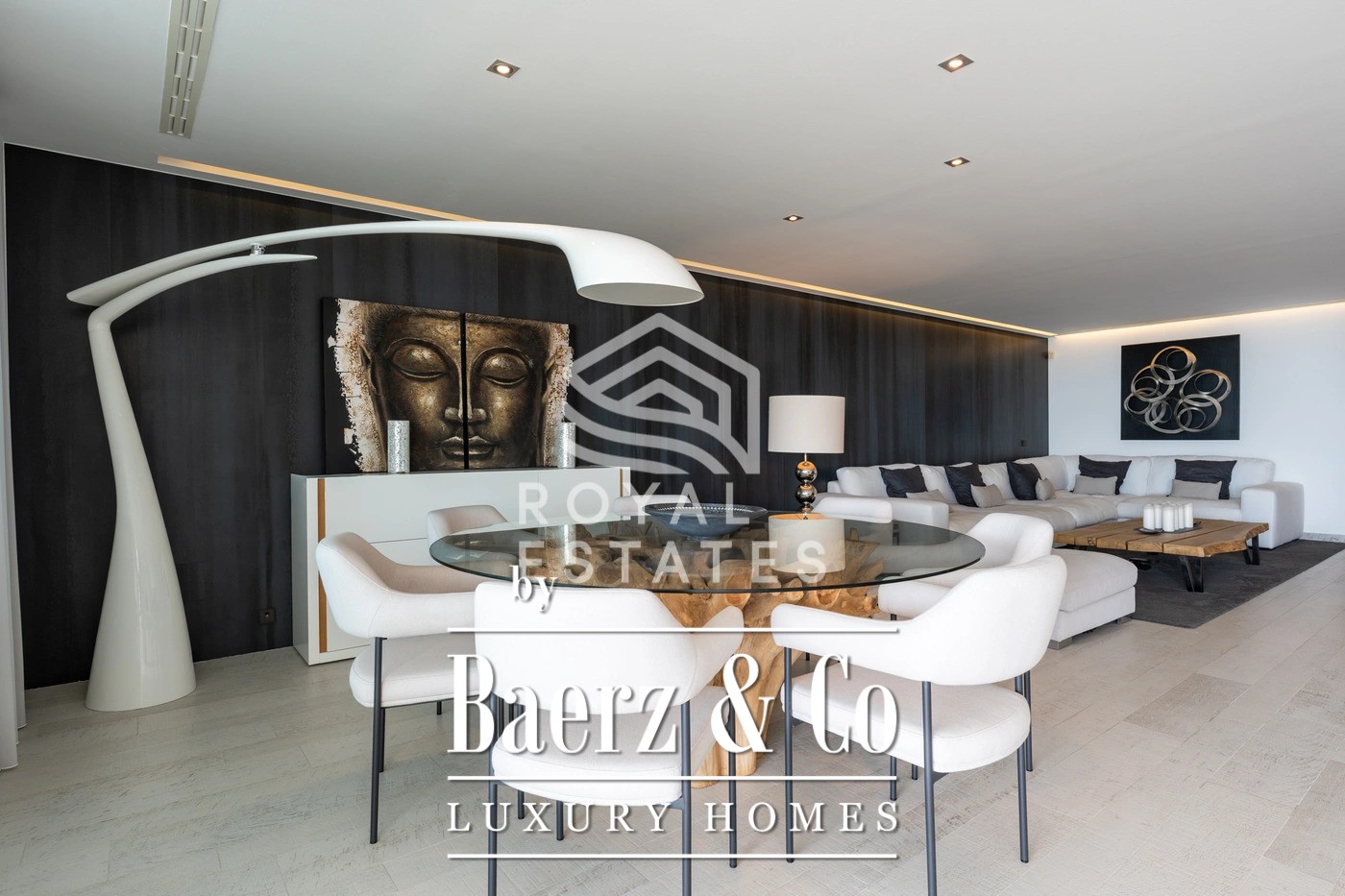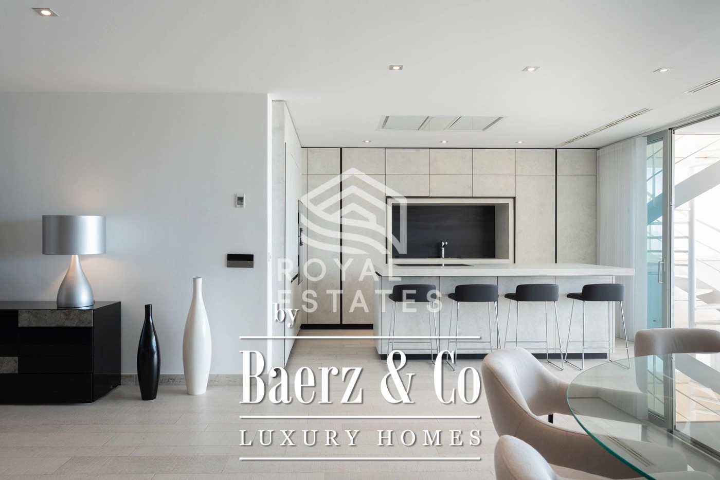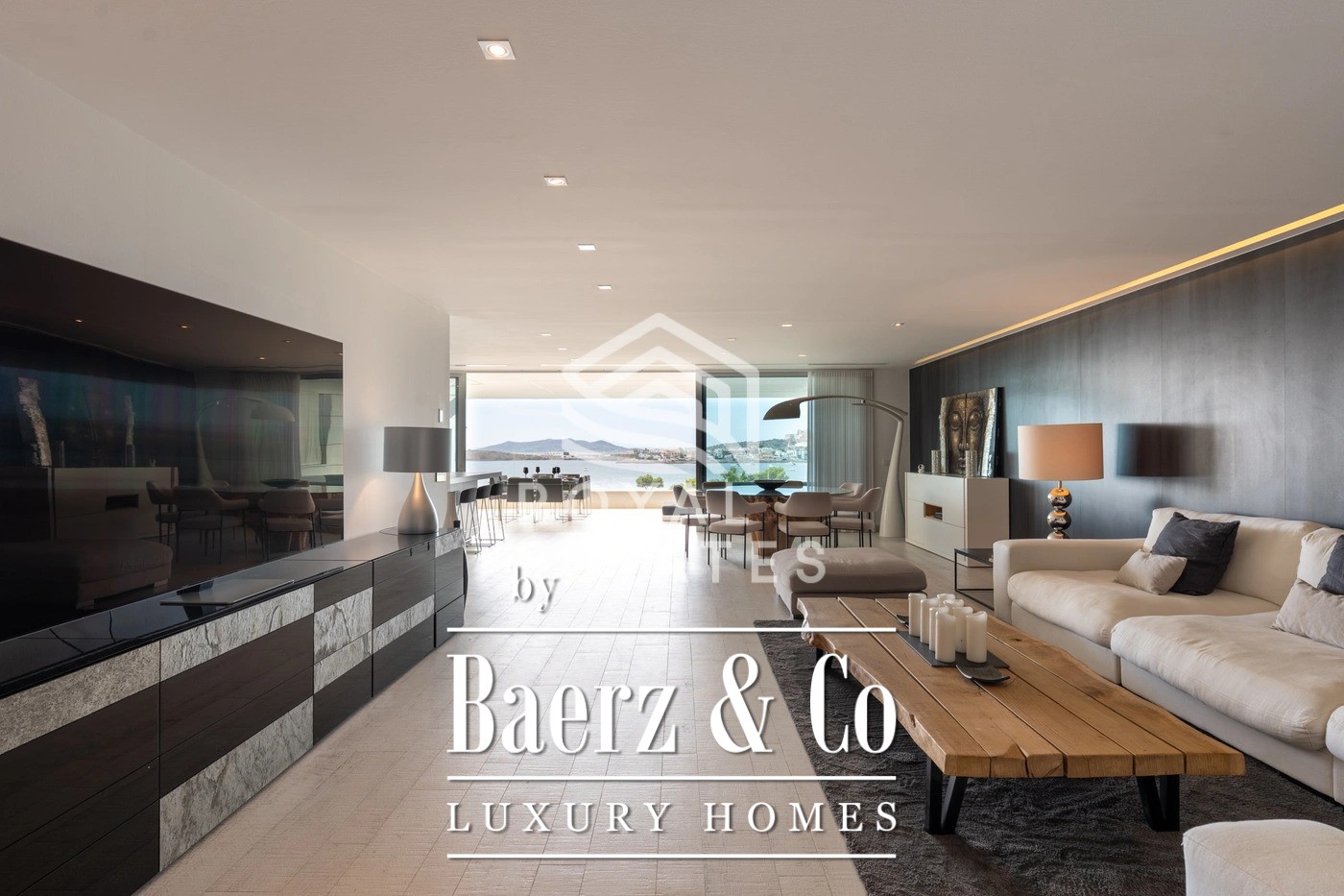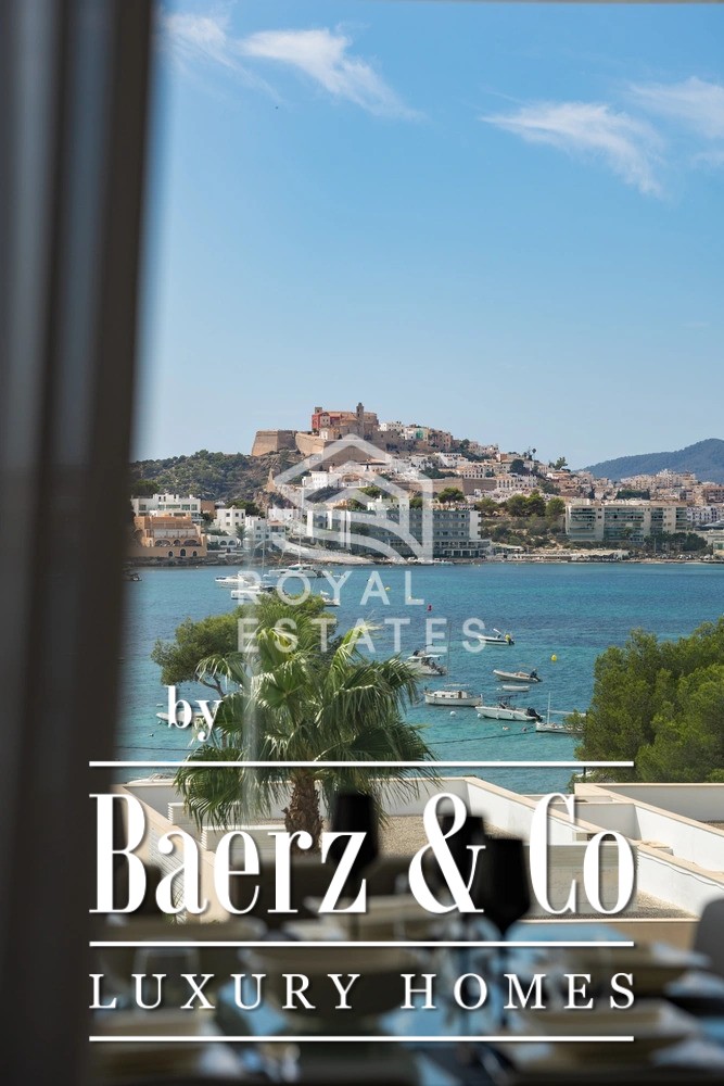 This duplex penthouse Talamanca is positioned within the secure Es Pouet enclave, one of the island’s most sought-after addresses. Occupying approximately 429 m², including 347 m² of interior space, the residence exemplifies refined living framed by the uninterrupted vistas of the Mediterranean Sea and Ibiza’s historic Dalt Vila. Floor-to-ceiling windows illuminate the open-plan living and dining areas, connecting seamlessly to a broad terrace that invites the interplay of island light and sea air.