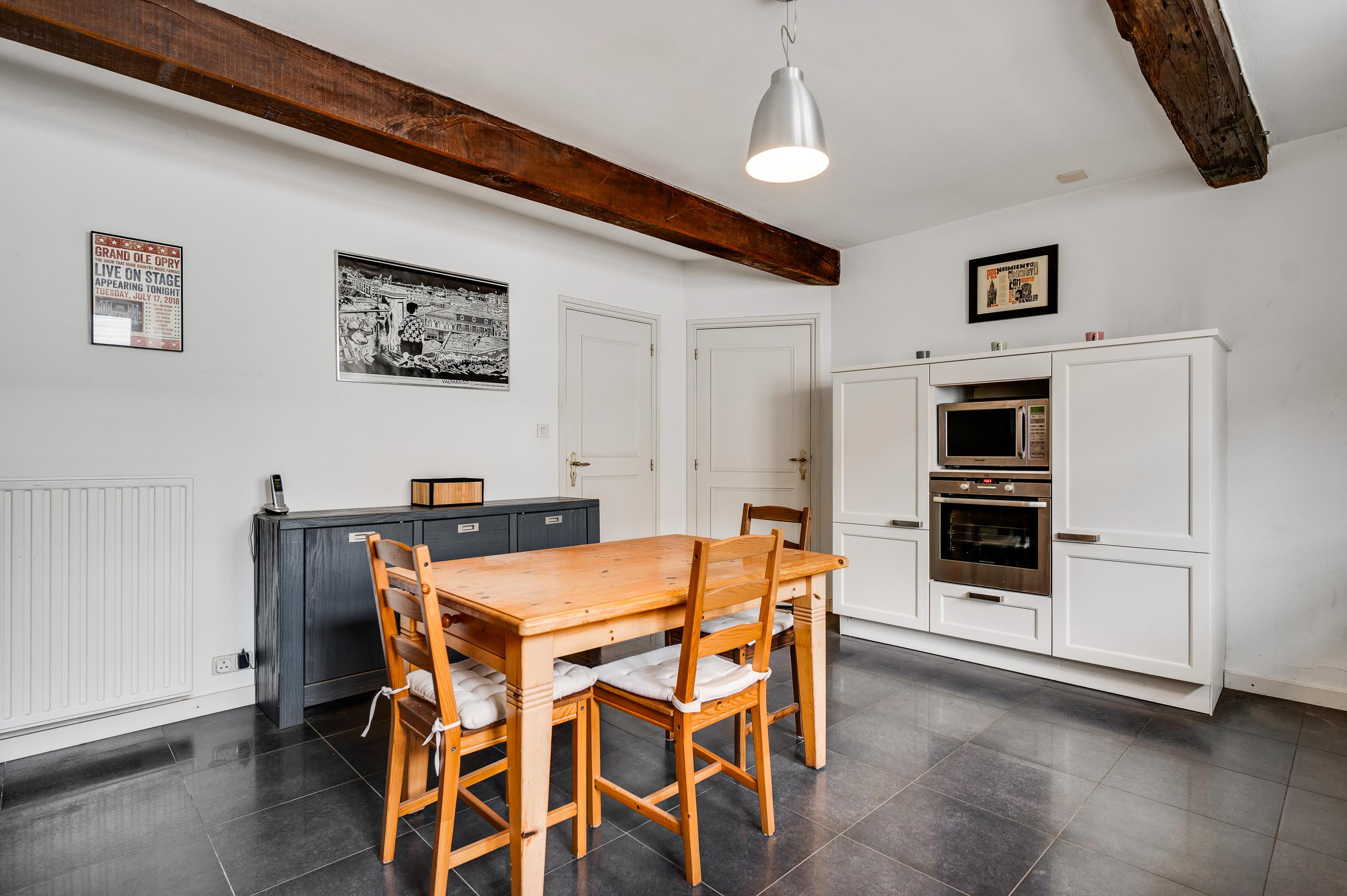 The spacious and bright living room (approx. 56 m²) offers excellent access to the garden thanks to large windows at the side and double doors at the rear. The living room is divided into a cozy sitting area with a fireplace and a separate dining area, ideal for dinners with family and friends. The modern floor tiles and sleek plastered walls give the space a timeless look.