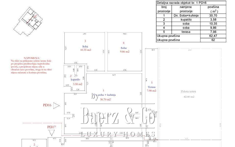 Structure of the apartment: hallway , living room with kitchen and dining table, 2 bedrooms, a bathroom, a terrace and a green terrace. The apartment itself has 62m2, while its green terrace has 42m2. It has a sea view and the view of the mountains that surround it. It is fully furnished and ready for moving in.