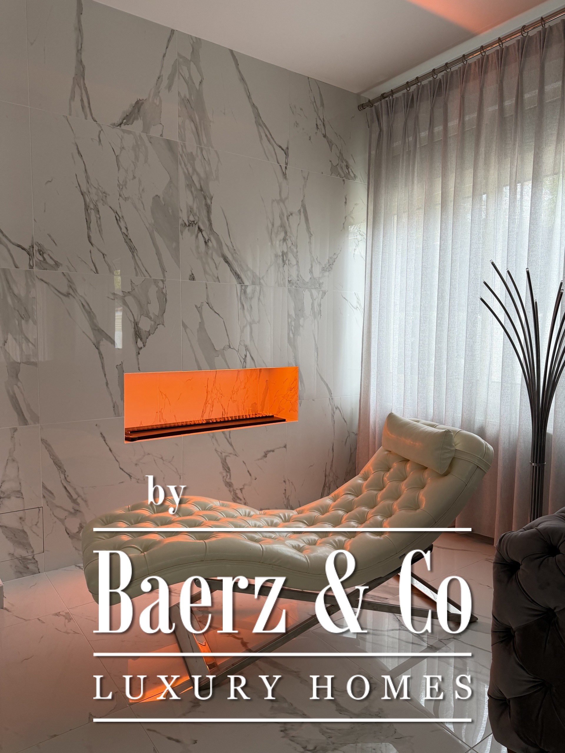 The fully furnished villa spans three levels with a 214 m² internal area on a 463 m² plot. Renovated in 2024, its five-bedroom layout includes five bathrooms and a guest WC. Four bedrooms reside on the second floor while the expansive master suite, complete with en-suite bathroom and a private storage room, occupies the top level. The kitchen faces the landscaped garden, complementing a separate dining area and a cozy living room anchored by a steam fireplace. Materials are elegantly matched with tiles, marble, and laminate throughout.