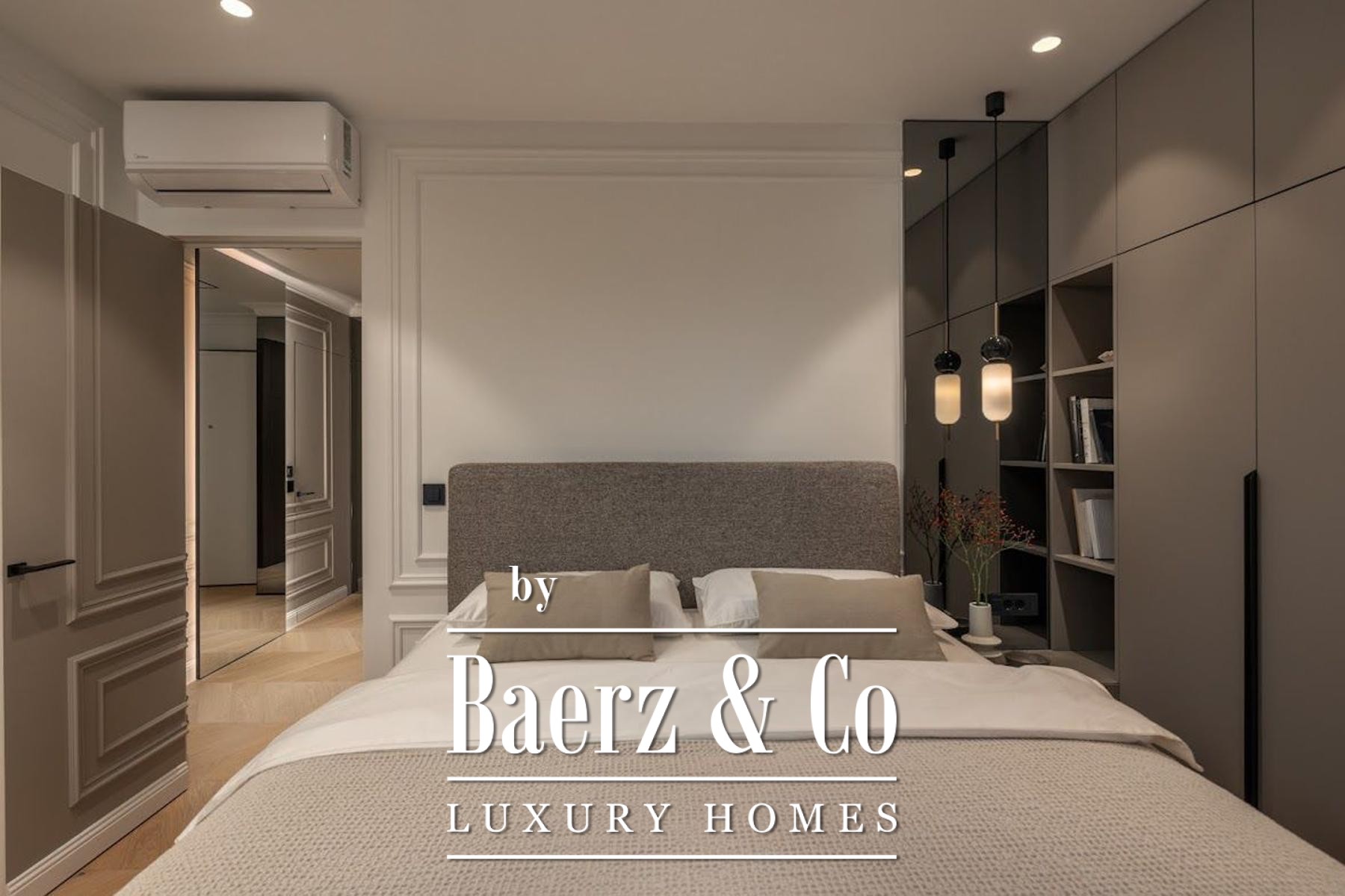 From the direct elevator entry connecting the underground garage to the private entrance, the penthouse signals rare intimacy and discretion. The residence features five bedrooms and five bathrooms, each with custom sanitary installations and underfloor heating. The living spaces are enveloped in light, with elegant Chevron Boen parquet, aluminum joinery, triple-glazed windows, and integrated LED illumination imparting a refined, welcoming ambiance.